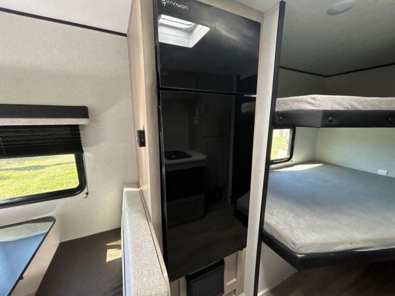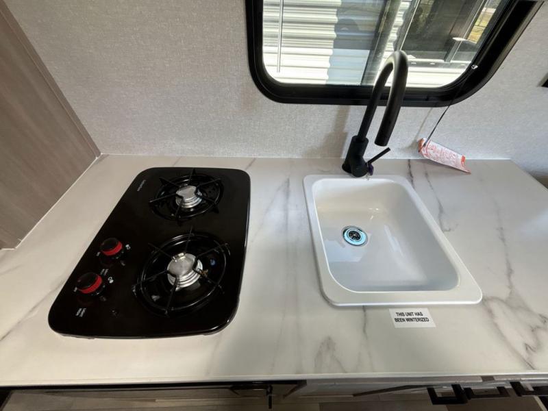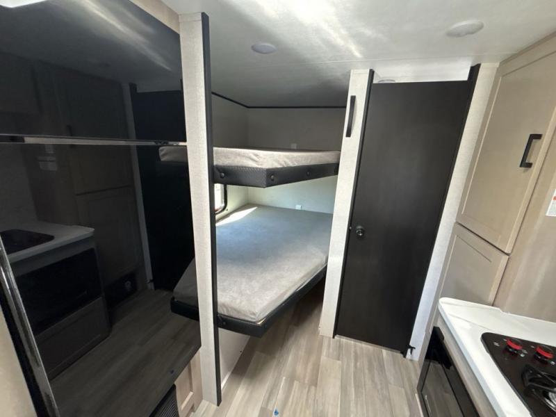 Camping trips are made easy in this Lynx Edition travel trailer with double-size bunk beds for guests or little ones. You'll find a front walk-around queen bed for a great night's rest, along with dual bedside wardrobes to keep your things tidy. The rear corner private bath includes a foot-flush toilet and a 40" shower, so you won't have to leave the camper in the middle of the night. A two-burner cooktop and microwave oven will let you make meals each day, and you'll find seating spaces at the booth dinette or on the sofa!