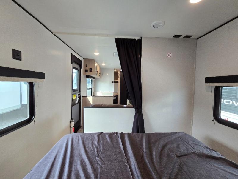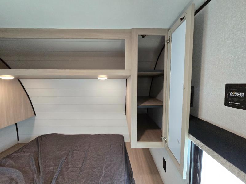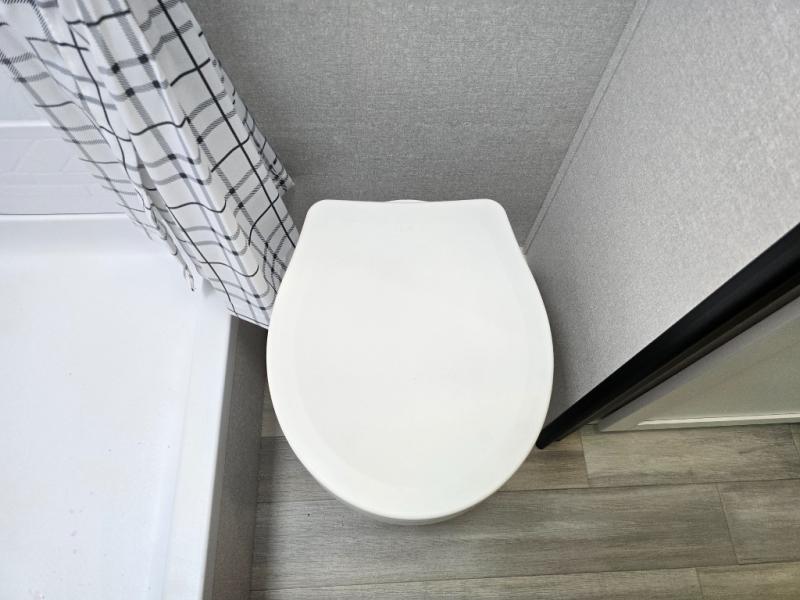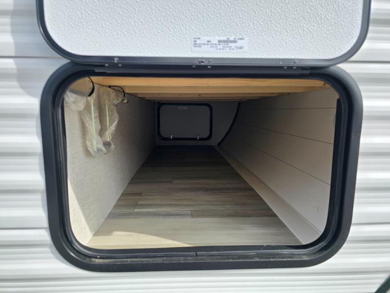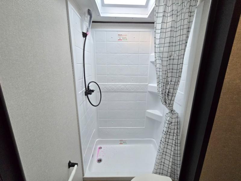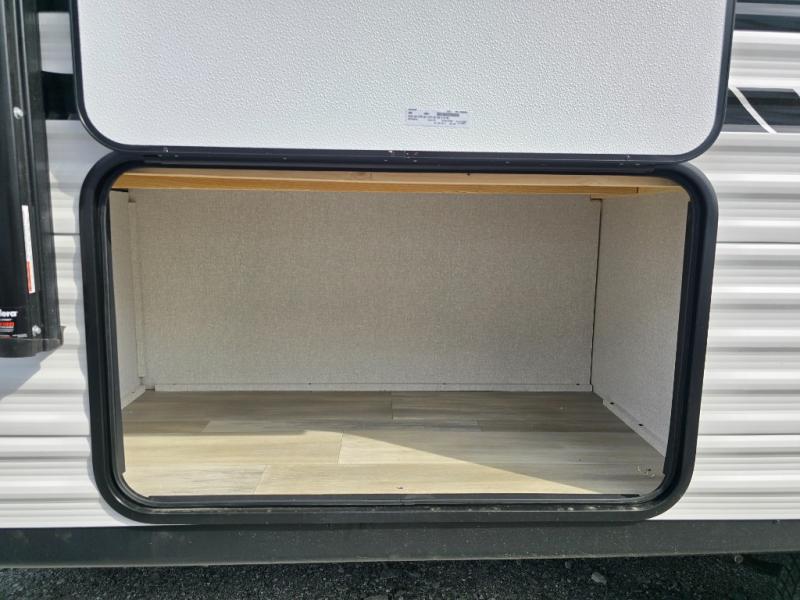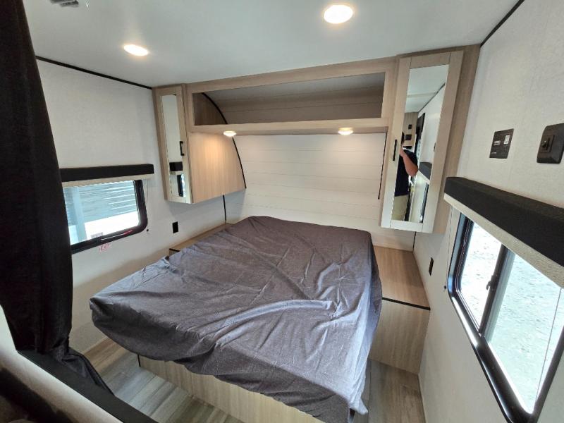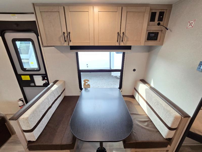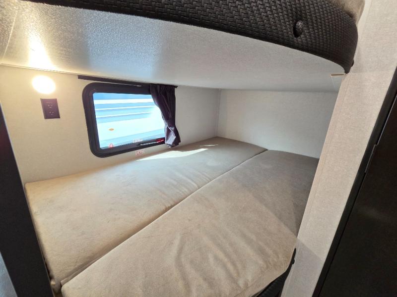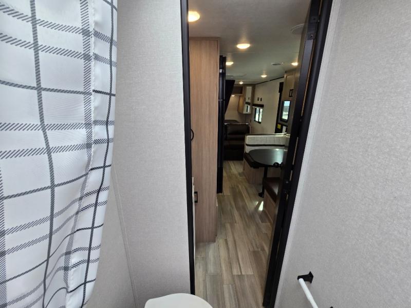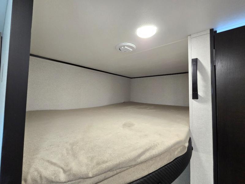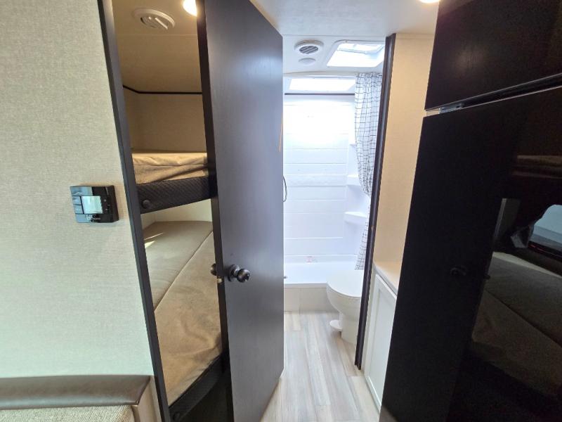 Camping trips are made easy in this spacious travel trailer with double-size bunk beds for guests or little ones. You'll find a front walk-around queen bed for a great night's rest, along with dual bedside wardrobes to keep your things tidy and a privacy curtain. The rear corner private bath includes a foot-flush toilet and a 24" x 40" shower, so you won't have to leave the camper in the middle of the night. A three-burner cooktop and microwave oven will let you make meals each day, and you'll find seating spaces at the booth dinette or on the sofa!