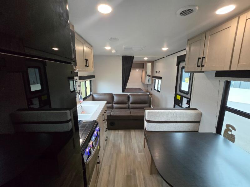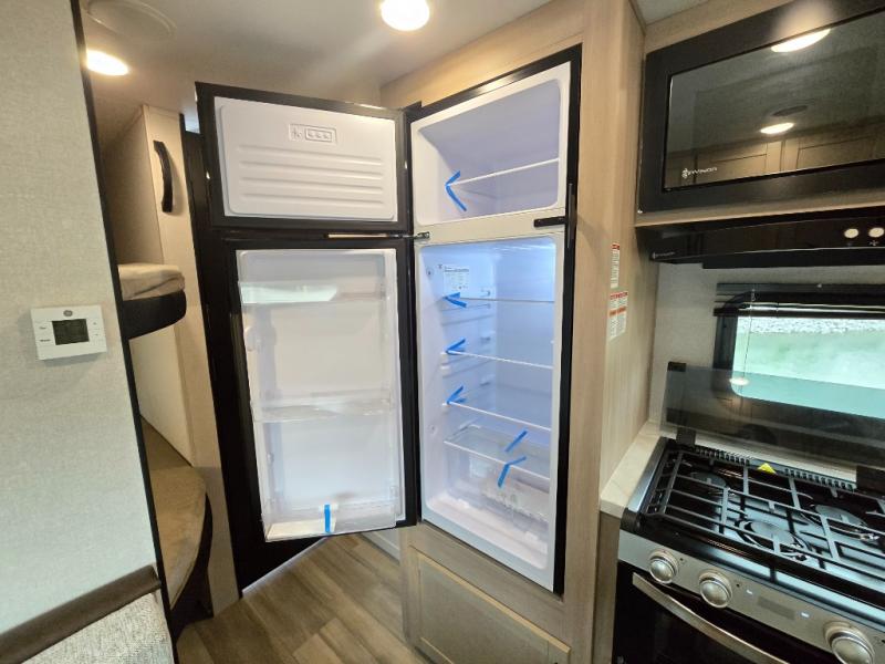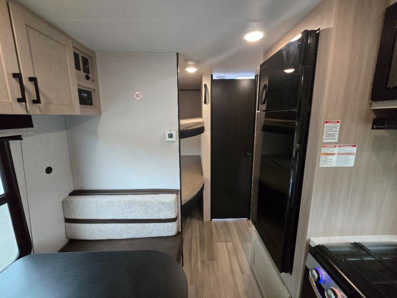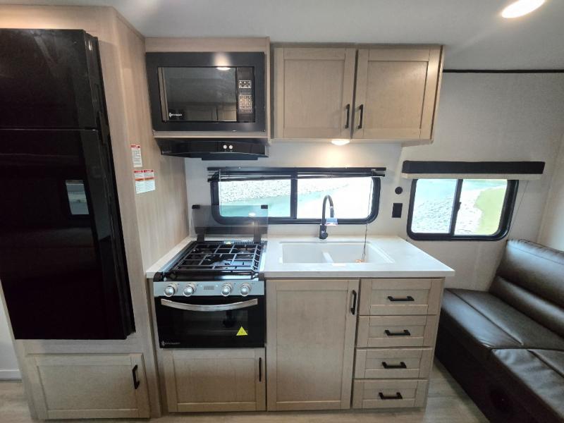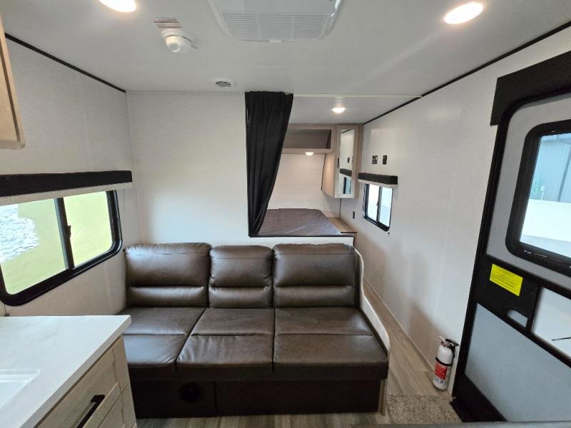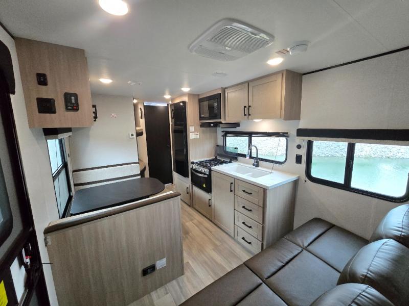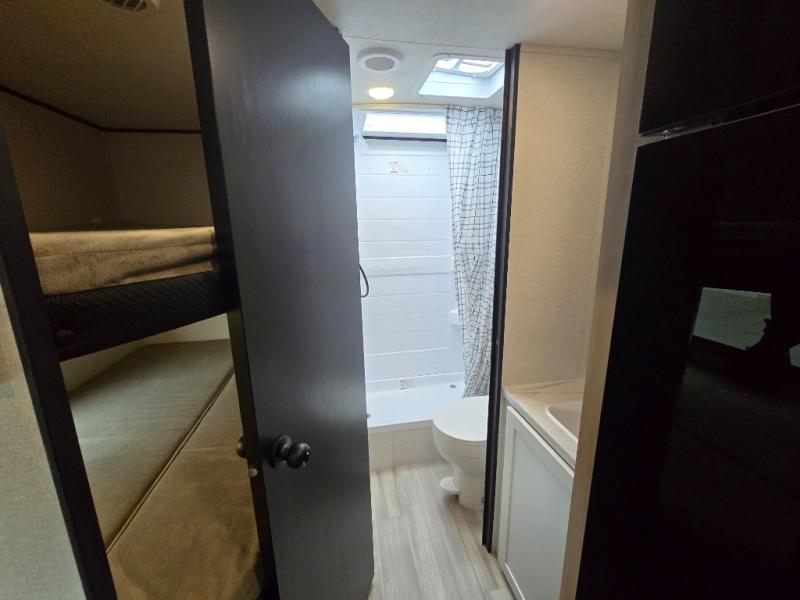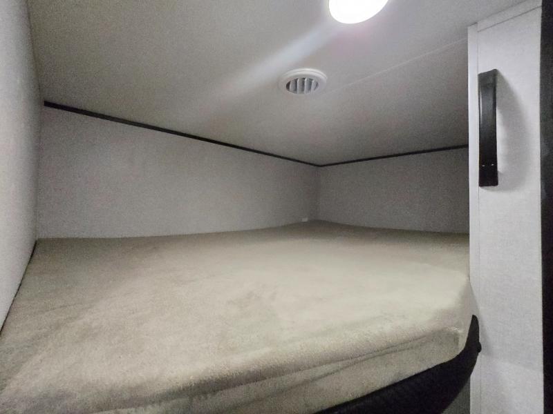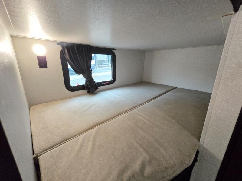 Camping trips are made easy in this spacious travel trailer with double-size bunk beds for guests or little ones. You'll find a front walk-around queen bed for a great night's rest, along with dual bedside wardrobes to keep your things tidy and a privacy curtain. The rear corner private bath includes a foot-flush toilet and a 24" x 40" shower, so you won't have to leave the camper in the middle of the night. A three-burner cooktop and microwave oven will let you make meals each day, and you'll find seating spaces at the booth dinette or on the sofa!