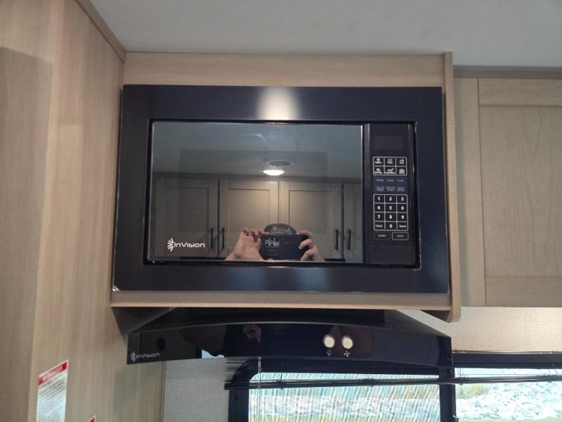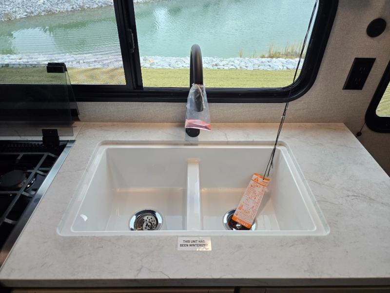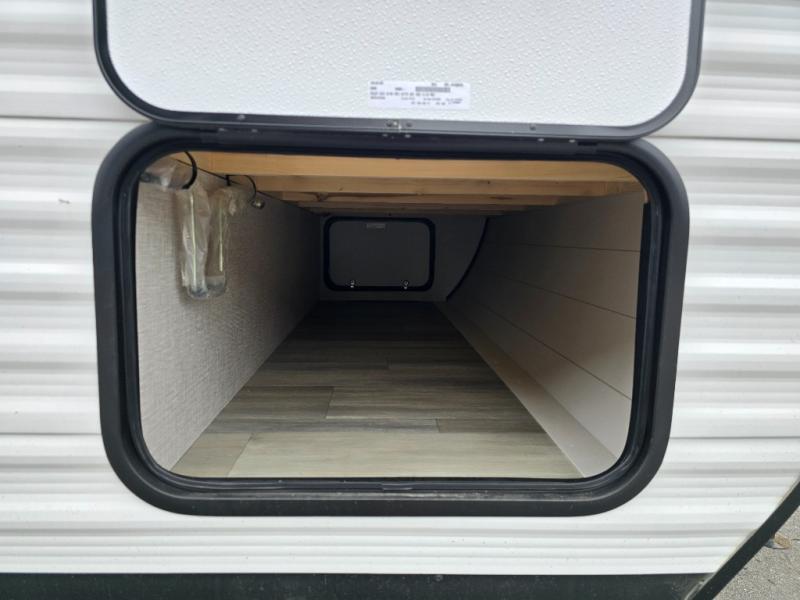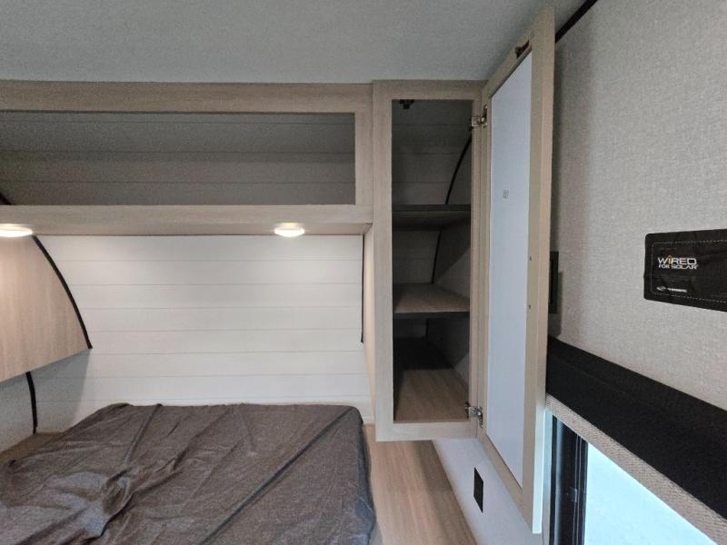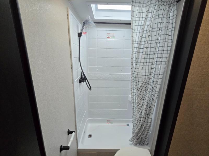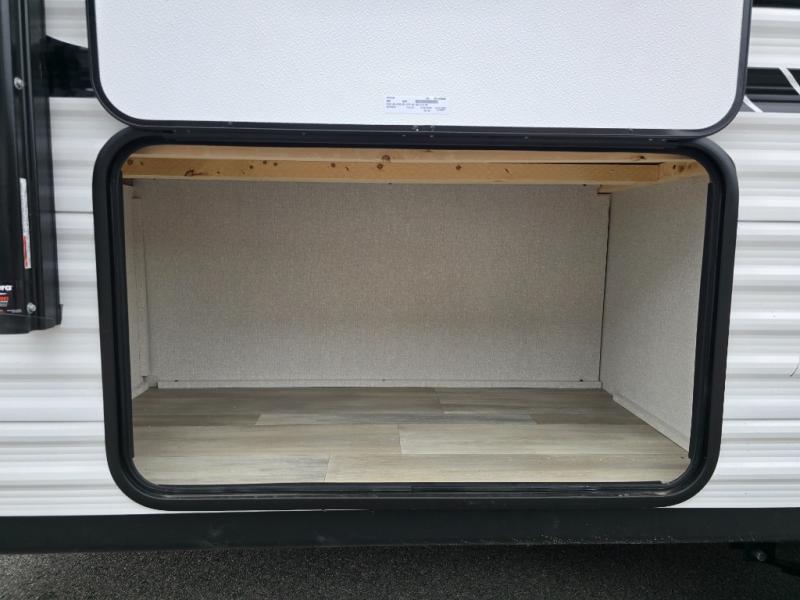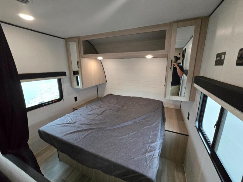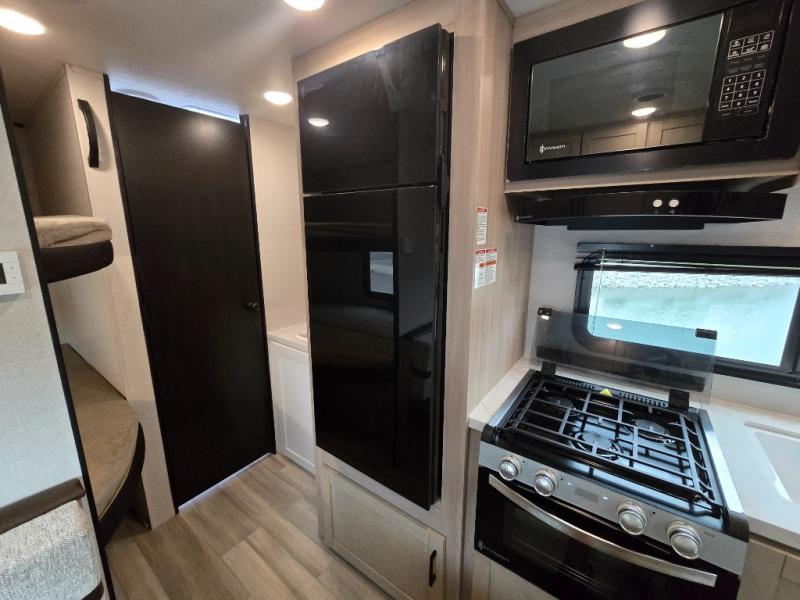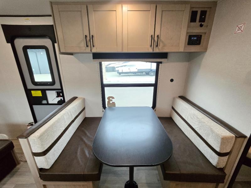 Camping trips are made easy in this spacious travel trailer with double-size bunk beds for guests or little ones. You'll find a front walk-around queen bed for a great night's rest, along with dual bedside wardrobes to keep your things tidy and a privacy curtain. The rear corner private bath includes a foot-flush toilet and a 24" x 40" shower, so you won't have to leave the camper in the middle of the night. A three-burner cooktop and microwave oven will let you make meals each day, and you'll find seating spaces at the booth dinette or on the sofa!