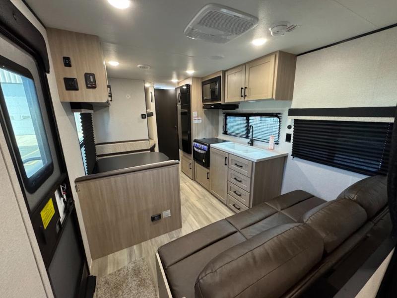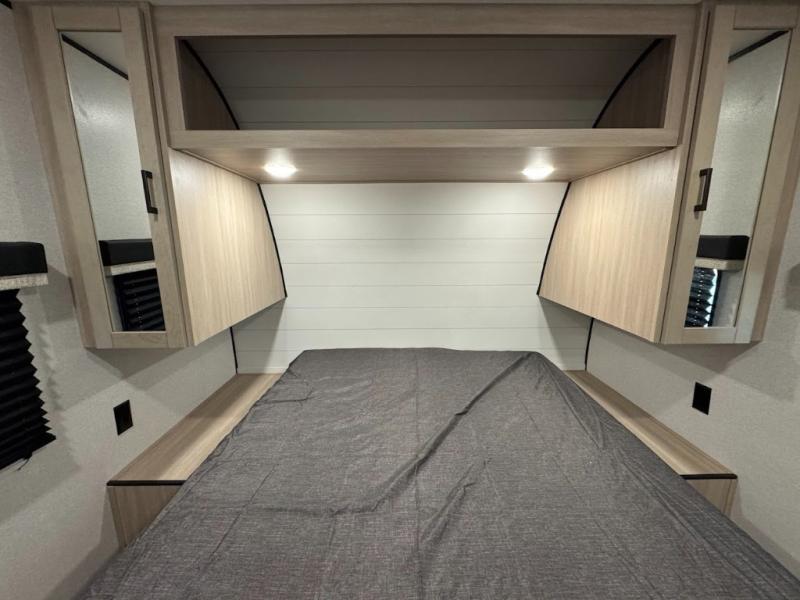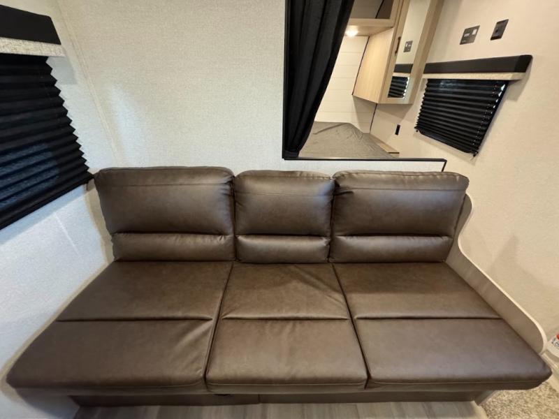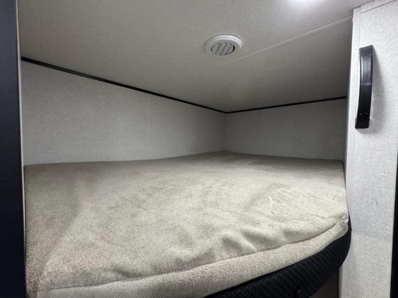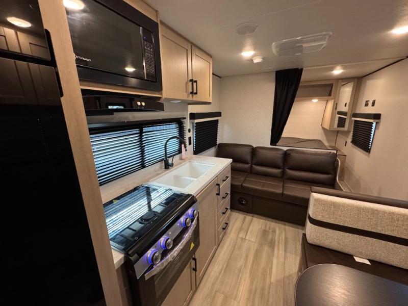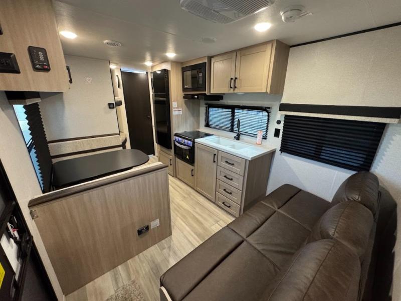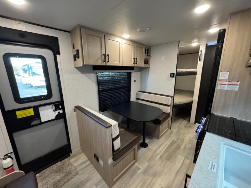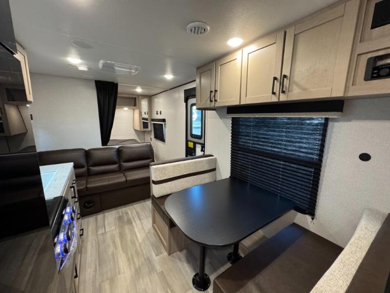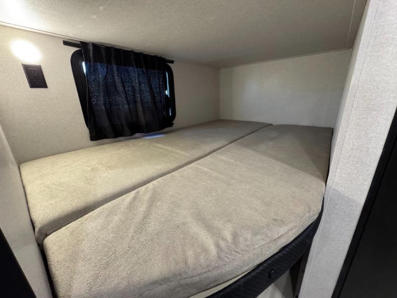 Camping trips are made easy in this spacious travel trailer with double-size bunk beds for guests or little ones. You'll find a front walk-around queen bed for a great night's rest, along with dual bedside wardrobes to keep your things tidy and a privacy curtain. The rear corner private bath includes a foot-flush toilet and a 24" x 40" shower, so you won't have to leave the camper in the middle of the night. A three-burner cooktop and microwave oven will let you make meals each day, and you'll find seating spaces at the booth dinette or on the sofa!