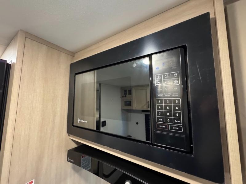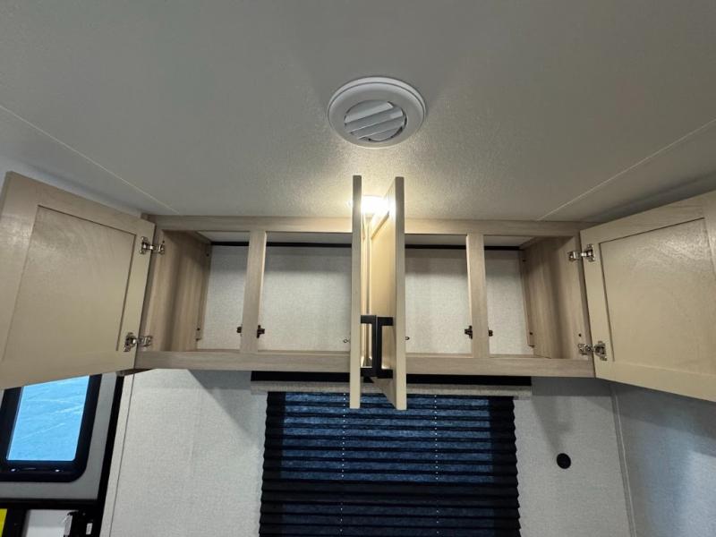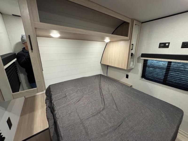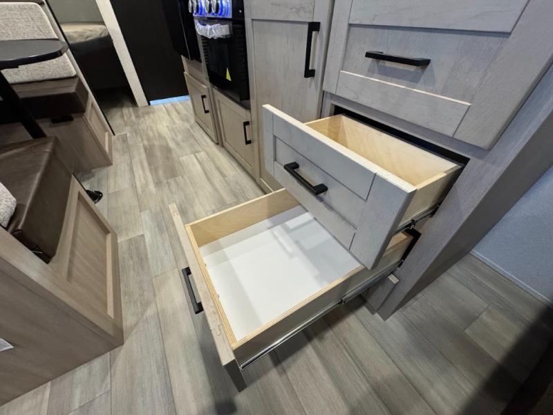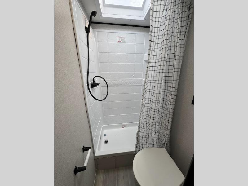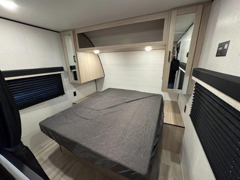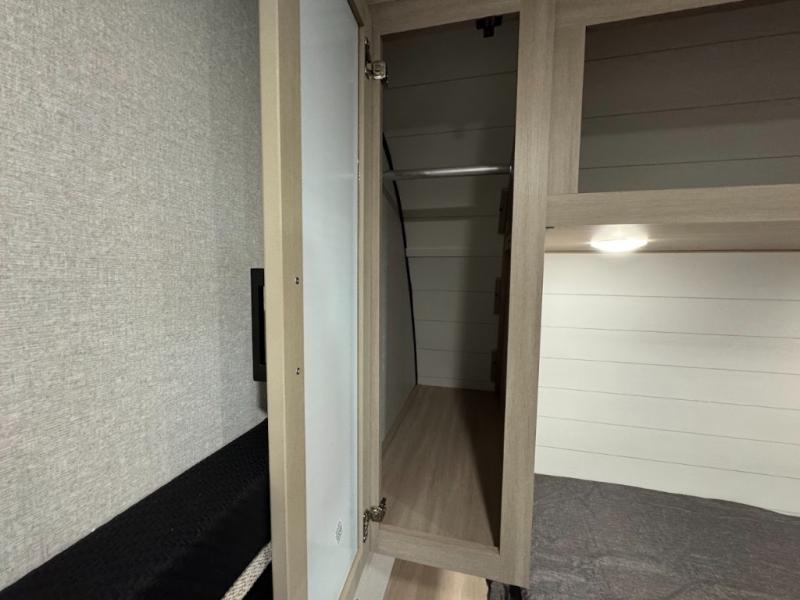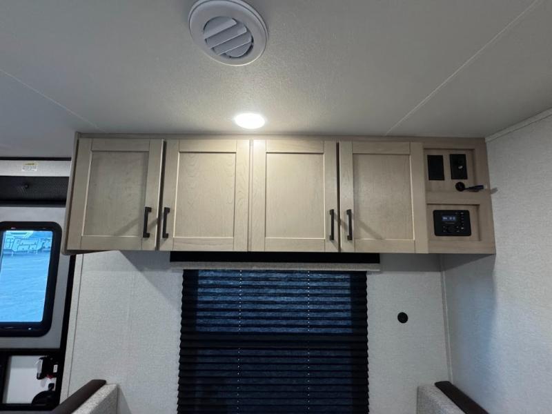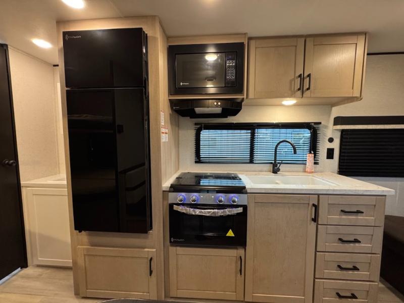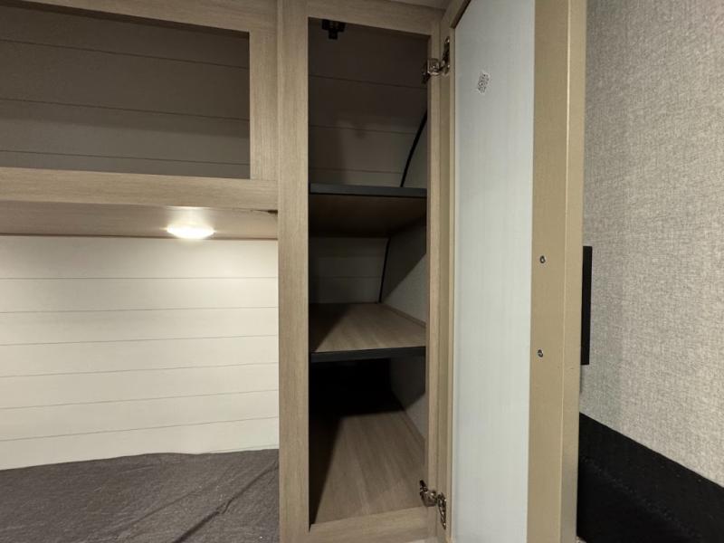 Camping trips are made easy in this spacious travel trailer with double-size bunk beds for guests or little ones. You'll find a front walk-around queen bed for a great night's rest, along with dual bedside wardrobes to keep your things tidy and a privacy curtain. The rear corner private bath includes a foot-flush toilet and a 24" x 40" shower, so you won't have to leave the camper in the middle of the night. A three-burner cooktop and microwave oven will let you make meals each day, and you'll find seating spaces at the booth dinette or on the sofa!