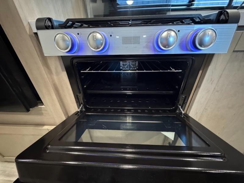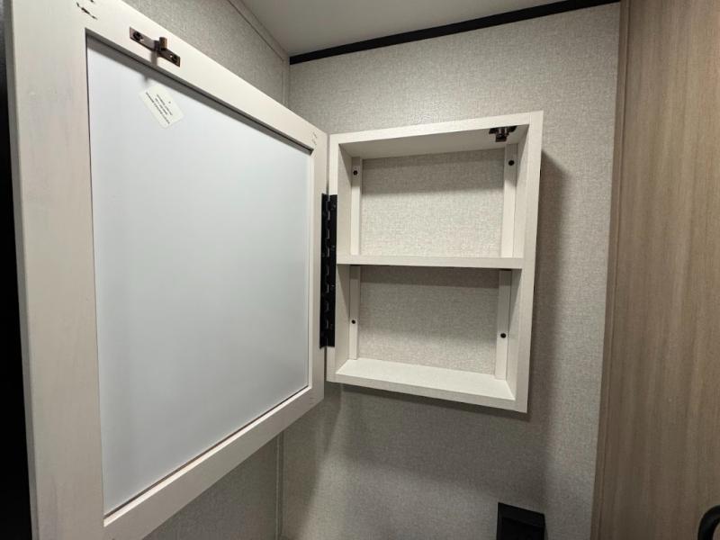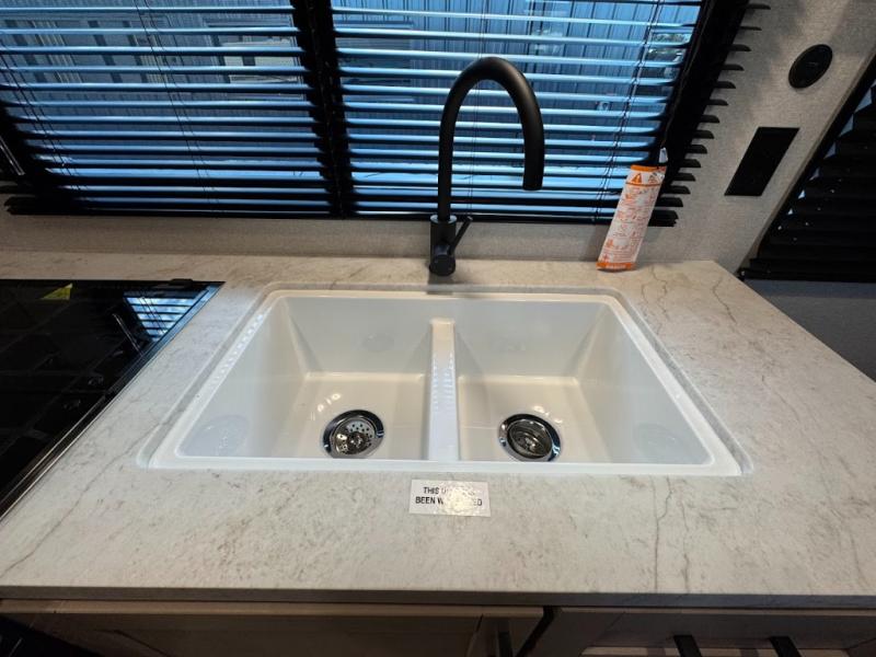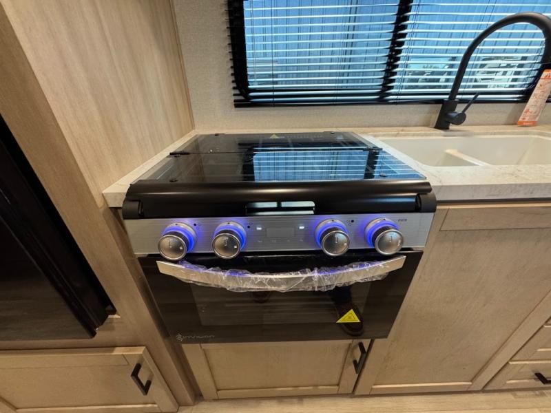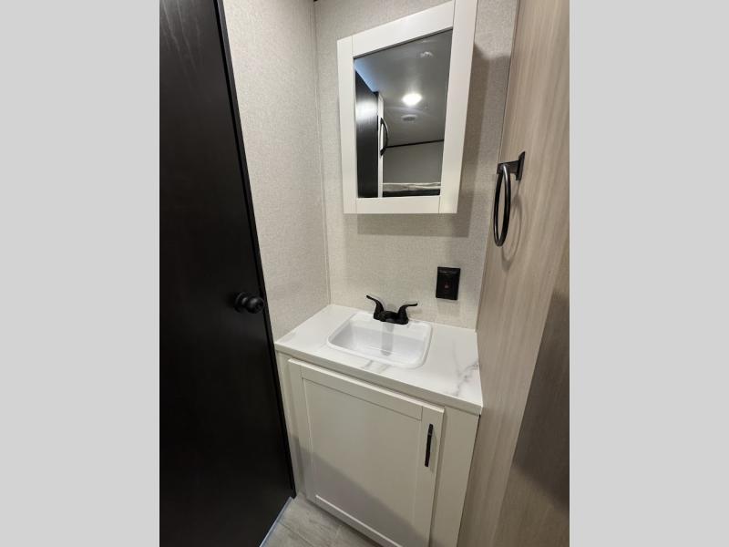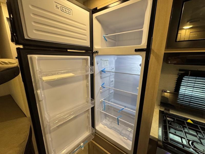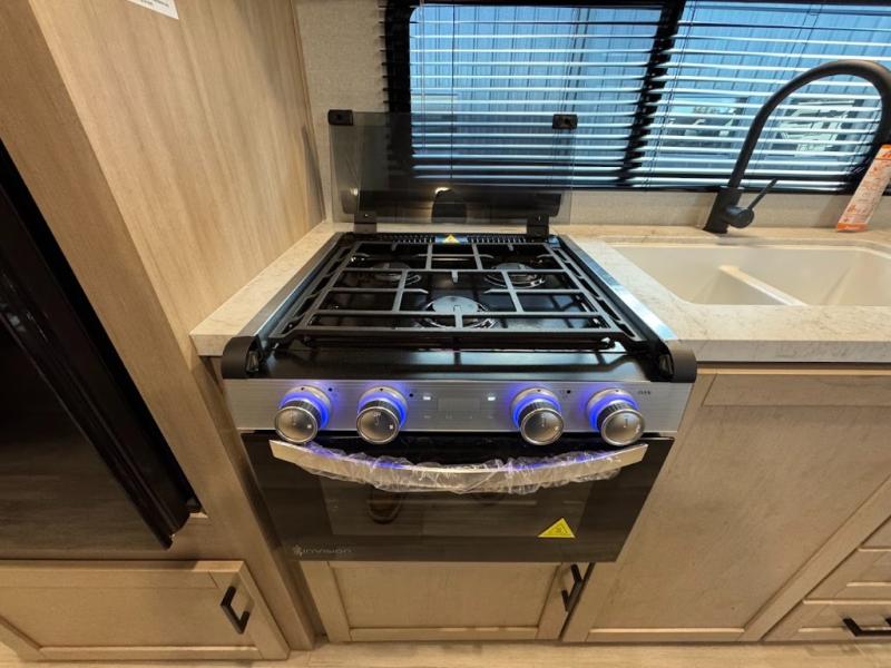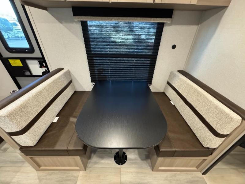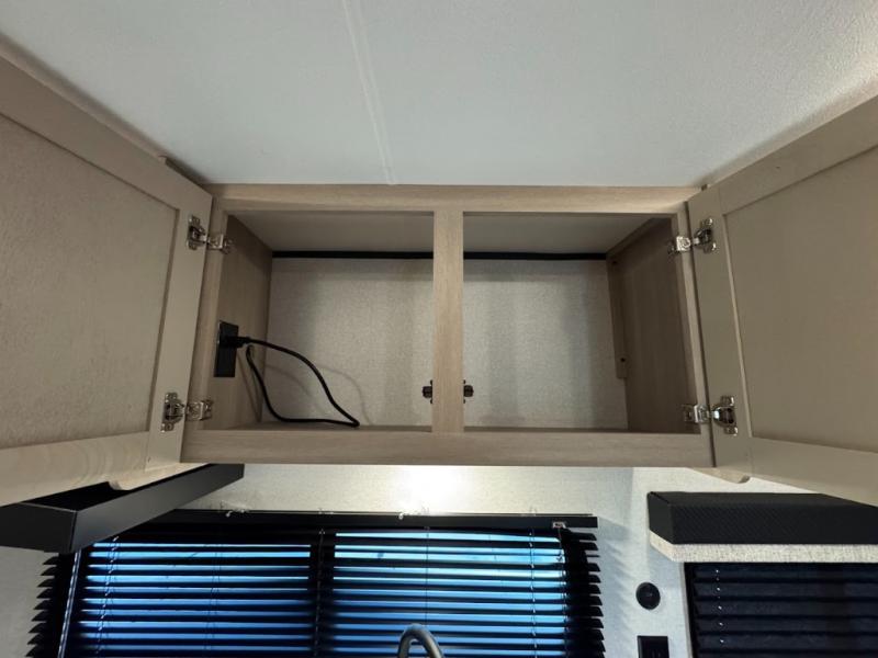 Camping trips are made easy in this spacious travel trailer with double-size bunk beds for guests or little ones. You'll find a front walk-around queen bed for a great night's rest, along with dual bedside wardrobes to keep your things tidy and a privacy curtain. The rear corner private bath includes a foot-flush toilet and a 24" x 40" shower, so you won't have to leave the camper in the middle of the night. A three-burner cooktop and microwave oven will let you make meals each day, and you'll find seating spaces at the booth dinette or on the sofa!