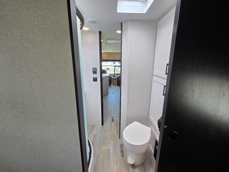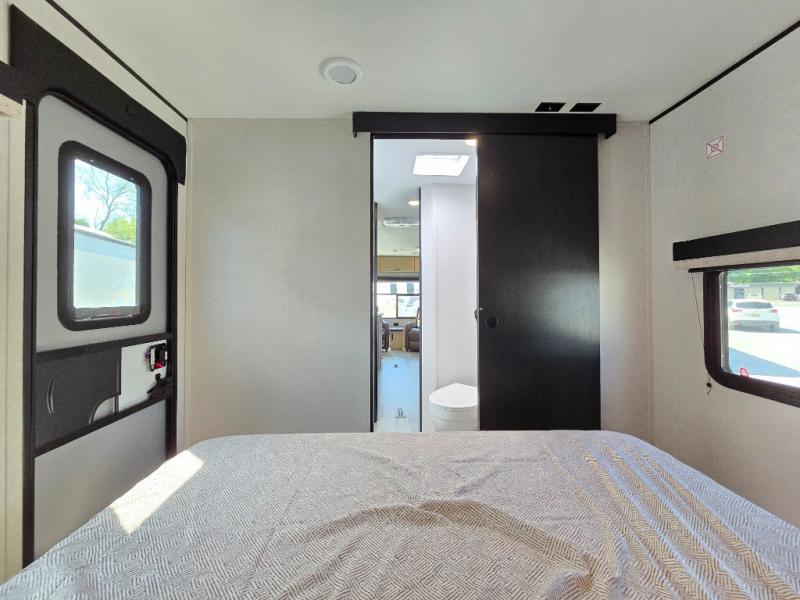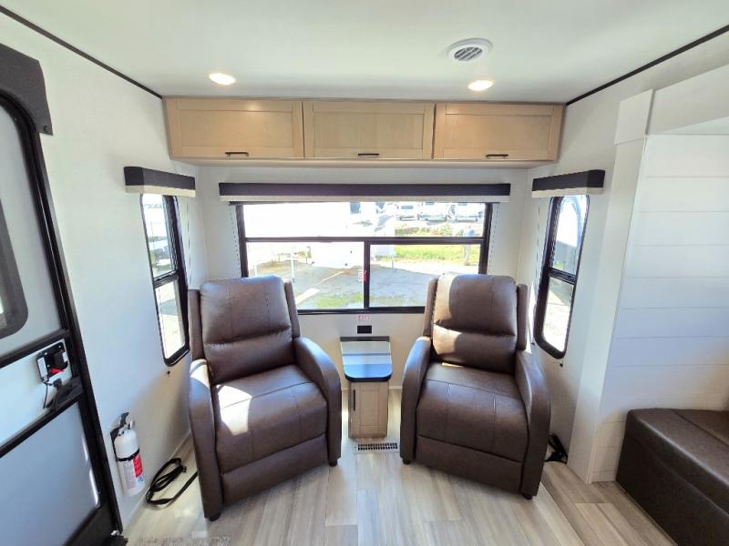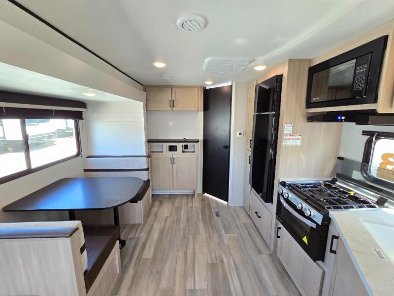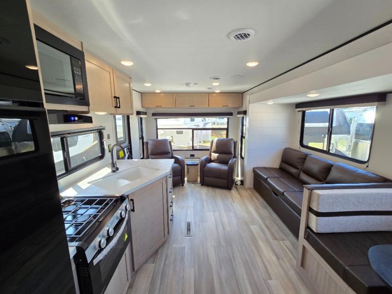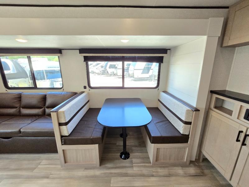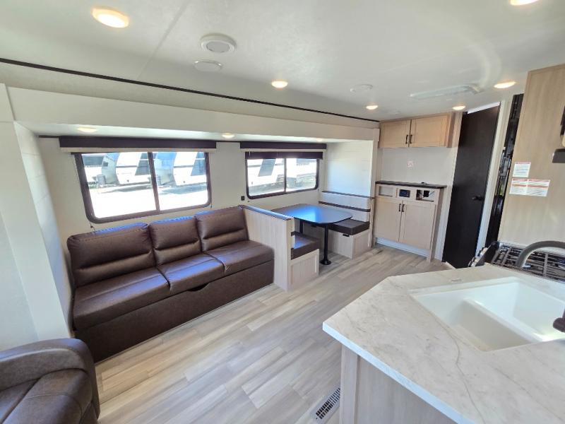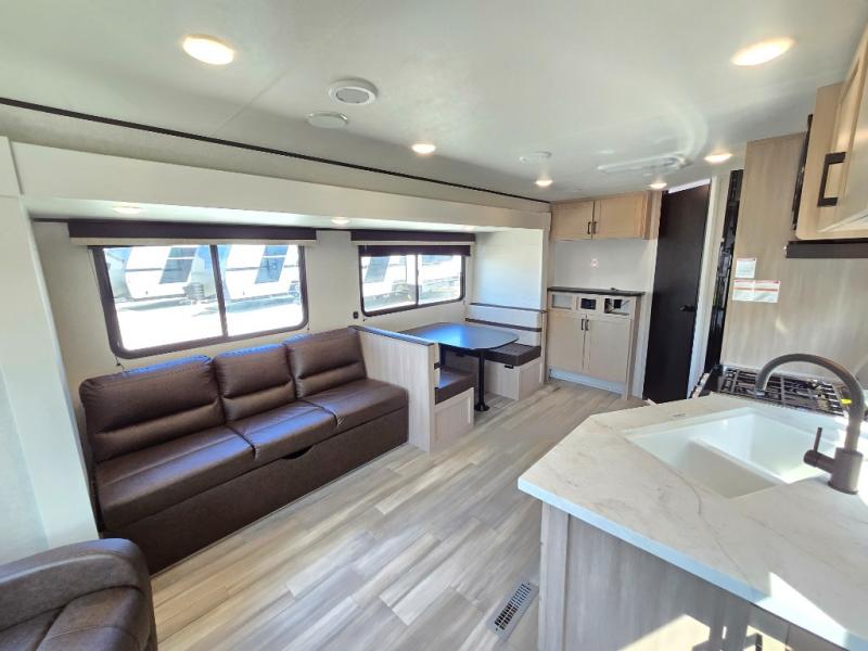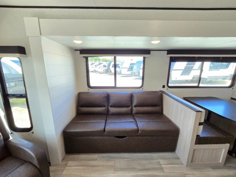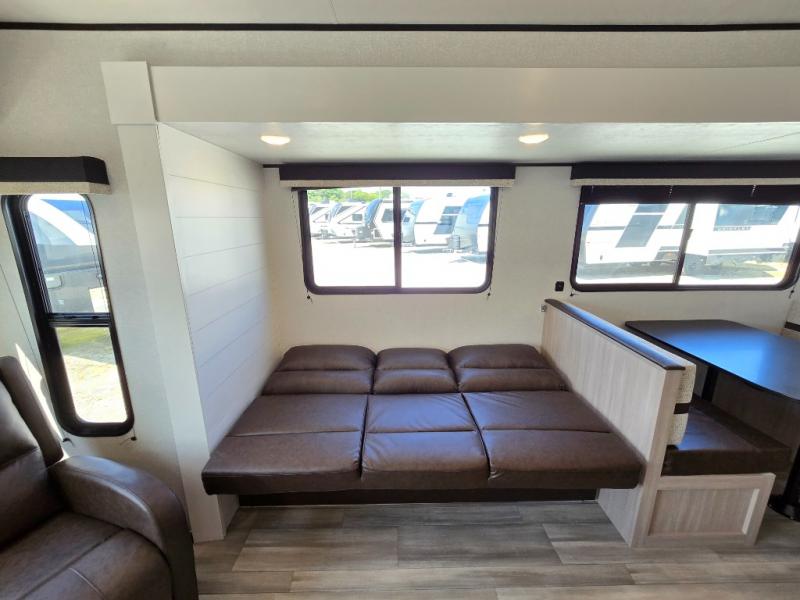 Time spent in this spacious travel trailer will be time well spent! Once you arrive at your campsite, you can put out the 18' power awning and relax in your camp chairs. The dual entry doors will allow you to enter in through the rear living room with dual lounge chairs, or the front private bedroom with an RV queen bed! The chef of your group can make lunch on the three-burner cooktop or in the microwave oven, and there is a booth dinette where you can dine together. Your guests can convert the dinette to sleeping space at night, along with the jack-knife sofa!