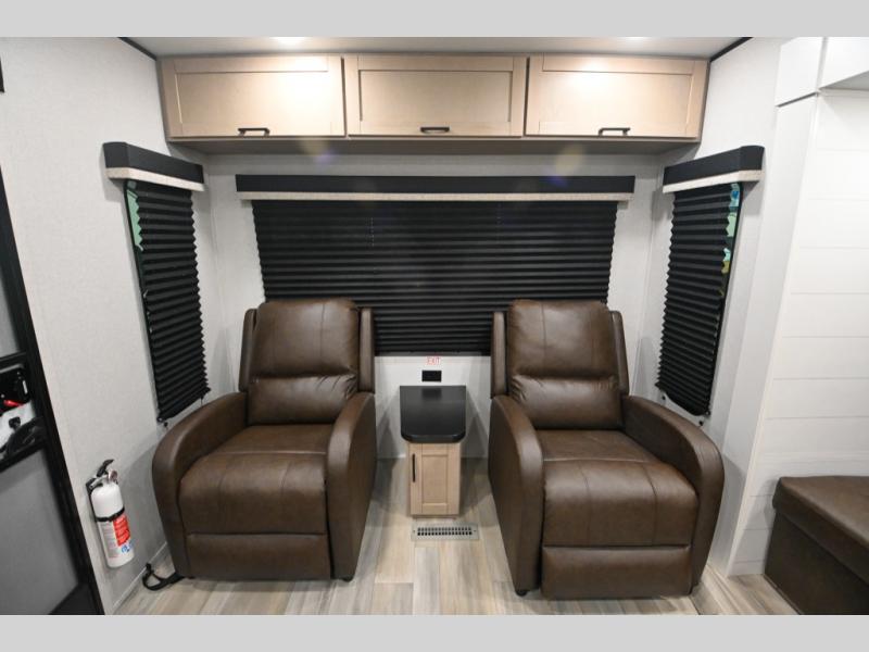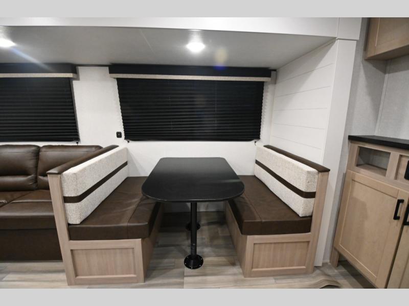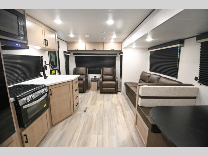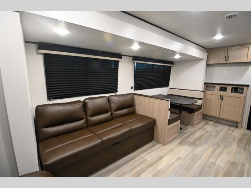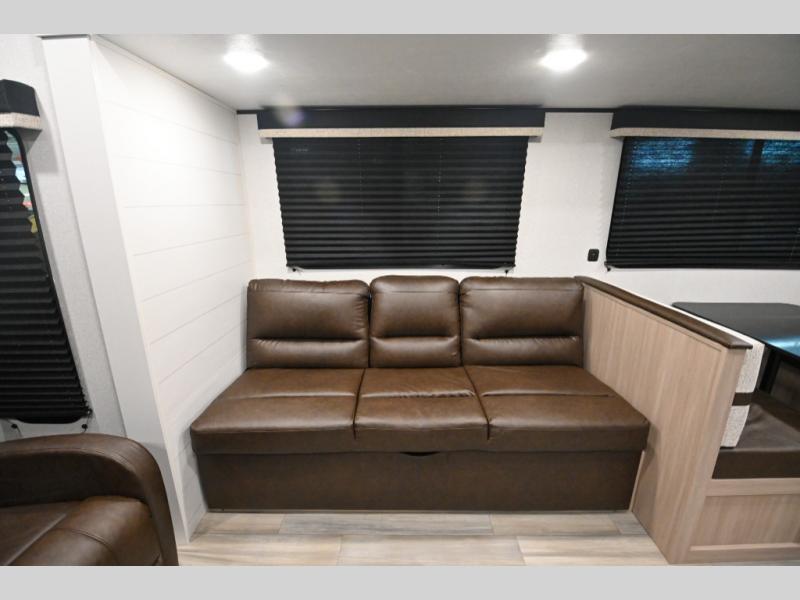 Time spent in this spacious travel trailer will be time well spent! Once you arrive at your campsite, you can put out the 18' power awning and relax in your camp chairs. The dual entry doors will allow you to enter in through the rear living room with dual lounge chairs, or the front private bedroom with an RV queen bed! The chef of your group can make lunch on the three-burner cooktop or in the microwave oven, and there is a booth dinette where you can dine together. Your guests can convert the dinette to sleeping space at night, along with the jack-knife sofa!