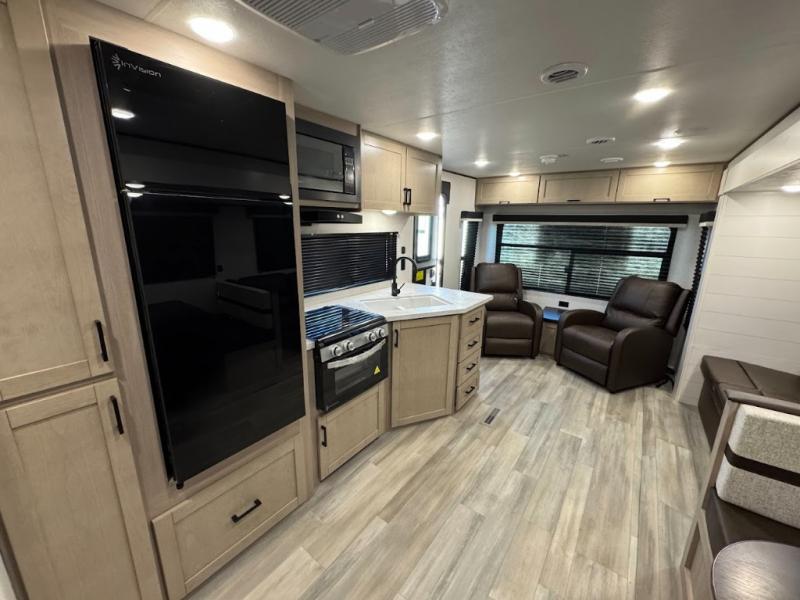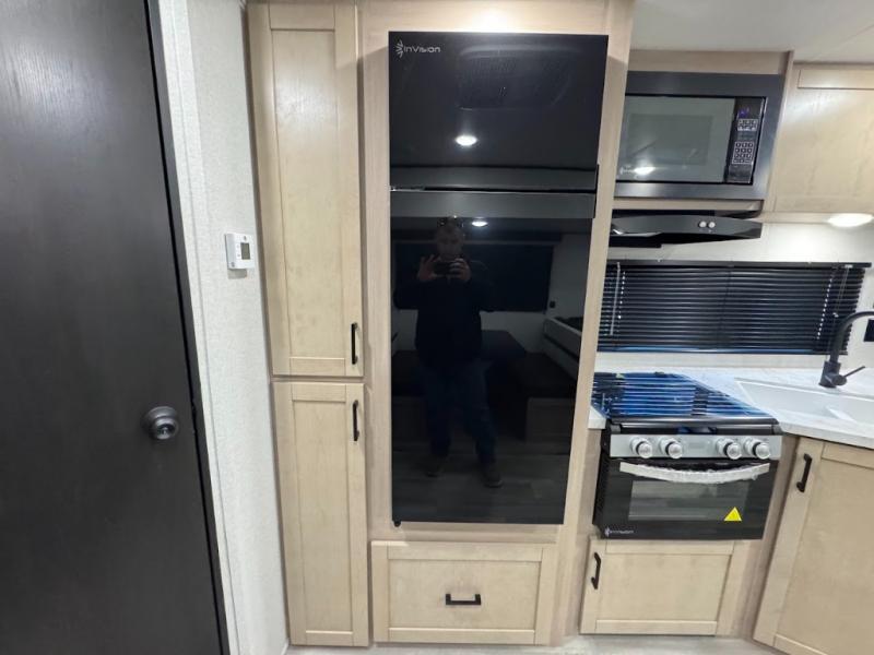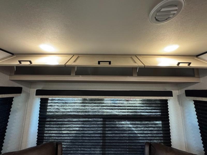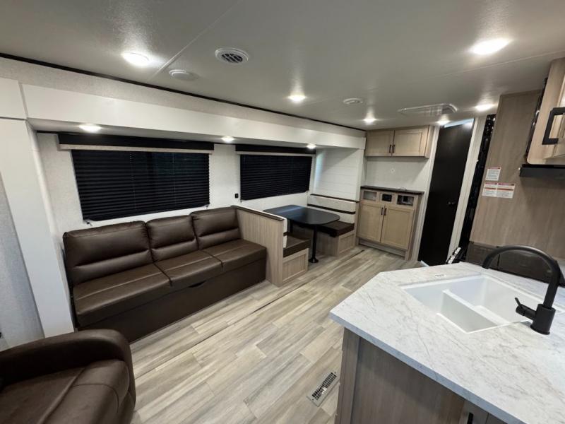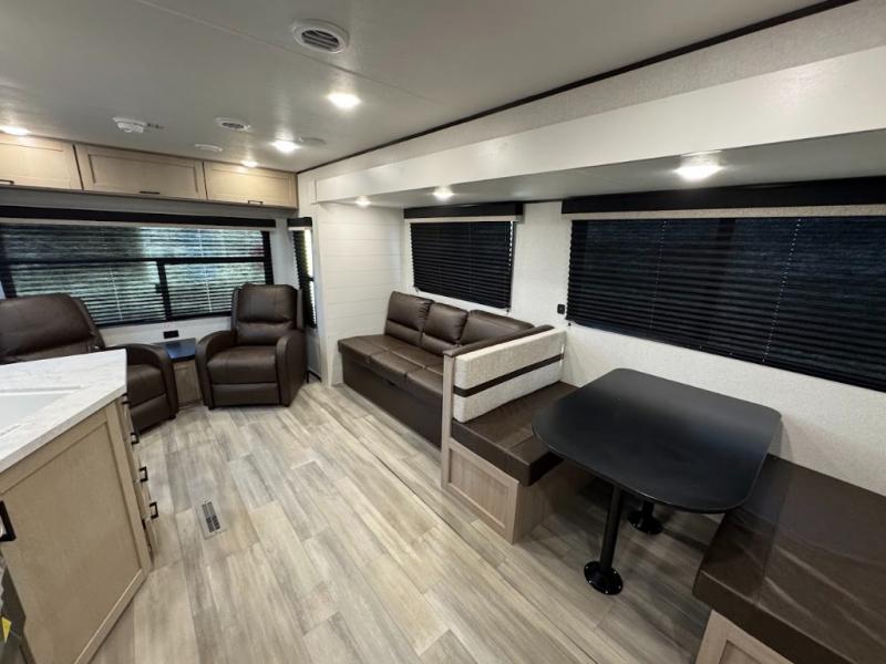 Time spent in this spacious travel trailer will be time well spent! Once you arrive at your campsite, you can put out the 18' power awning and relax in your camp chairs. The dual entry doors will allow you to enter in through the rear living room with dual lounge chairs, or the front private bedroom with an RV queen bed! The chef of your group can make lunch on the three-burner cooktop or in the microwave oven, and there is a booth dinette where you can dine together. Your guests can convert the dinette to sleeping space at night, along with the jack-knife sofa!