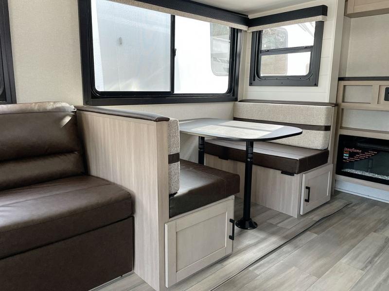 Time spent in this spacious travel trailer will be time well spent! Once you arrive at your campsite, you can put out the 18' power awning and relax in your camp chairs. The dual entry doors will allow you to enter in through the rear living room with dual lounge chairs, or the front private bedroom with an RV queen bed! The chef of your group can make lunch on the three-burner cooktop or in the microwave oven, and there is a booth dinette where you can dine together. Your guests can convert the dinette to sleeping space at night, along with the jack-knife sofa!