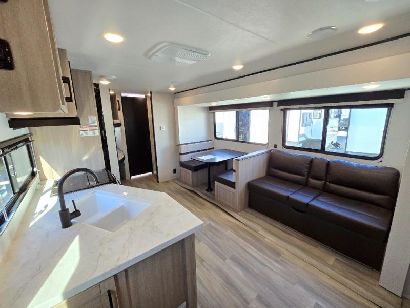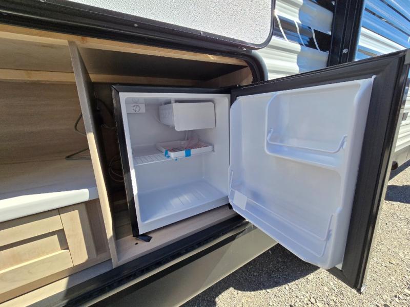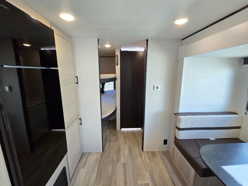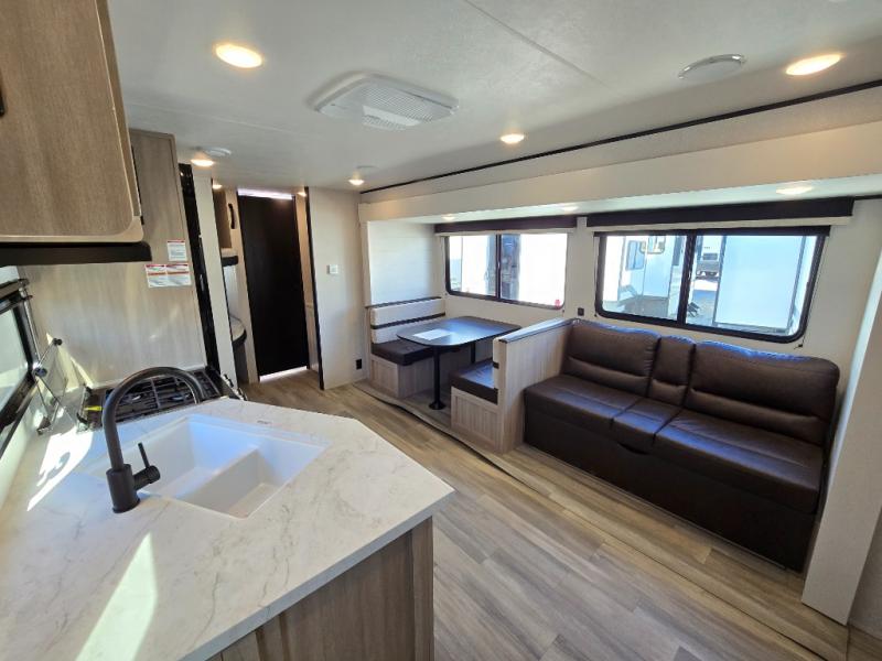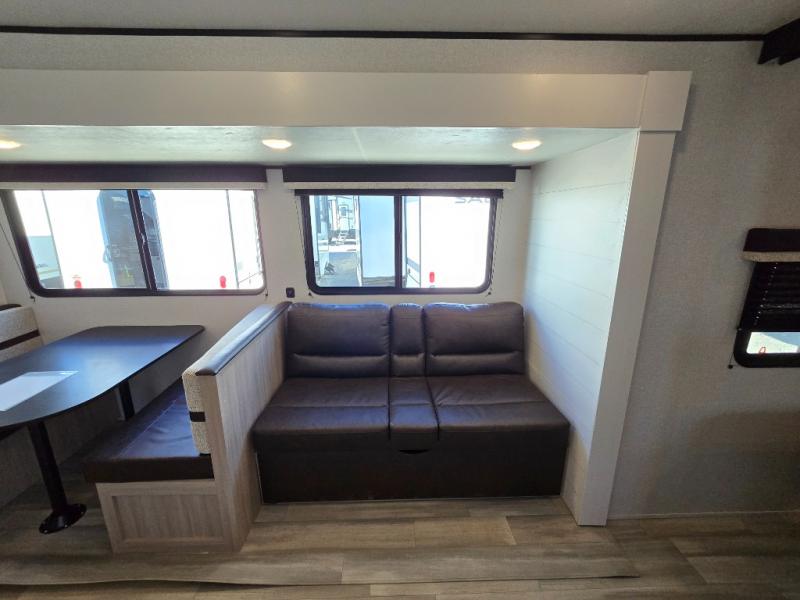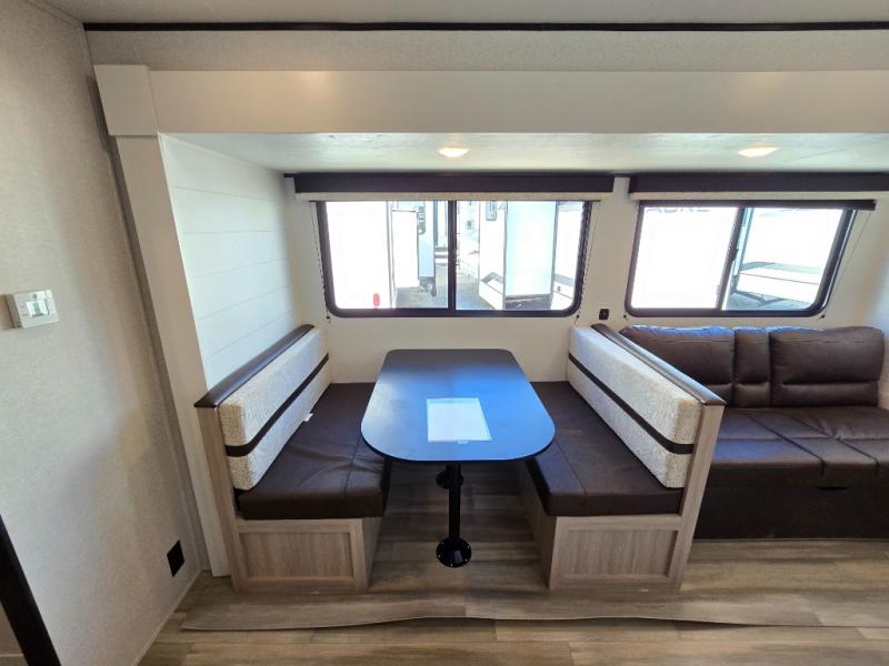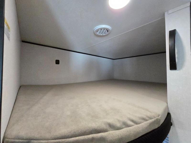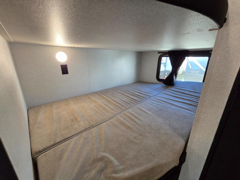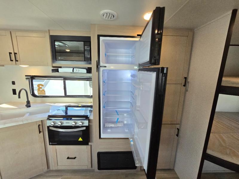 The whole gang will love weekends in the woods with this travel trailer in tow! There is a large slide out for added space, and here you'll find the jack-knife sofa and booth dinette. You can claim the front private bedroom to yourselves, while your guests or little ones take the double-size bunks. A full kitchen is complete with a three-burner cooktop and microwave oven to make meals each day, plus a 12V refrigerator and pantry for food storage. This unit also includes an outdoor kitchen with a refrigerator to keep cold drinks ready to enjoy!