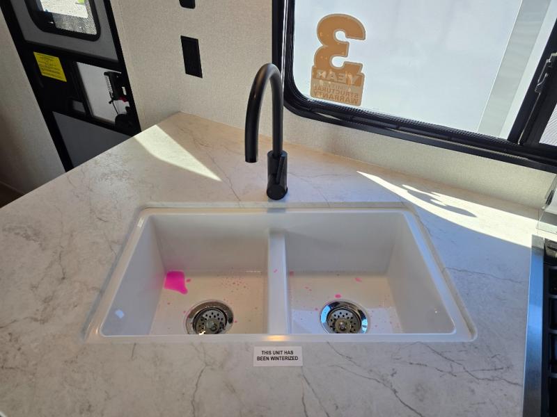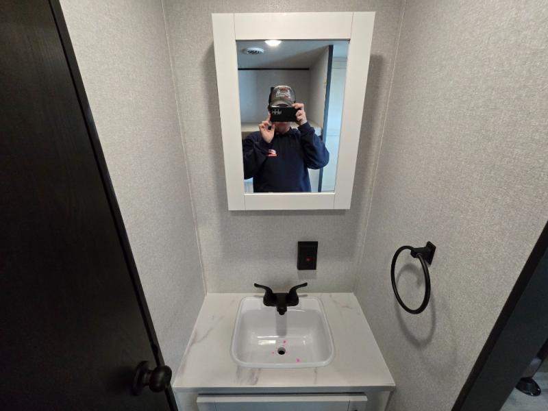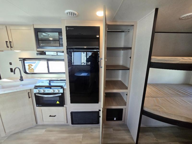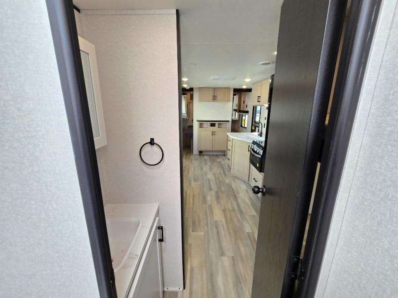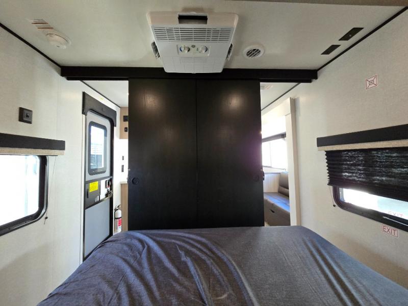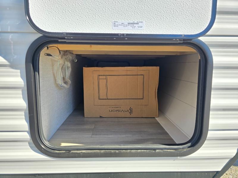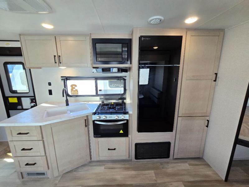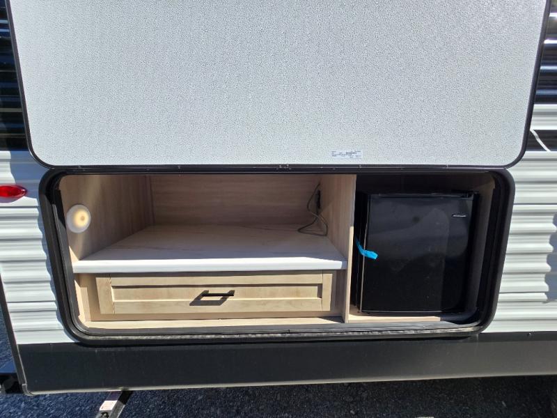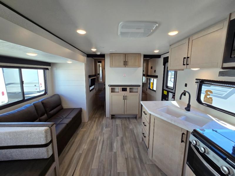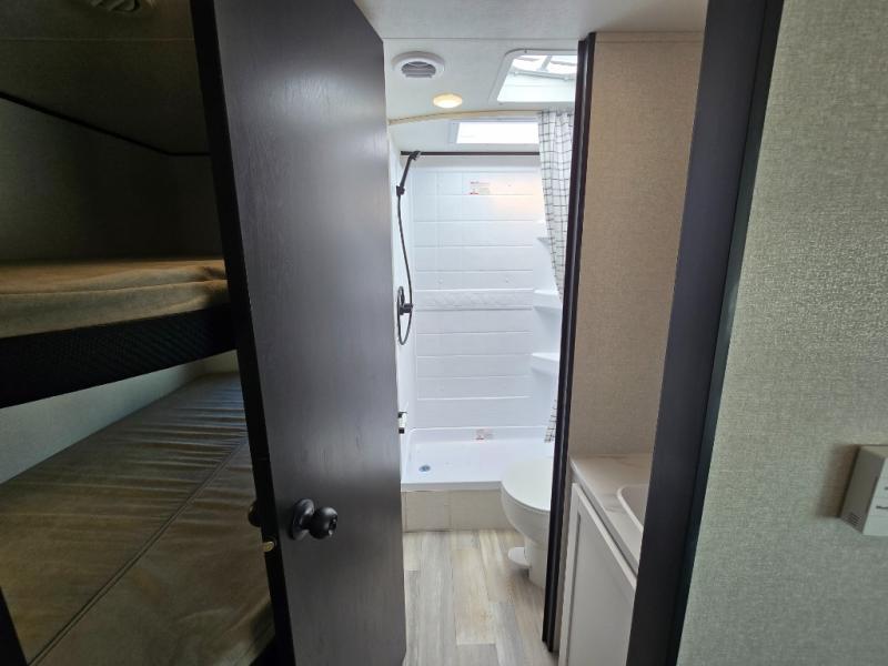 The whole gang will love weekends in the woods with this travel trailer in tow! There is a large slide out for added space, and here you'll find the jack-knife sofa and booth dinette. You can claim the front private bedroom to yourselves, while your guests or little ones take the double-size bunks. A full kitchen is complete with a three-burner cooktop and microwave oven to make meals each day, plus a 12V refrigerator and pantry for food storage. This unit also includes an outdoor kitchen with a refrigerator to keep cold drinks ready to enjoy!