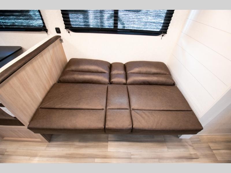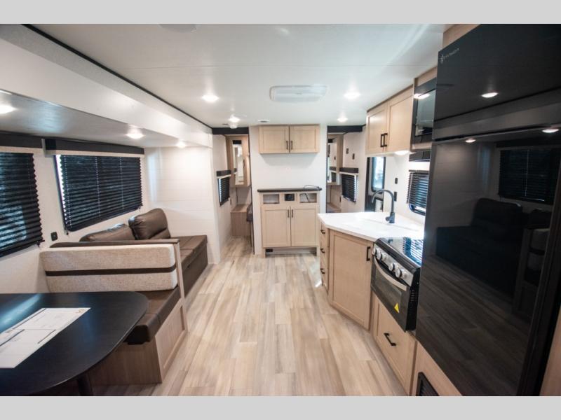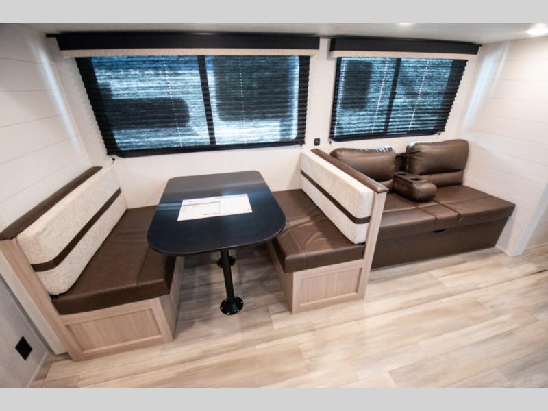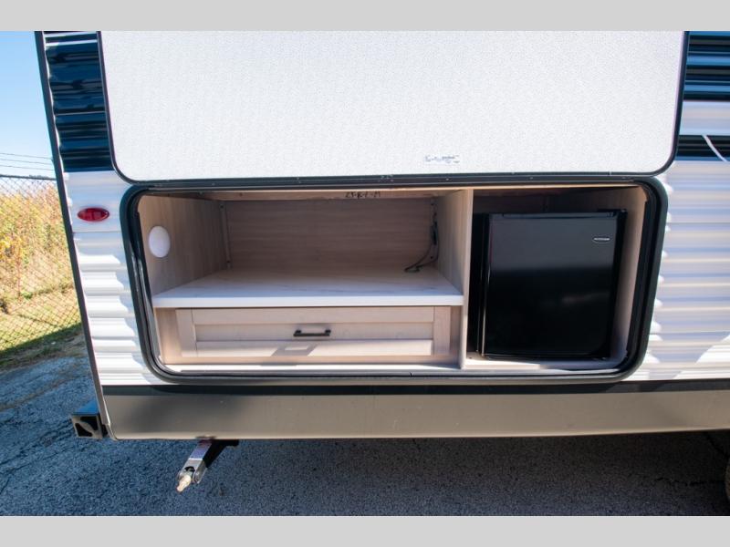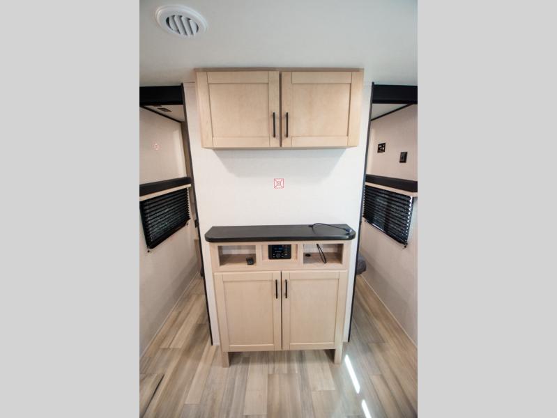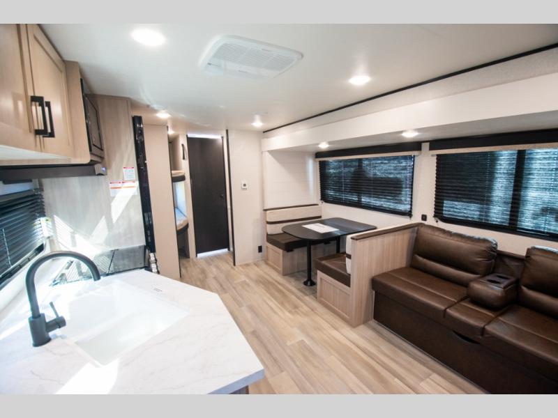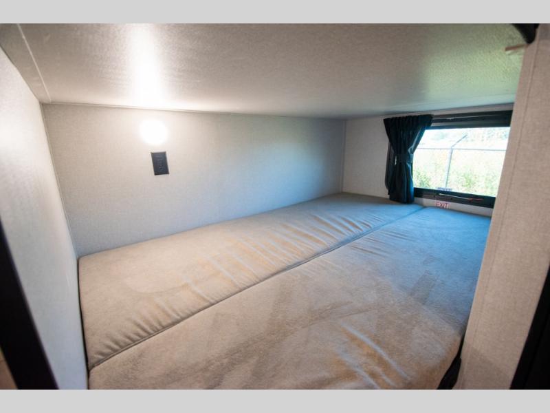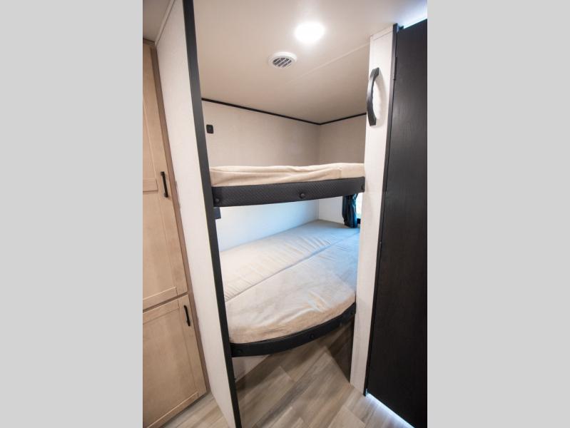 The whole gang will love weekends in the woods with this travel trailer in tow! There is a large slide out for added space, and here you'll find the jack-knife sofa and booth dinette. You can claim the front private bedroom to yourselves, while your guests or little ones take the double-size bunks. A full kitchen is complete with a three-burner cooktop and microwave oven to make meals each day, plus a 12V refrigerator and pantry for food storage. This unit also includes an outdoor kitchen with a refrigerator to keep cold drinks ready to enjoy!