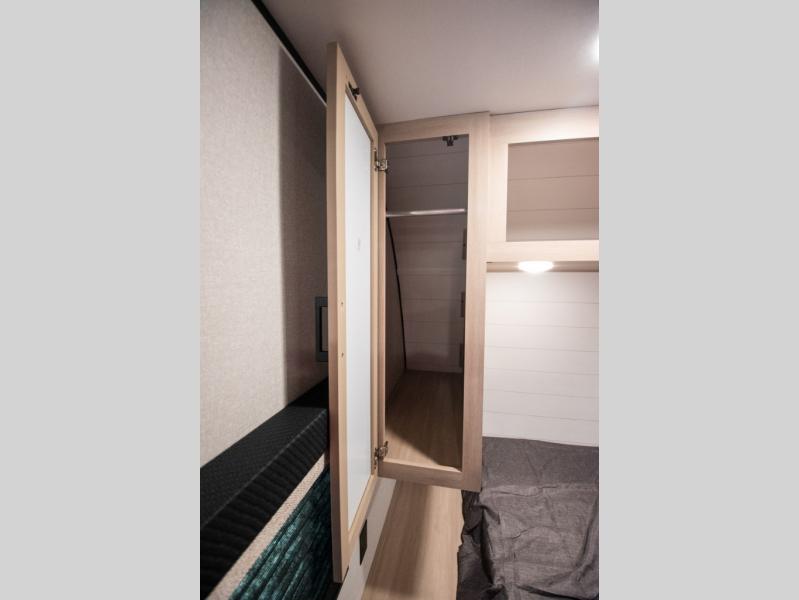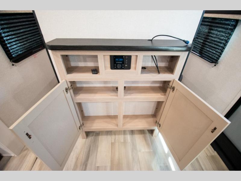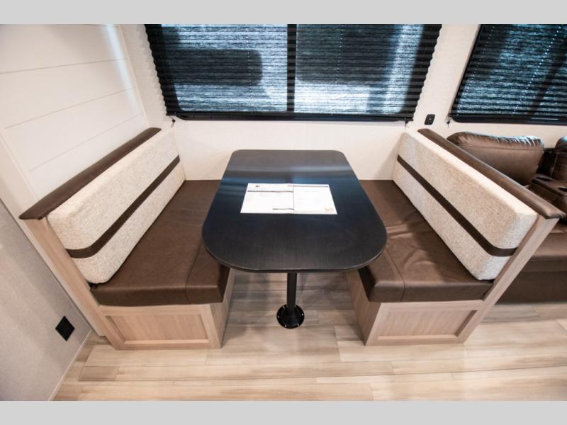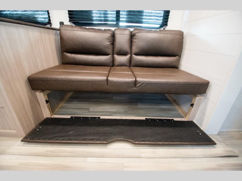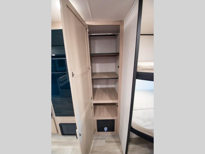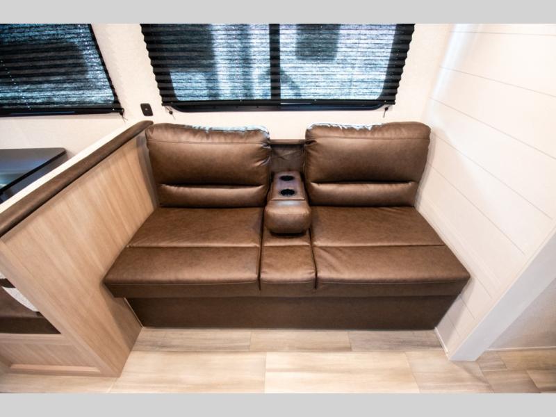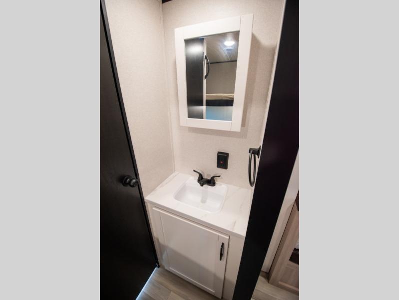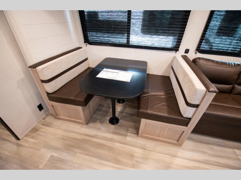 The whole gang will love weekends in the woods with this travel trailer in tow! There is a large slide out for added space, and here you'll find the jack-knife sofa and booth dinette. You can claim the front private bedroom to yourselves, while your guests or little ones take the double-size bunks. A full kitchen is complete with a three-burner cooktop and microwave oven to make meals each day, plus a 12V refrigerator and pantry for food storage. This unit also includes an outdoor kitchen with a refrigerator to keep cold drinks ready to enjoy!