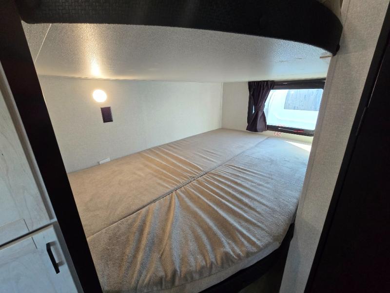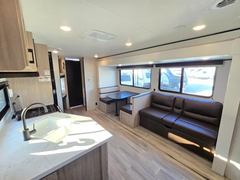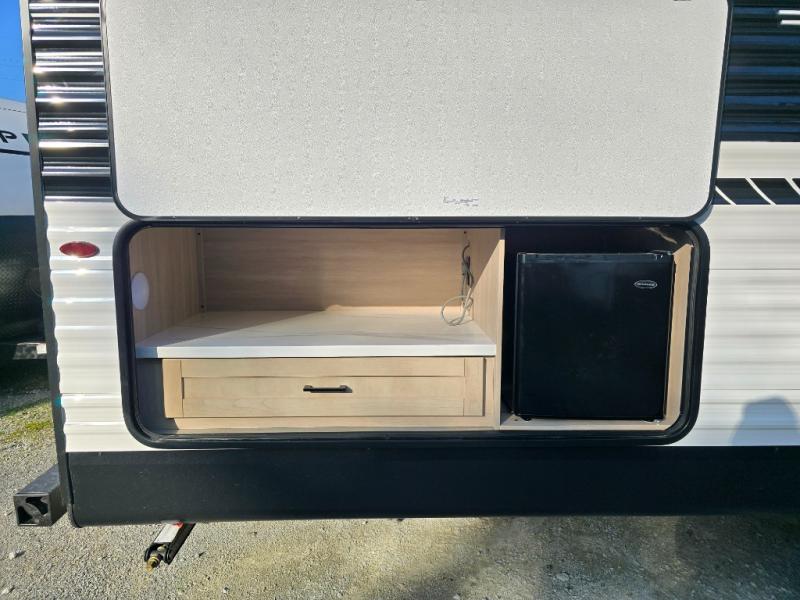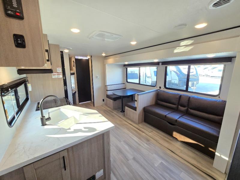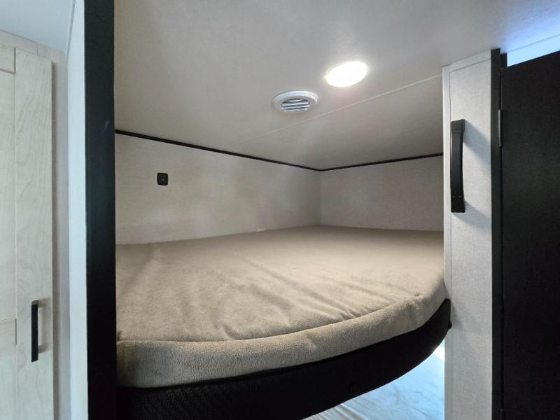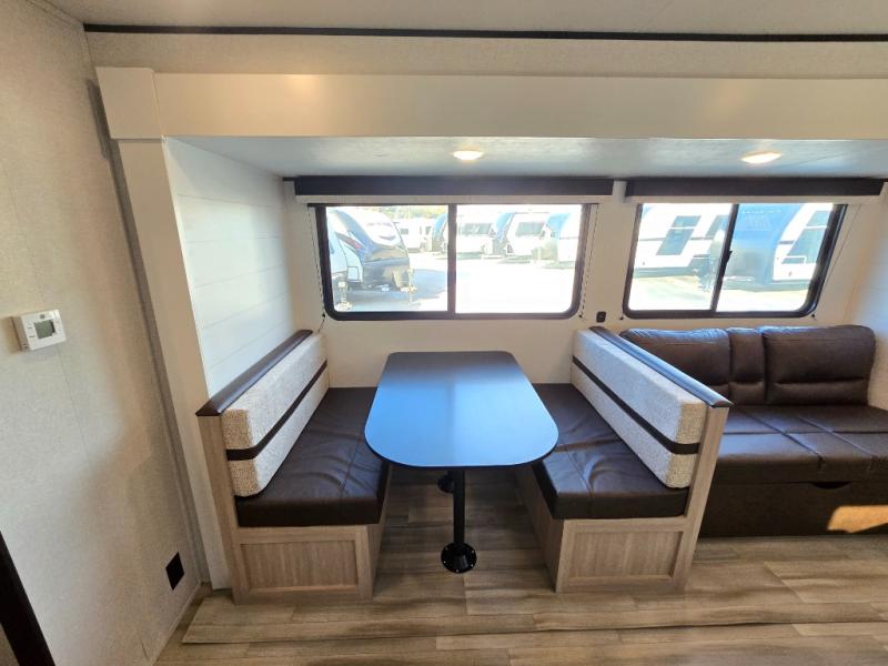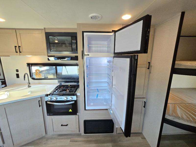 The whole gang will love weekends in the woods with this travel trailer in tow! There is a large slide out for added space, and here you'll find the jack-knife sofa and booth dinette. You can claim the front private bedroom to yourselves, while your guests or little ones take the double-size bunks. A full kitchen is complete with a three-burner cooktop and microwave oven to make meals each day, plus a 12V refrigerator and pantry for food storage. This unit also includes an outdoor kitchen with a refrigerator to keep cold drinks ready to enjoy!