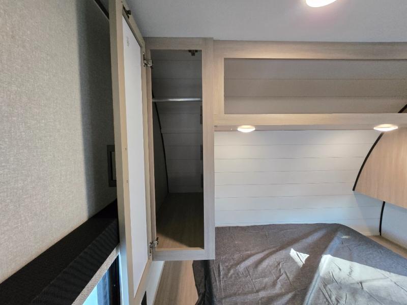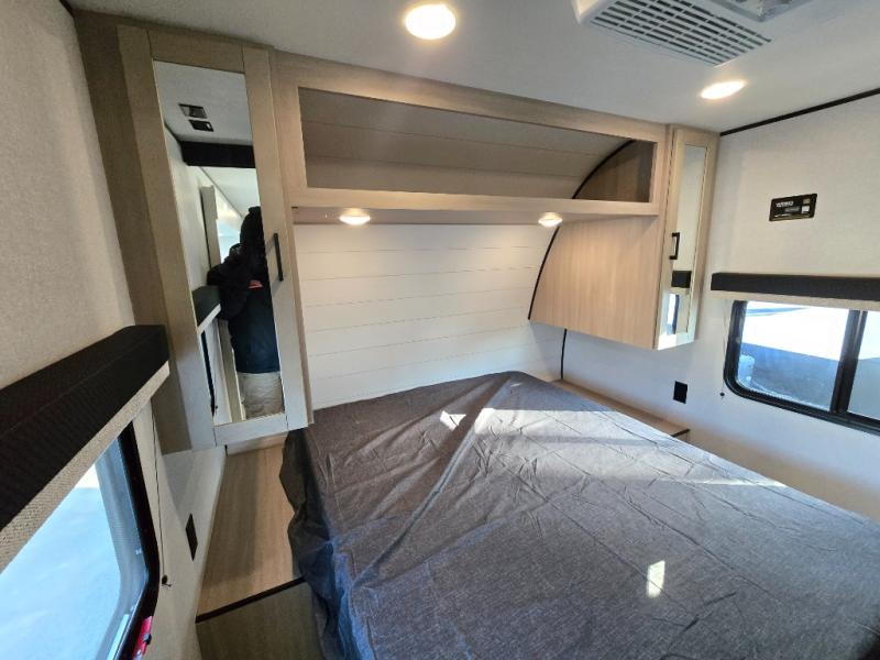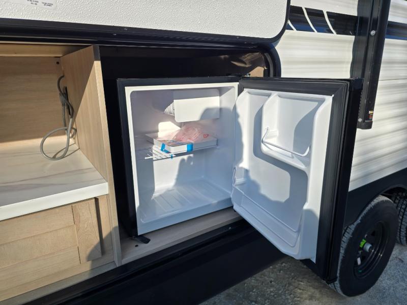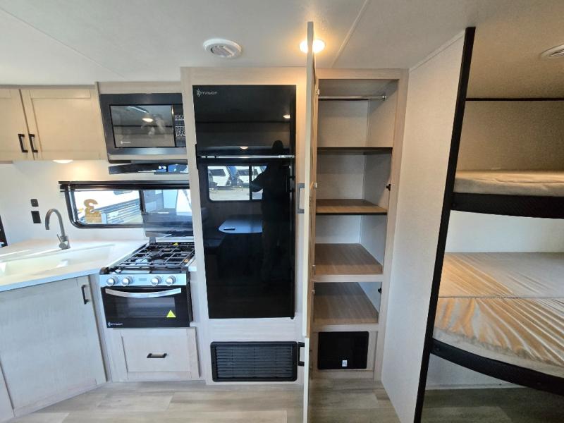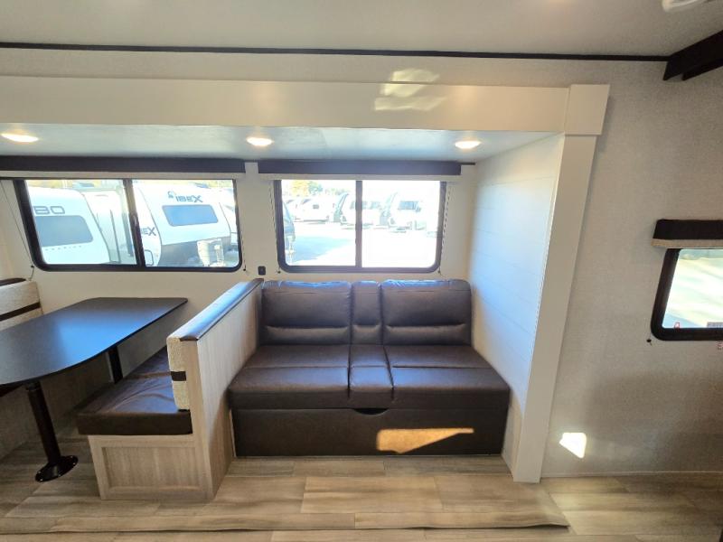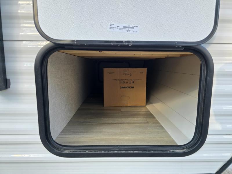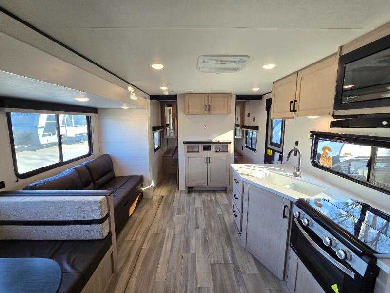 The whole gang will love weekends in the woods with this travel trailer in tow! There is a large slide out for added space, and here you'll find the jack-knife sofa and booth dinette. You can claim the front private bedroom to yourselves, while your guests or little ones take the double-size bunks. A full kitchen is complete with a three-burner cooktop and microwave oven to make meals each day, plus a 12V refrigerator and pantry for food storage. This unit also includes an outdoor kitchen with a refrigerator to keep cold drinks ready to enjoy!
