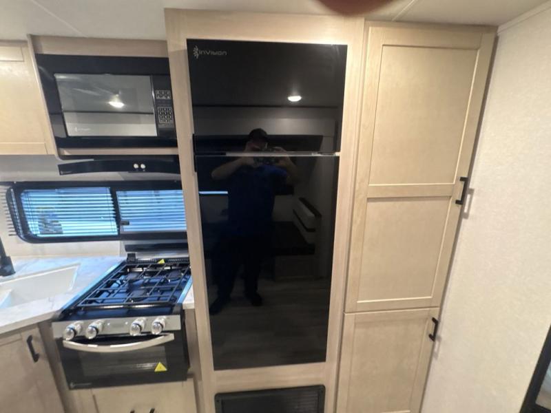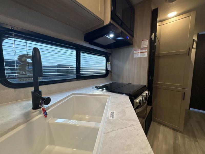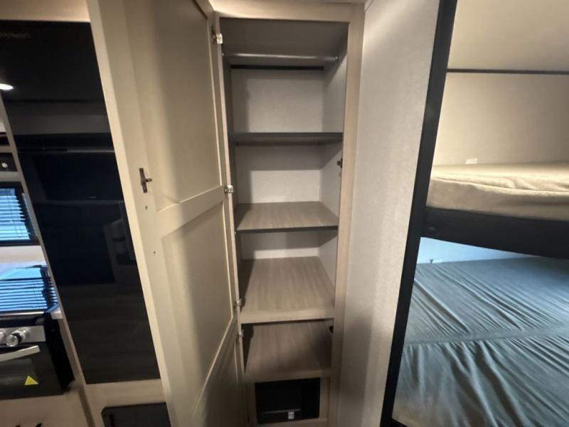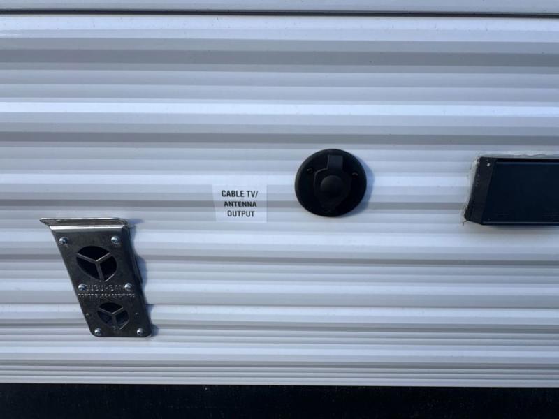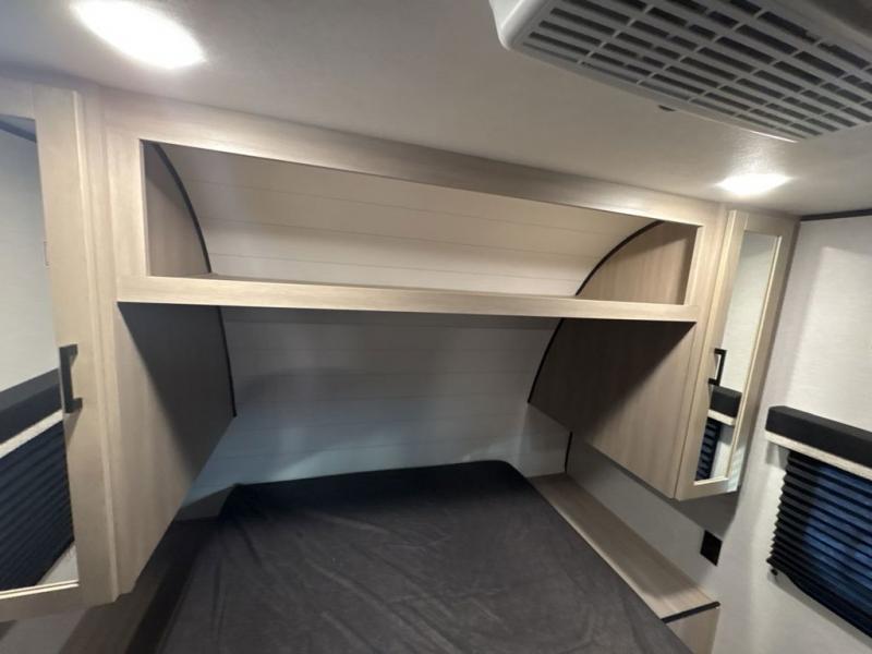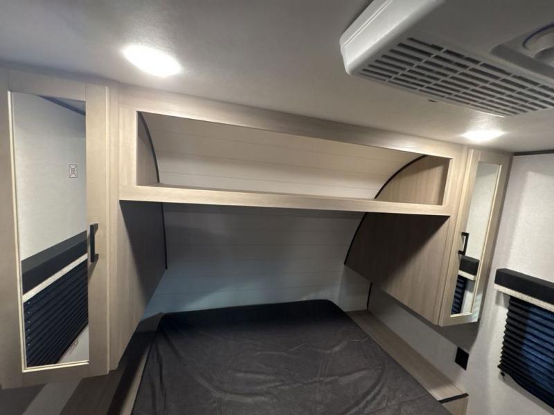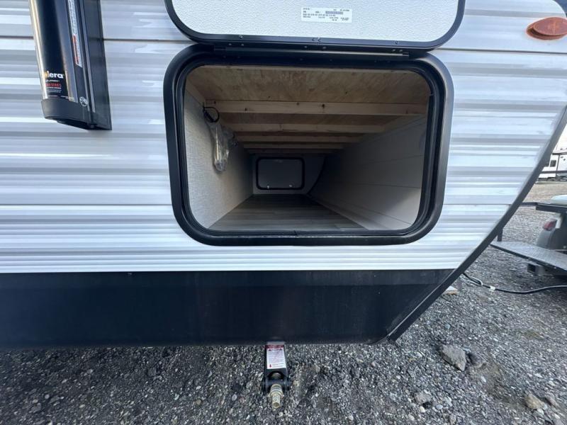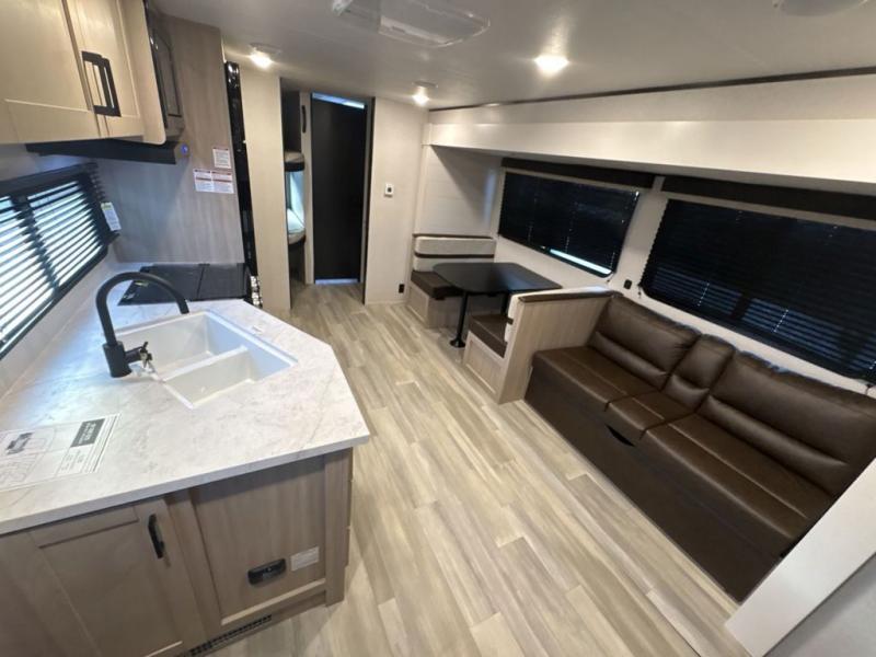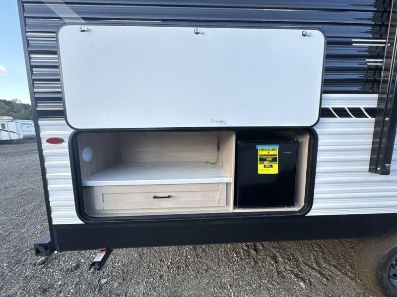 The whole gang will love weekends in the woods with this travel trailer in tow! There is a large slide out for added space, and here you'll find the jack-knife sofa and booth dinette. You can claim the front private bedroom to yourselves, while your guests or little ones take the double-size bunks. A full kitchen is complete with a three-burner cooktop and microwave oven to make meals each day, plus a 12V refrigerator and pantry for food storage. This unit also includes an outdoor kitchen with a refrigerator to keep cold drinks ready to enjoy!