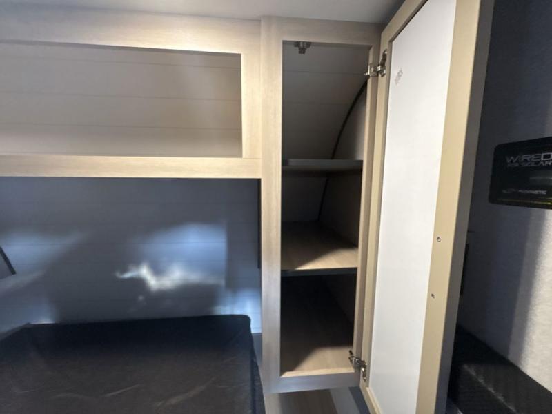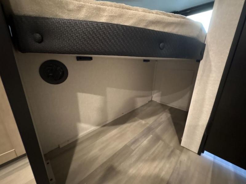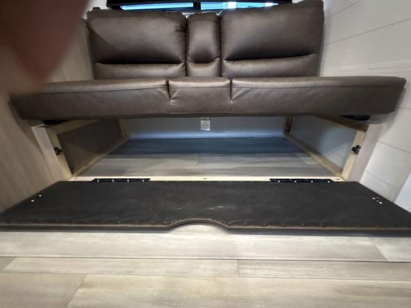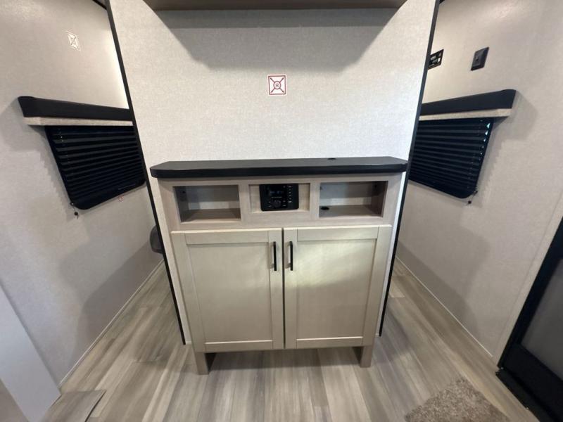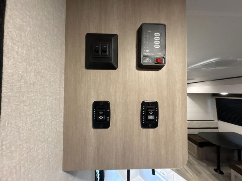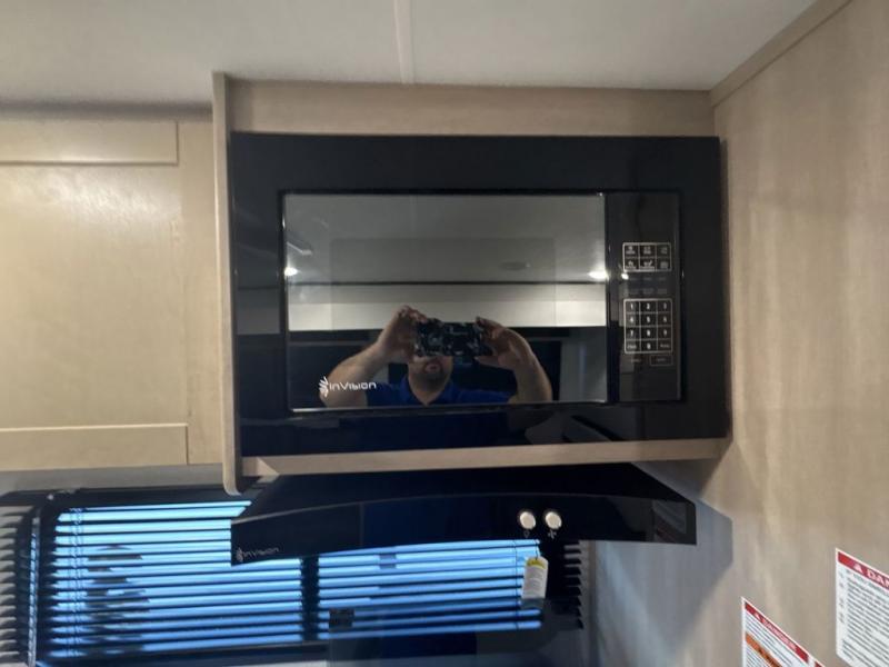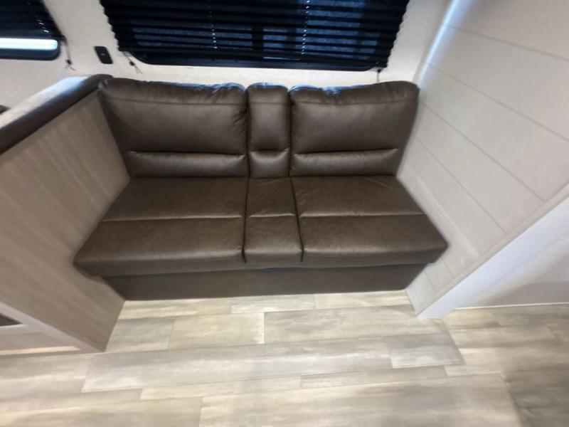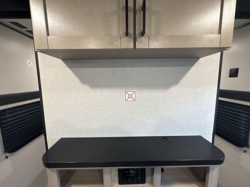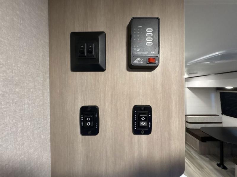 The whole gang will love weekends in the woods with this travel trailer in tow! There is a large slide out for added space, and here you'll find the jack-knife sofa and booth dinette. You can claim the front private bedroom to yourselves, while your guests or little ones take the double-size bunks. A full kitchen is complete with a three-burner cooktop and microwave oven to make meals each day, plus a 12V refrigerator and pantry for food storage. This unit also includes an outdoor kitchen with a refrigerator to keep cold drinks ready to enjoy!