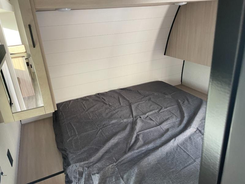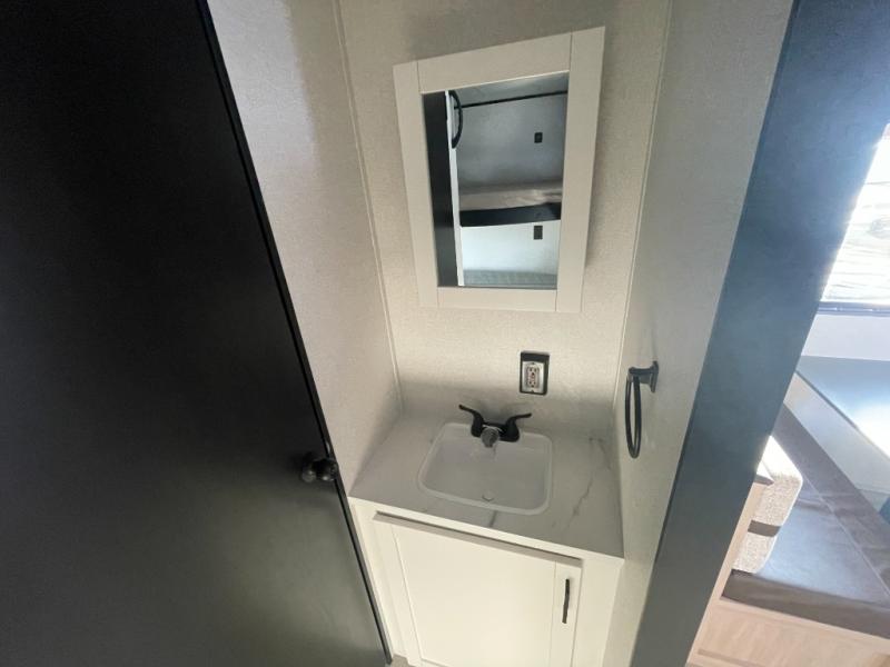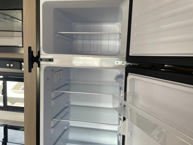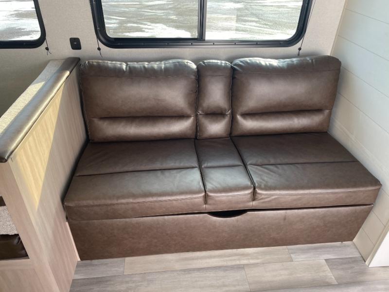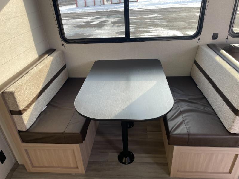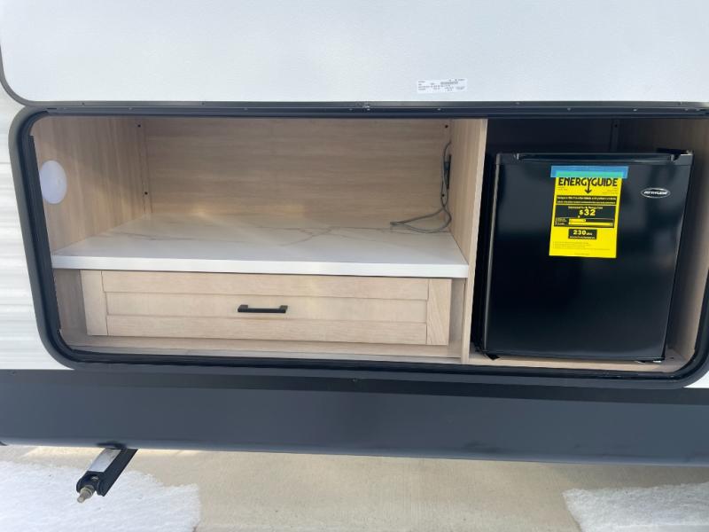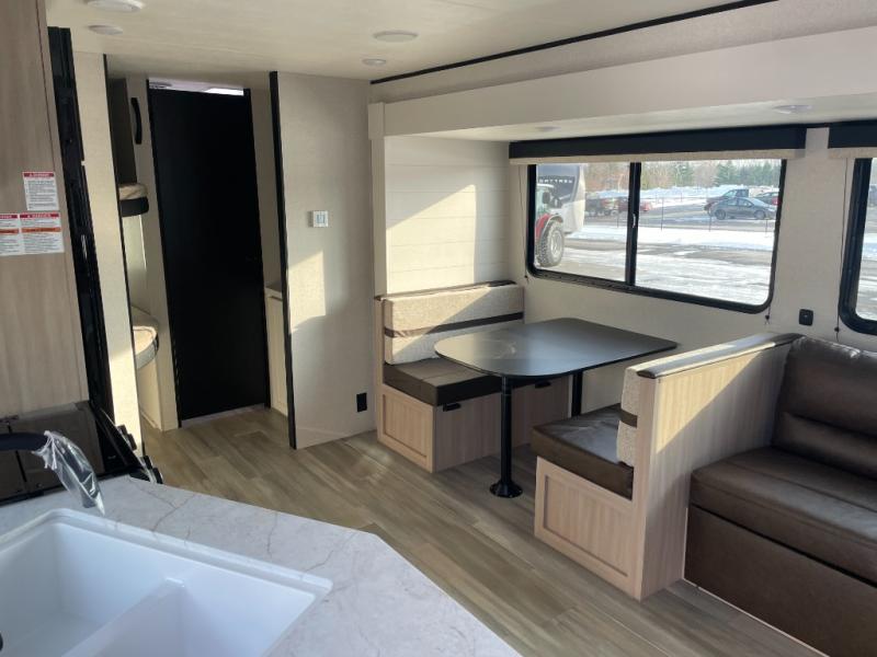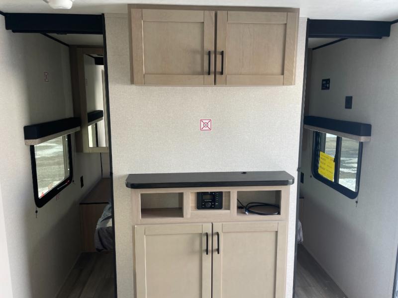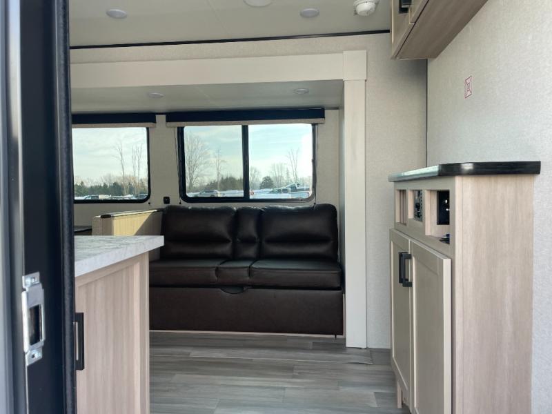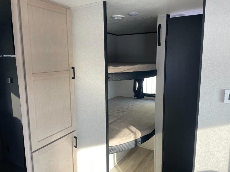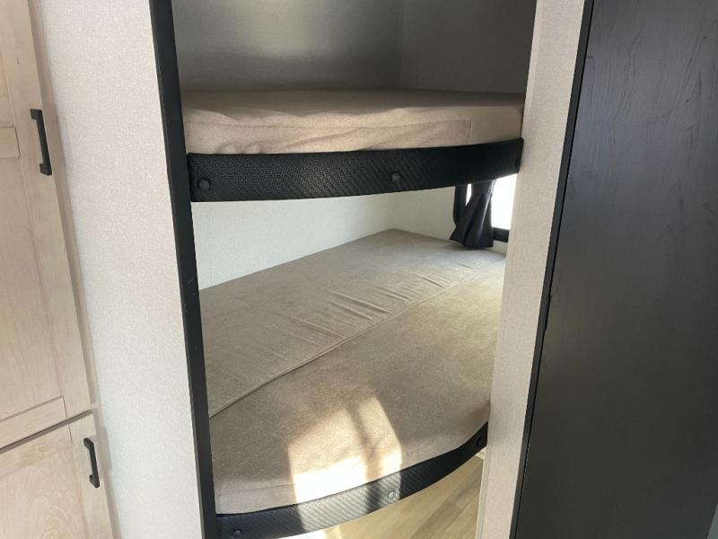 The whole gang will love weekends in the woods with this travel trailer in tow! There is a large slide out for added space, and here you'll find the jack-knife sofa and booth dinette. You can claim the front private bedroom to yourselves, while your guests or little ones take the double-size bunks. A full kitchen is complete with a three-burner cooktop and microwave oven to make meals each day, plus a 12V refrigerator and pantry for food storage. This unit also includes an outdoor kitchen with a refrigerator to keep cold drinks ready to enjoy!