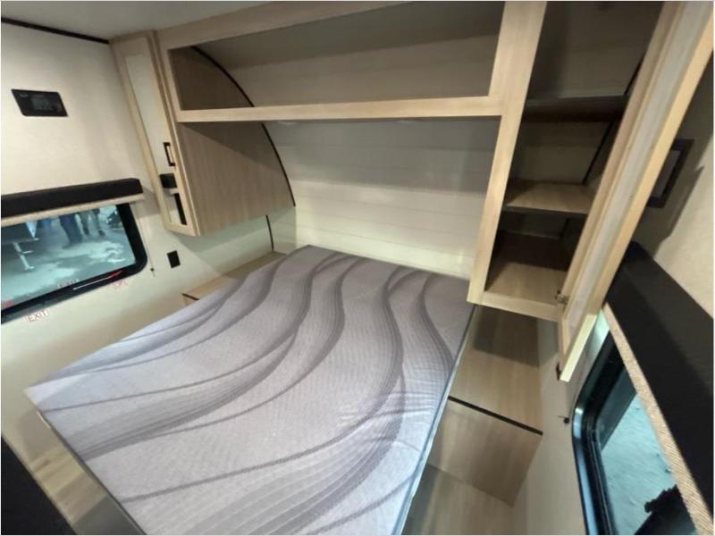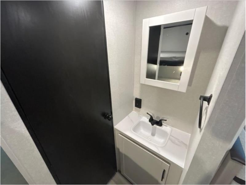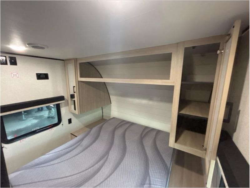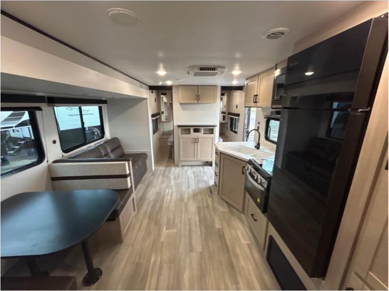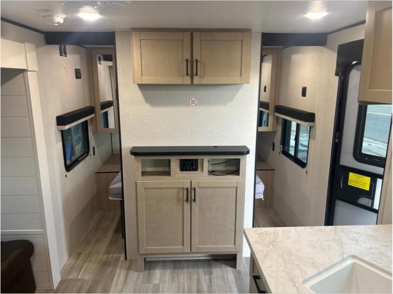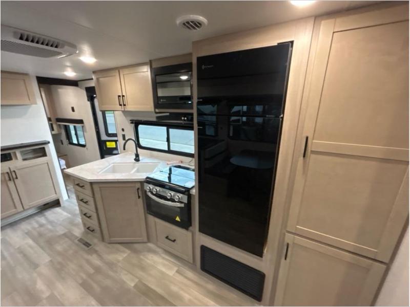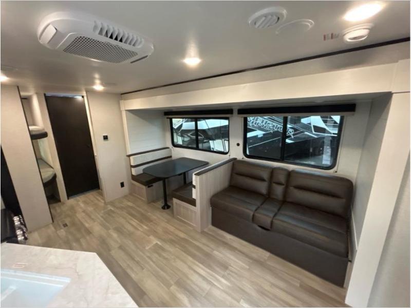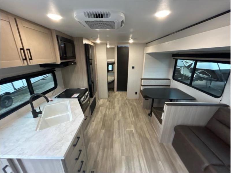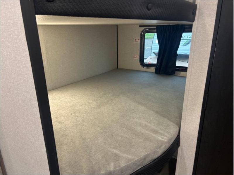 The whole gang will love weekends in the woods with this travel trailer in tow! There is a large slide out for added space, and here you'll find the jack-knife sofa and booth dinette. You can claim the front private bedroom to yourselves, while your guests or little ones take the double-size bunks. A full kitchen is complete with a three-burner cooktop and microwave oven to make meals each day, plus a 12V refrigerator and pantry for food storage. This unit also includes an outdoor kitchen with a refrigerator to keep cold drinks ready to enjoy!