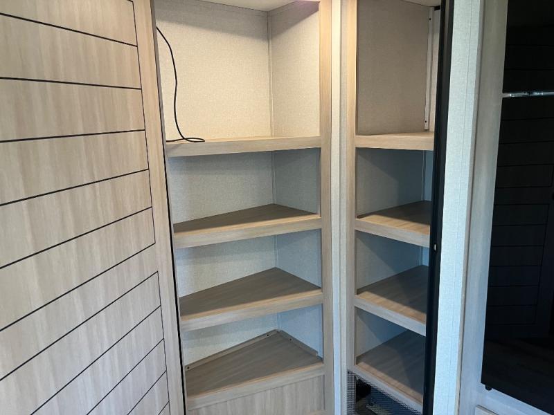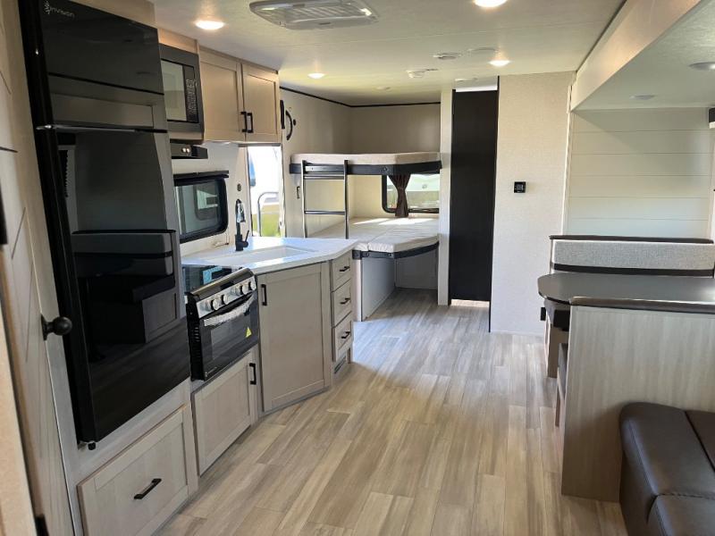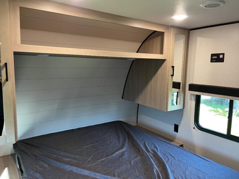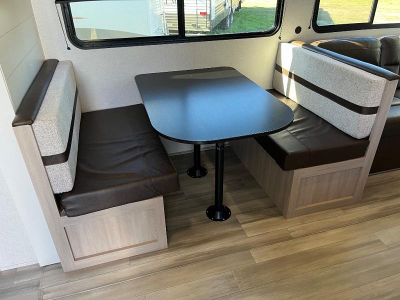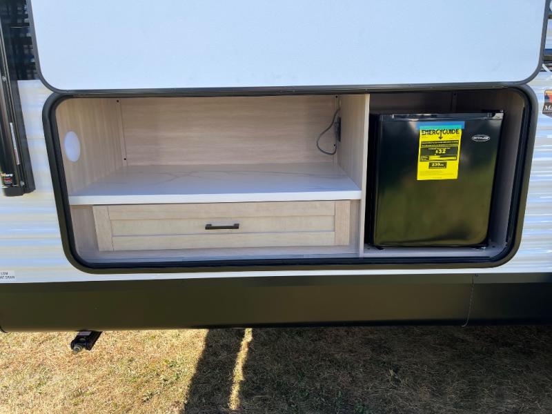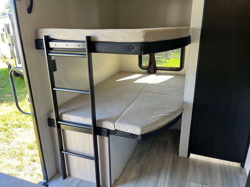 The whole gang will love weekends in the woods with this travel trailer in tow! There is a large slide out for added space, and here you'll find the jack-knife sofa and booth dinette. There is also an entertainment center with a fireplace with a hidden pantry behind, along with storage shelves for snacks, board games and more! You can claim the front private bedroom to yourselves, while your guests or little ones take the double-size bunks. A full kitchen is complete with a three-burner cooktop and microwave oven to make meals each day, plus a 12V refrigerator and pantry for food storage. This unit also includes an outdoor kitchen with a refrigerator to keep cold drinks ready to enjoy!