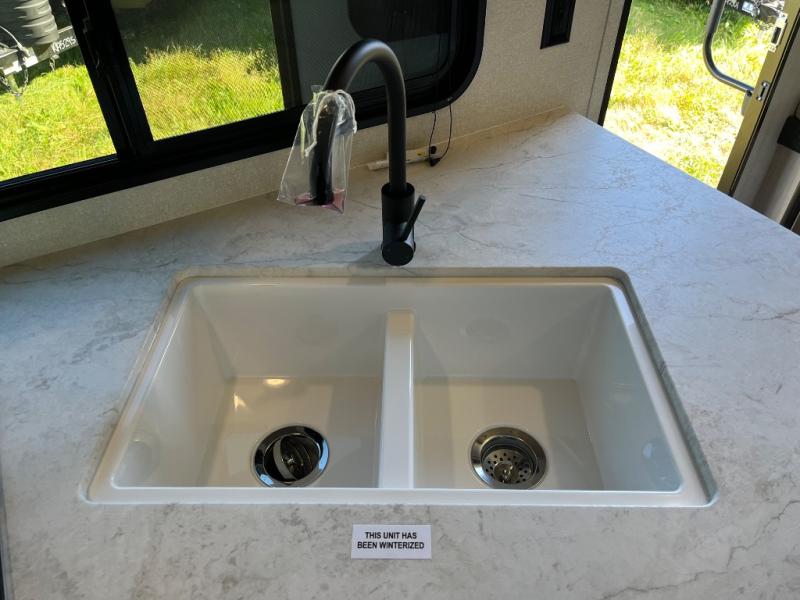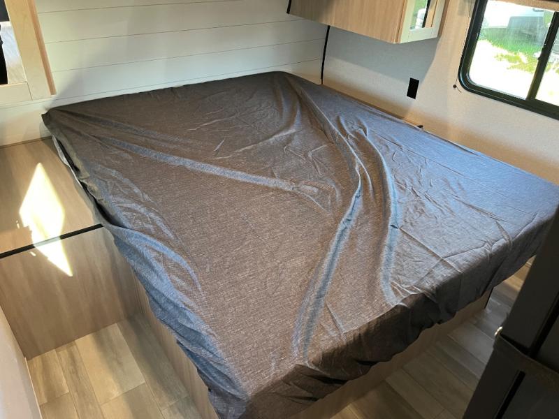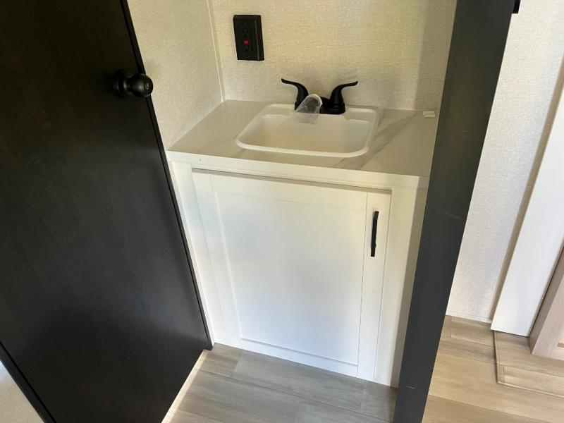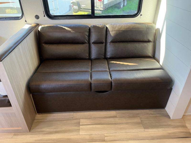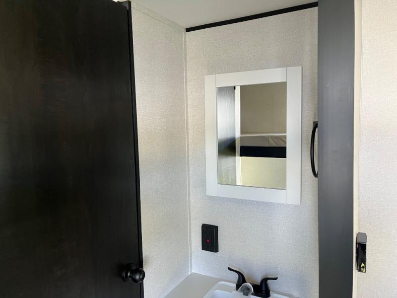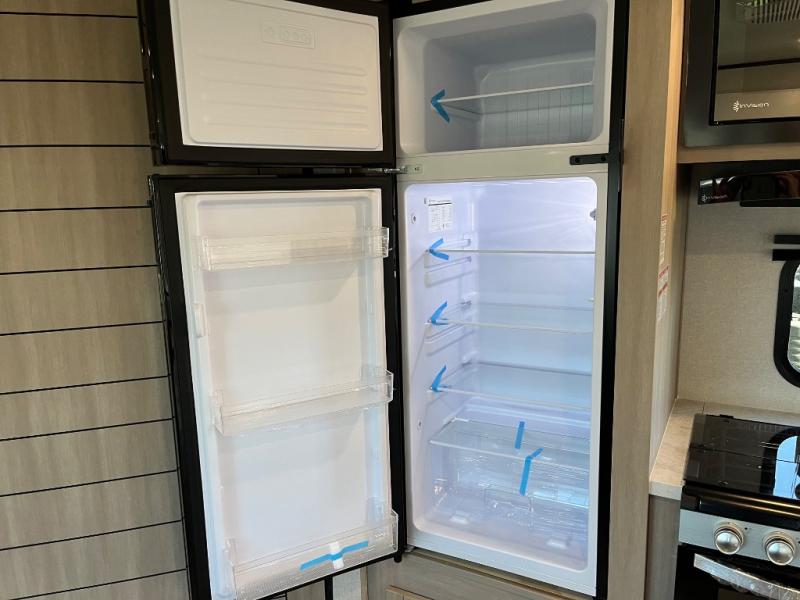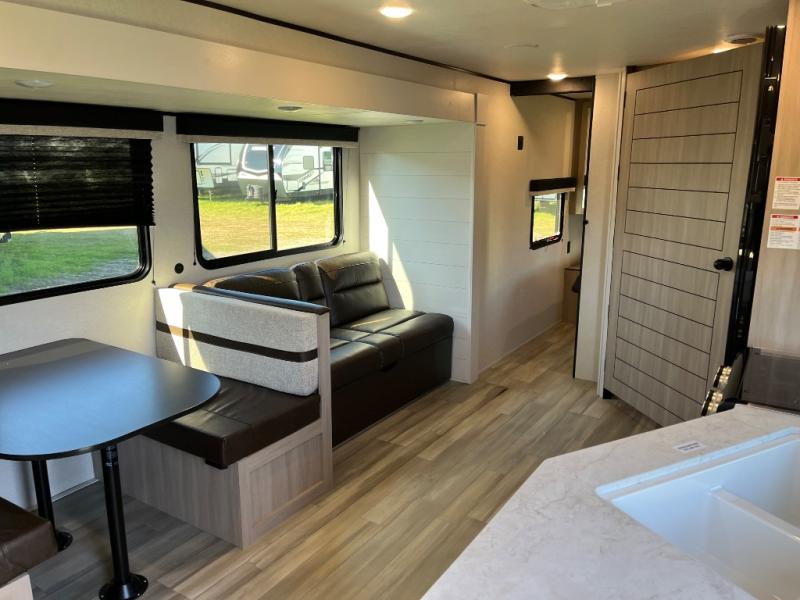 The whole gang will love weekends in the woods with this travel trailer in tow! There is a large slide out for added space, and here you'll find the jack-knife sofa and booth dinette. There is also an entertainment center with a fireplace with a hidden pantry behind, along with storage shelves for snacks, board games and more! You can claim the front private bedroom to yourselves, while your guests or little ones take the double-size bunks. A full kitchen is complete with a three-burner cooktop and microwave oven to make meals each day, plus a 12V refrigerator and pantry for food storage. This unit also includes an outdoor kitchen with a refrigerator to keep cold drinks ready to enjoy!