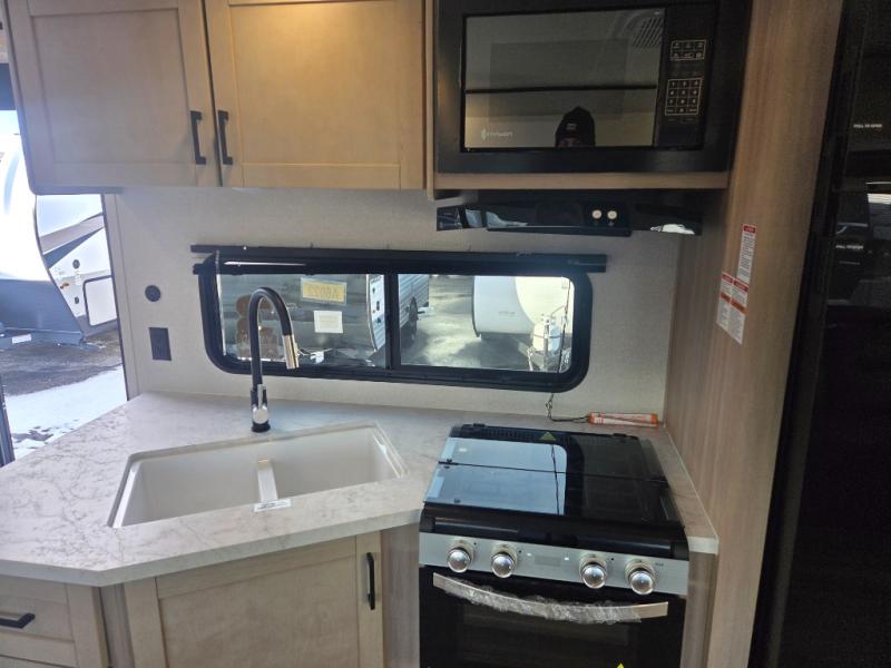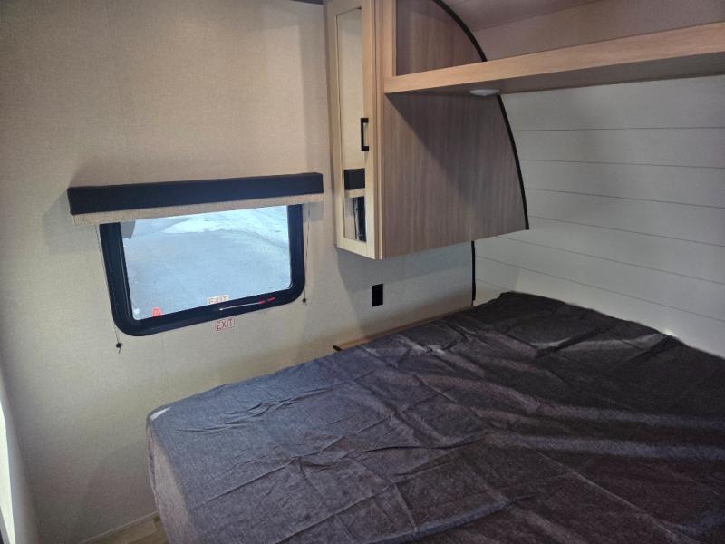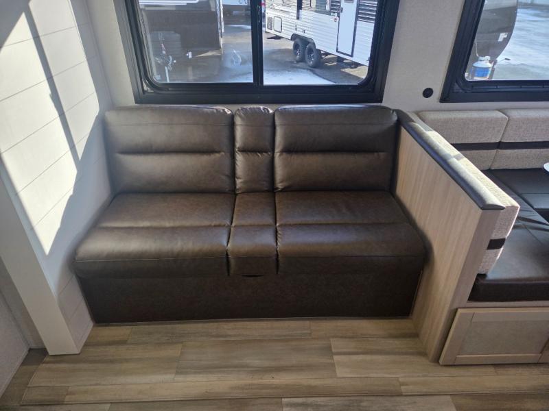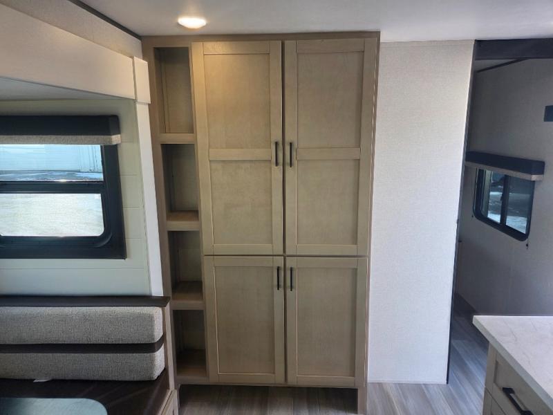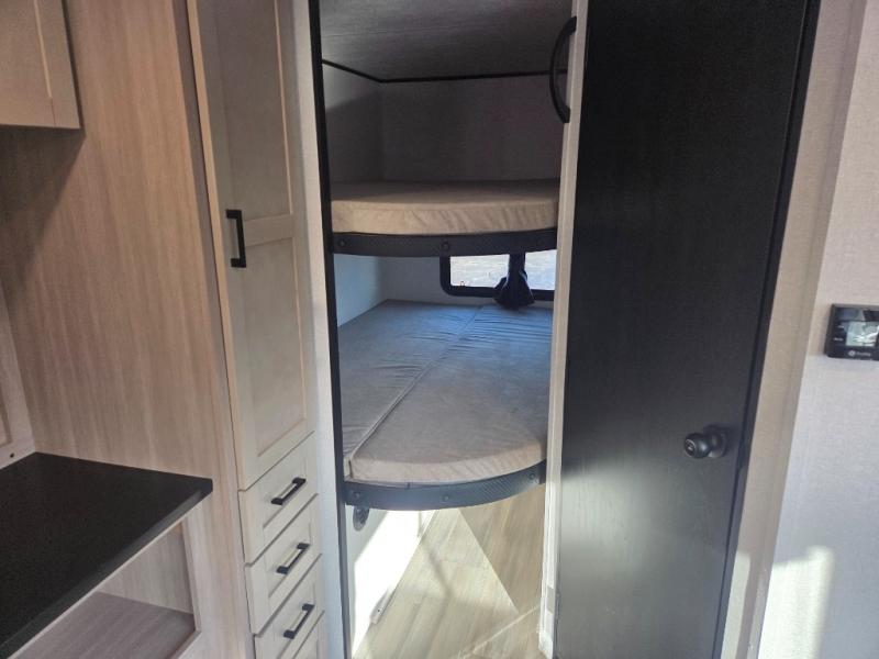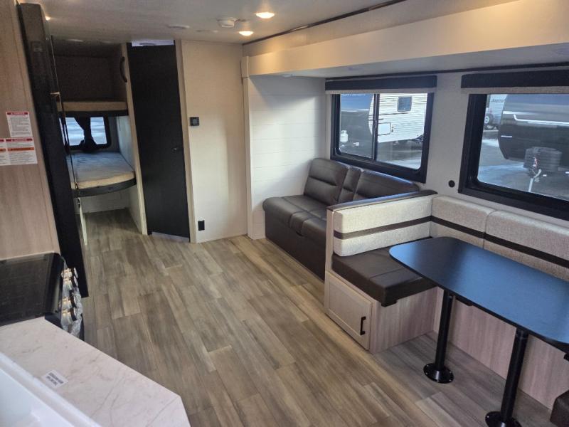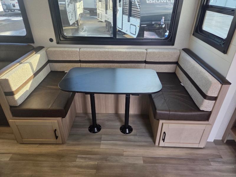 The whole gang will love weekends in the woods with this travel trailer in tow! There is a large slide out for added space, and here you'll find the jack-knife sofa and U-shaped dinette. There is also an entertainment center with a fireplace for cozy evenings indoors, and you'll appreciate the storage cabinet and shelves for board games, movies and more! You can claim the front private bedroom to yourselves, while your guests or little ones take the double-size bunks. A full kitchen is complete with a three-burner cooktop and microwave oven to make meals each day, plus a 12V refrigerator for food storage. This unit also includes an outdoor kitchen with a refrigerator to keep cold drinks ready to enjoy!