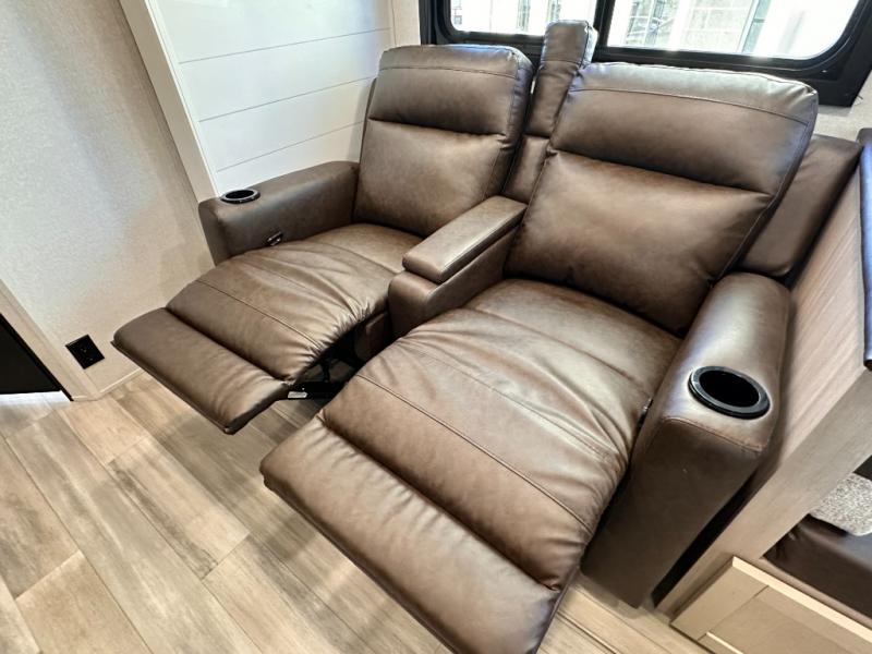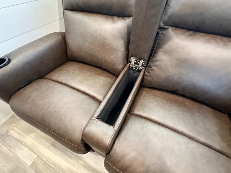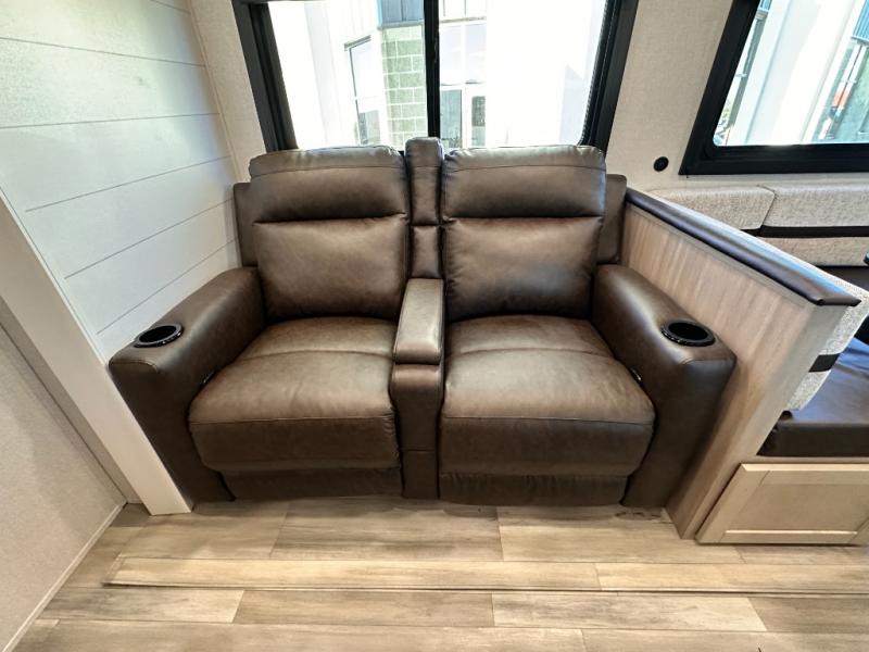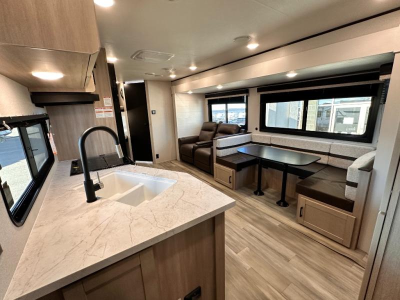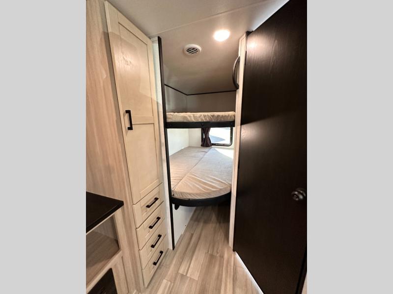 The whole gang will love weekends in the woods with this travel trailer in tow! There is a large slide out for added space, and here you'll find the jack-knife sofa and U-shaped dinette. There is also an entertainment center with a fireplace for cozy evenings indoors, and you'll appreciate the storage cabinet and shelves for board games, movies and more! You can claim the front private bedroom to yourselves, while your guests or little ones take the double-size bunks. A full kitchen is complete with a three-burner cooktop and microwave oven to make meals each day, plus a 12V refrigerator for food storage. This unit also includes an outdoor kitchen with a refrigerator to keep cold drinks ready to enjoy!