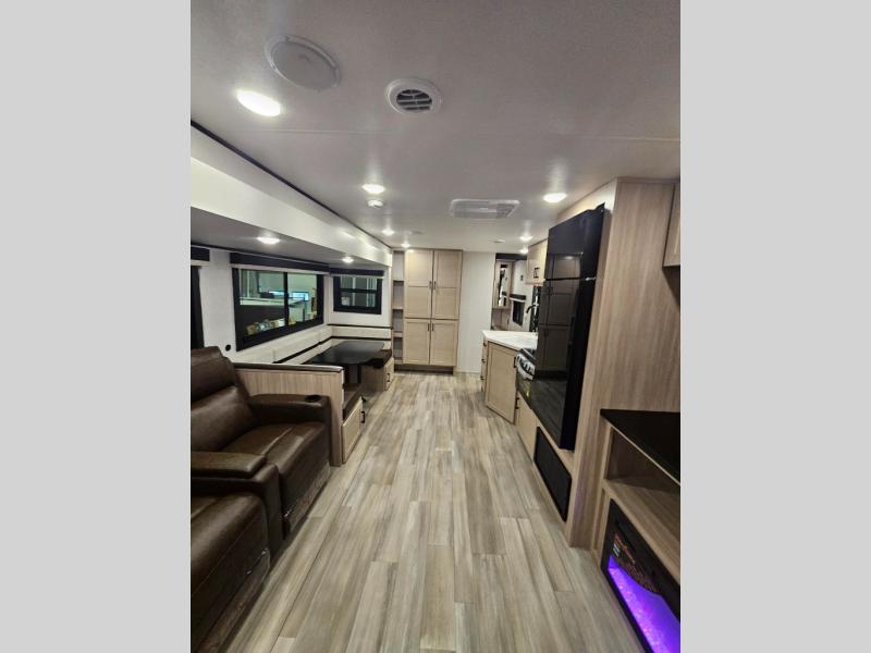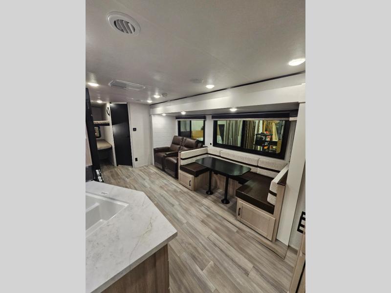 The whole gang will love weekends in the woods with this travel trailer in tow! There is a large slide out for added space, and here you'll find the jack-knife sofa and U-shaped dinette. There is also an entertainment center with a fireplace for cozy evenings indoors, and you'll appreciate the storage cabinet and shelves for board games, movies and more! You can claim the front private bedroom to yourselves, while your guests or little ones take the double-size bunks. A full kitchen is complete with a three-burner cooktop and microwave oven to make meals each day, plus a 12V refrigerator for food storage. This unit also includes an outdoor kitchen with a refrigerator to keep cold drinks ready to enjoy!