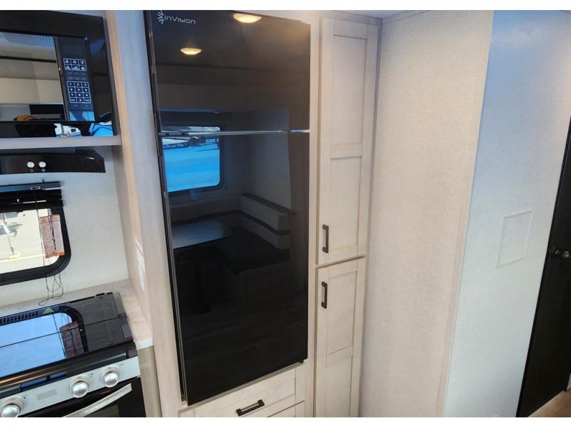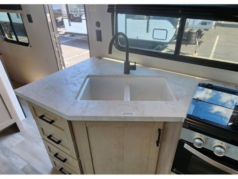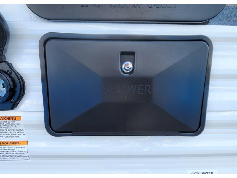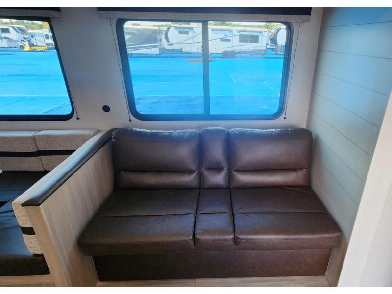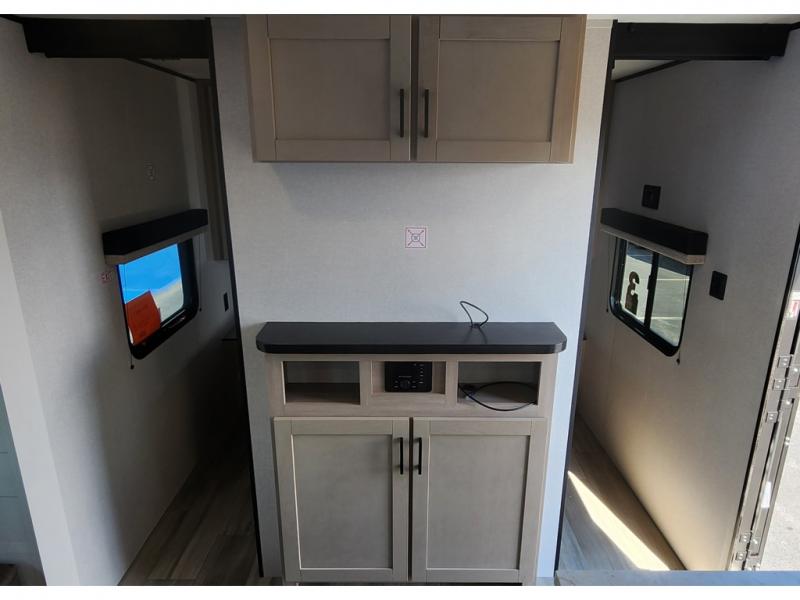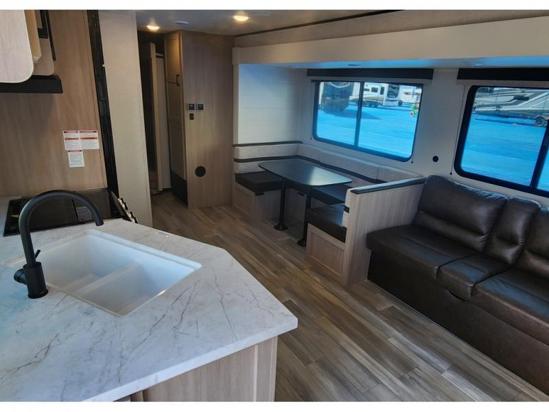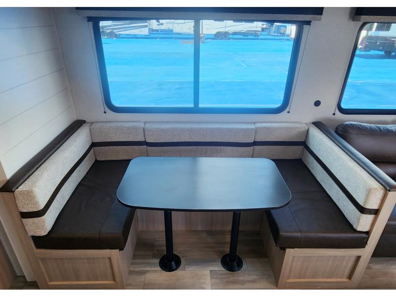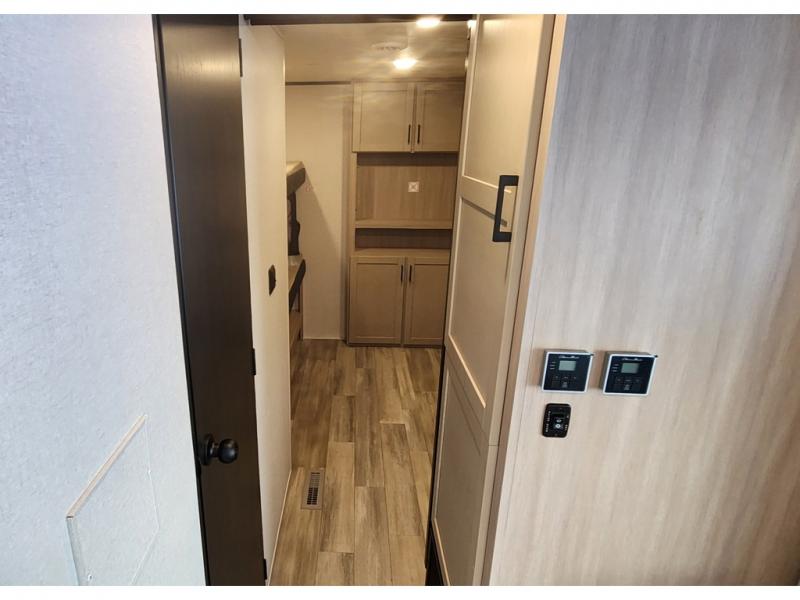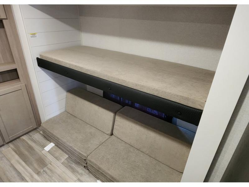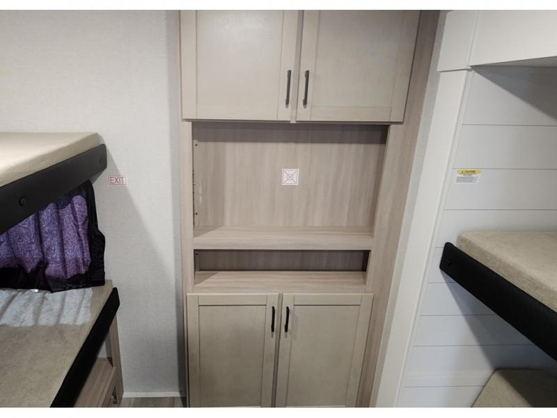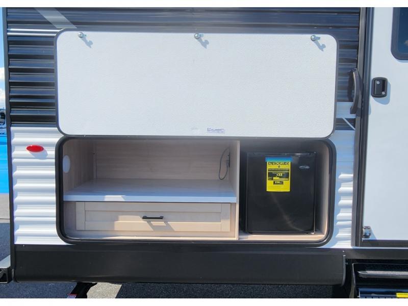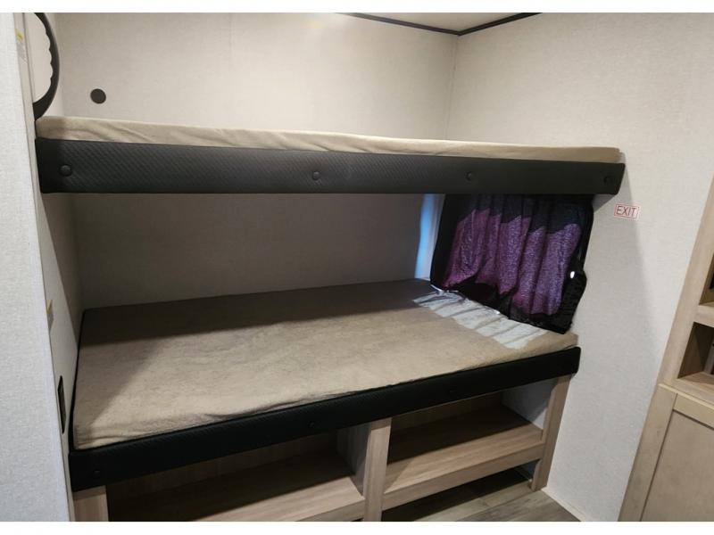 You'll enjoy more space and more fun in this travel trailer with double slides, a private bunkhouse, and an outdoor kitchen with a refrigerator. The bunkhouse includes a set of bunk beds across from a third bunk and a J-cube sofa within a slide. There is also an entertainment center here and a fireplace to make this space cozier. And the full bath with its own exterior entry door is close by the bunkhouse for easy nighttime use! The second slide out is found in the combined kitchen and living room, which houses the U-shaped dinette and jack-knife sofa. Since you'll be camping with a larger group of friends or family, the front private bedroom with an RV queen bed and dual wardrobes will provide you with privacy each night!