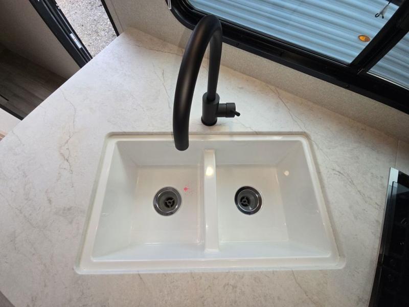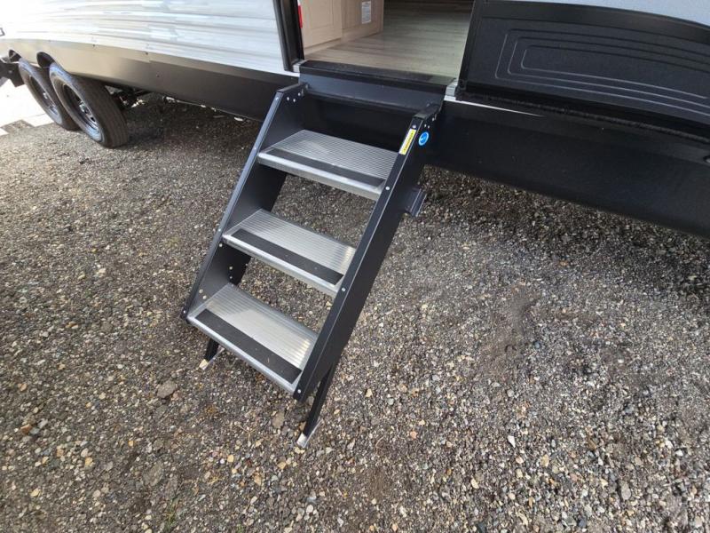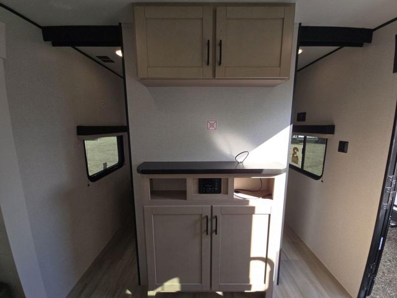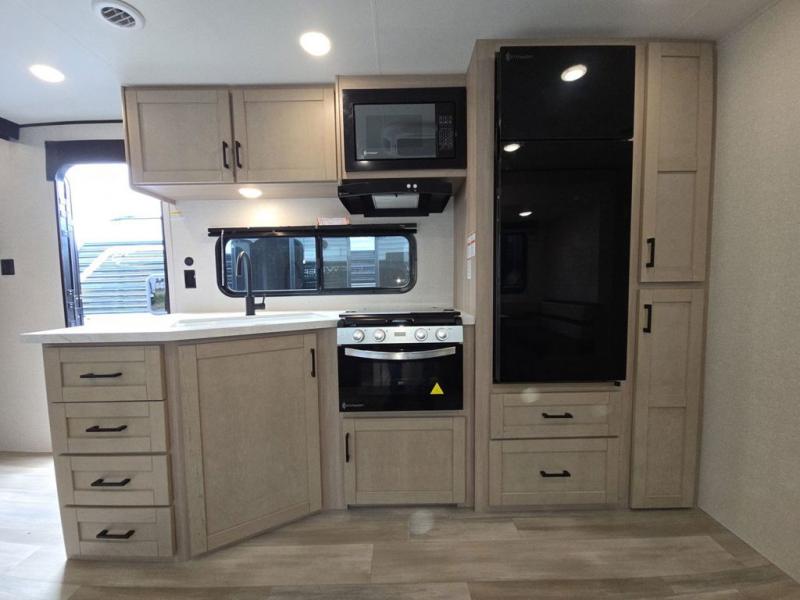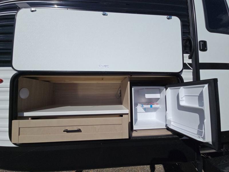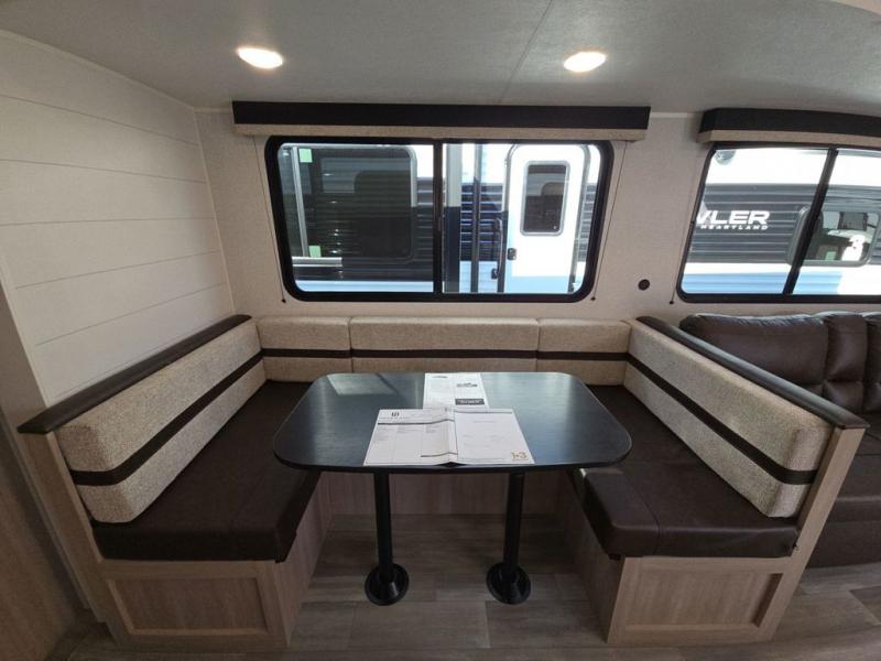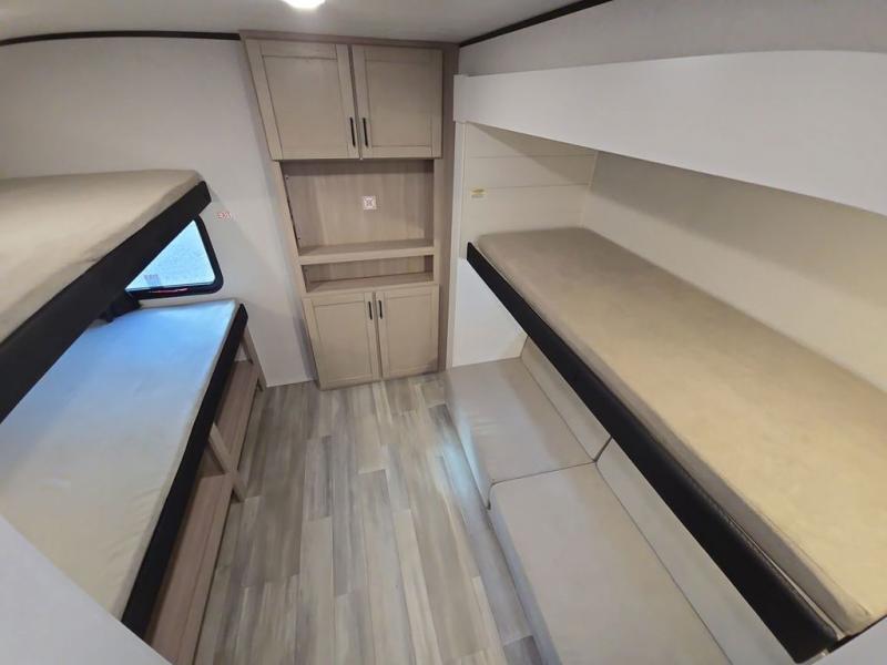 You'll enjoy more space and more fun in this travel trailer with double slides, a private bunkhouse, and an outdoor kitchen with a refrigerator. The bunkhouse includes a set of bunk beds across from a third bunk and a J-cube sofa within a slide. There is also an entertainment center here and a fireplace to make this space cozier. And the full bath with its own exterior entry door is close by the bunkhouse for easy nighttime use! The second slide out is found in the combined kitchen and living room, which houses the U-shaped dinette and jack-knife sofa. Since you'll be camping with a larger group of friends or family, the front private bedroom with an RV queen bed and dual wardrobes will provide you with privacy each night!
