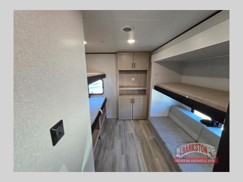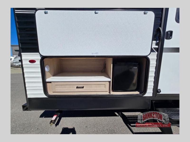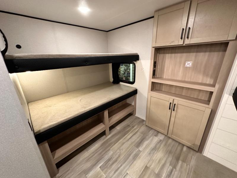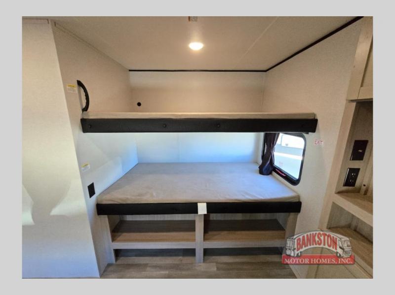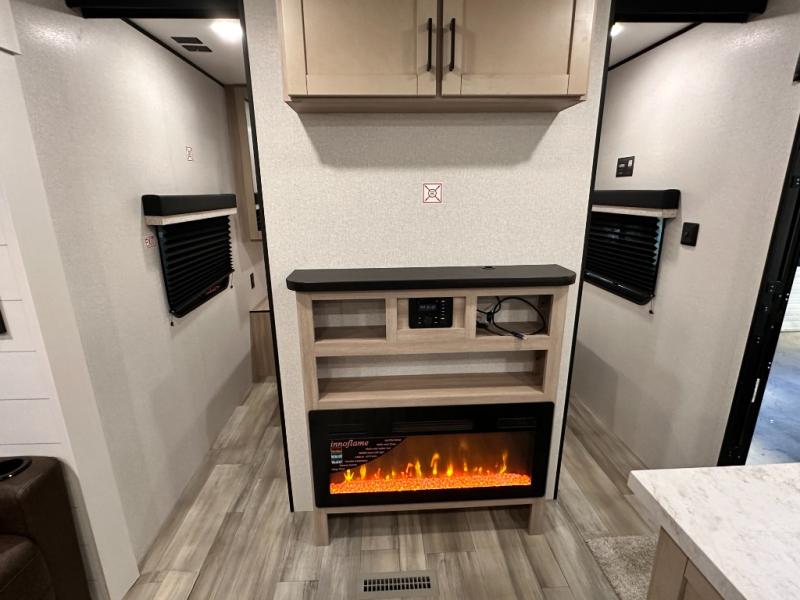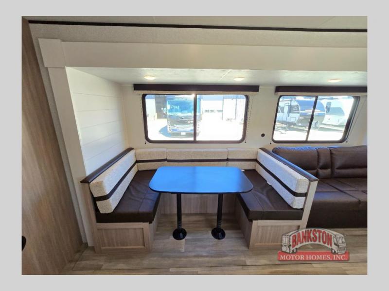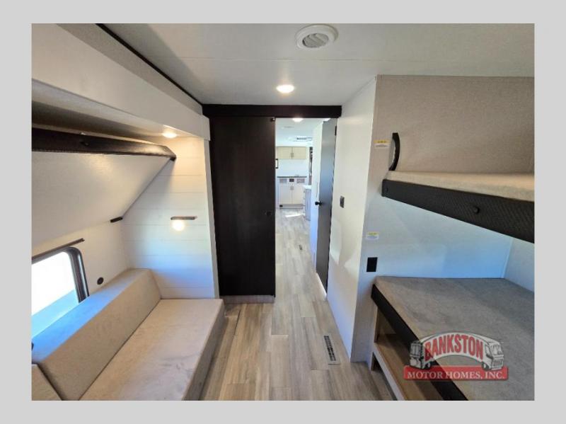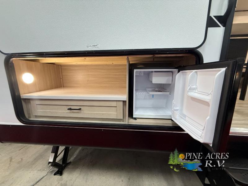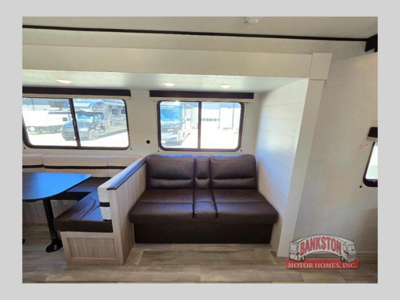 You'll enjoy more space and more fun in this travel trailer with double slides, a private bunkhouse, and an outdoor kitchen with a refrigerator. The bunkhouse includes a set of bunk beds across from a third bunk and a J-cube sofa within a slide. There is also an entertainment center here and a fireplace to make this space cozier. And the full bath with its own exterior entry door is close by the bunkhouse for easy nighttime use! The second slide out is found in the combined kitchen and living room, which houses the U-shaped dinette and jack-knife sofa. Since you'll be camping with a larger group of friends or family, the front private bedroom with an RV queen bed and dual wardrobes will provide you with privacy each night!