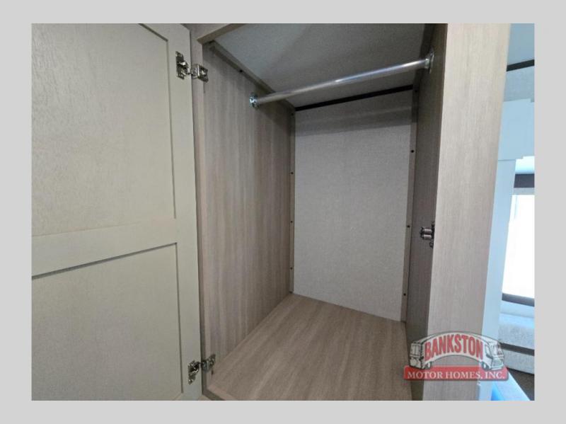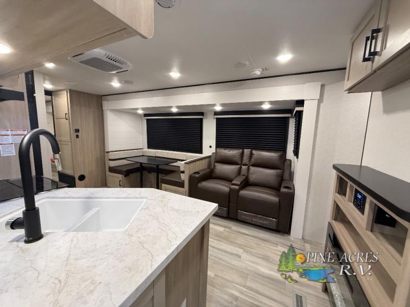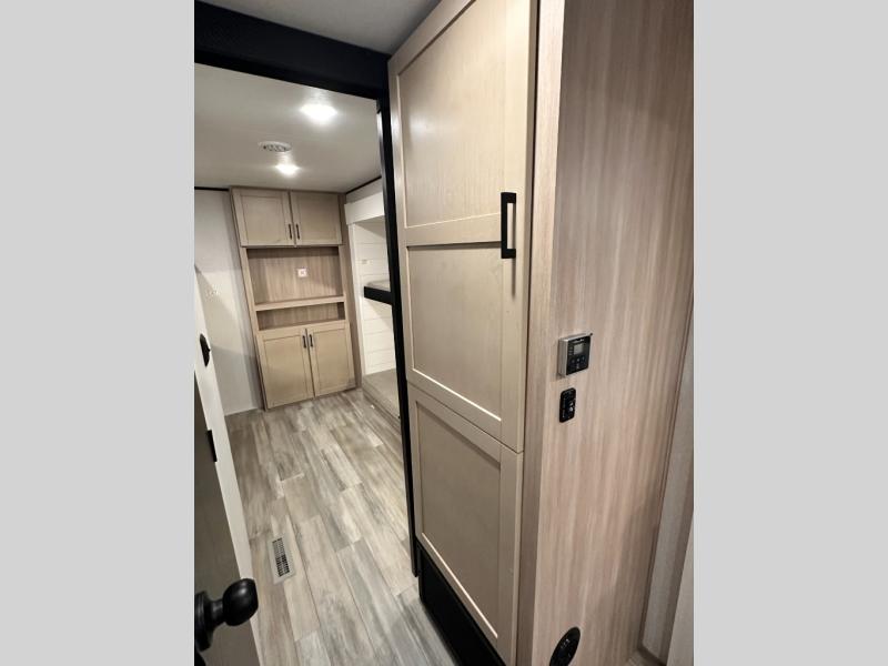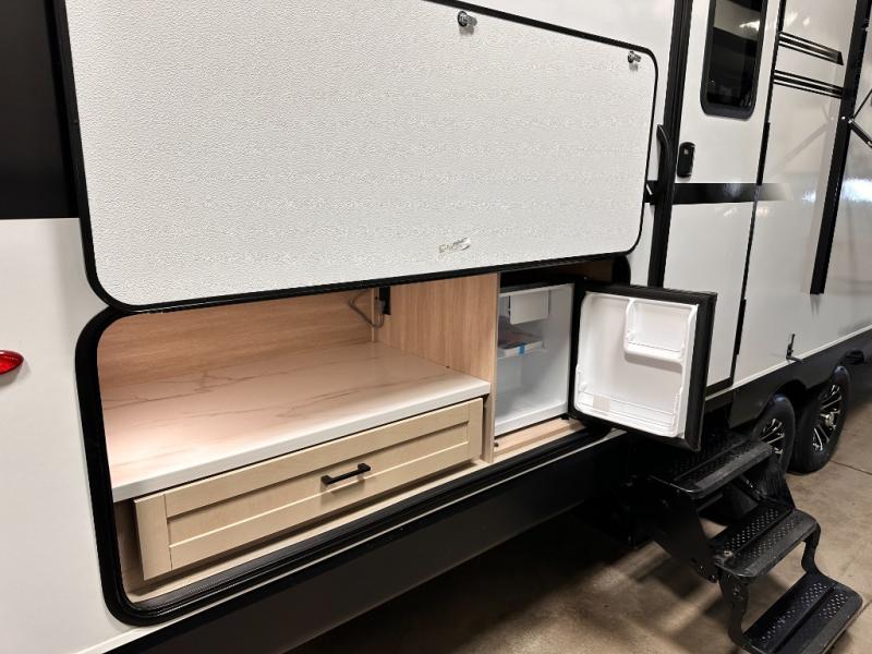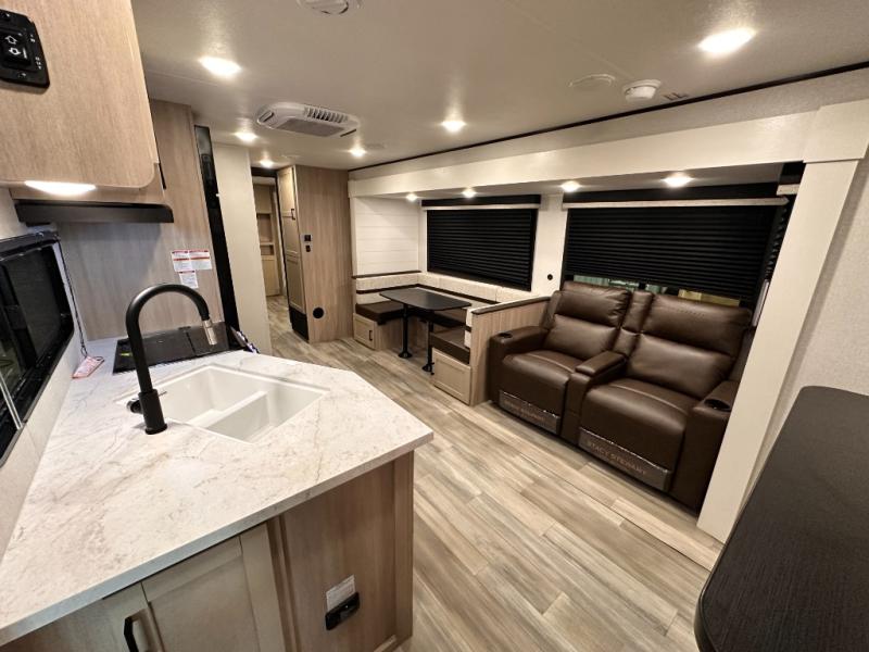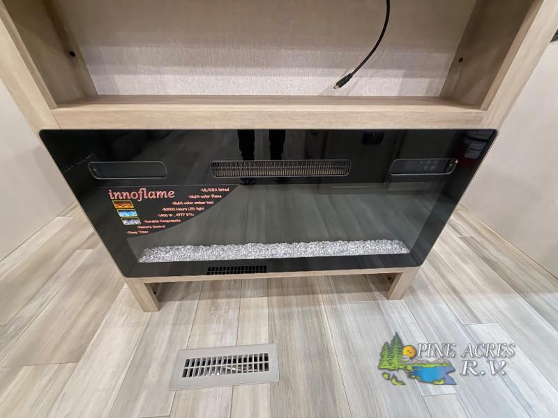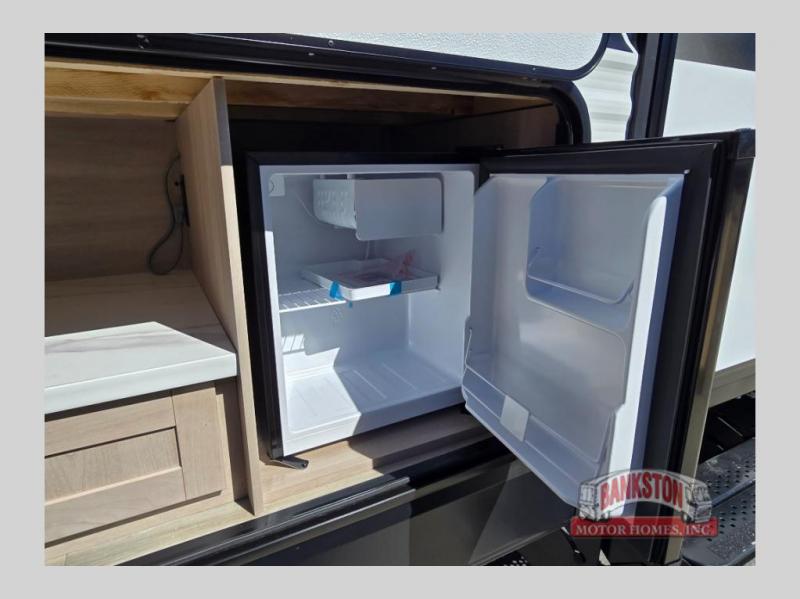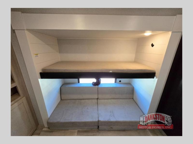 You'll enjoy more space and more fun in this travel trailer with double slides, a private bunkhouse, and an outdoor kitchen with a refrigerator. The bunkhouse includes a set of bunk beds across from a third bunk and a J-cube sofa within a slide. There is also an entertainment center here and a fireplace to make this space cozier. And the full bath with its own exterior entry door is close by the bunkhouse for easy nighttime use! The second slide out is found in the combined kitchen and living room, which houses the U-shaped dinette and jack-knife sofa. Since you'll be camping with a larger group of friends or family, the front private bedroom with an RV queen bed and dual wardrobes will provide you with privacy each night!