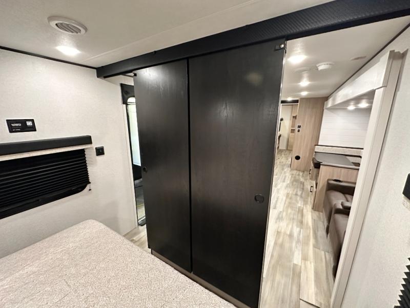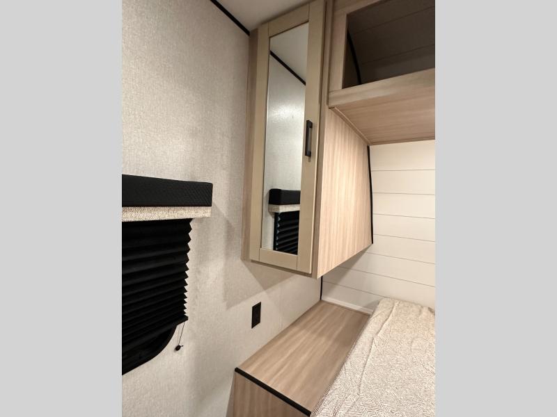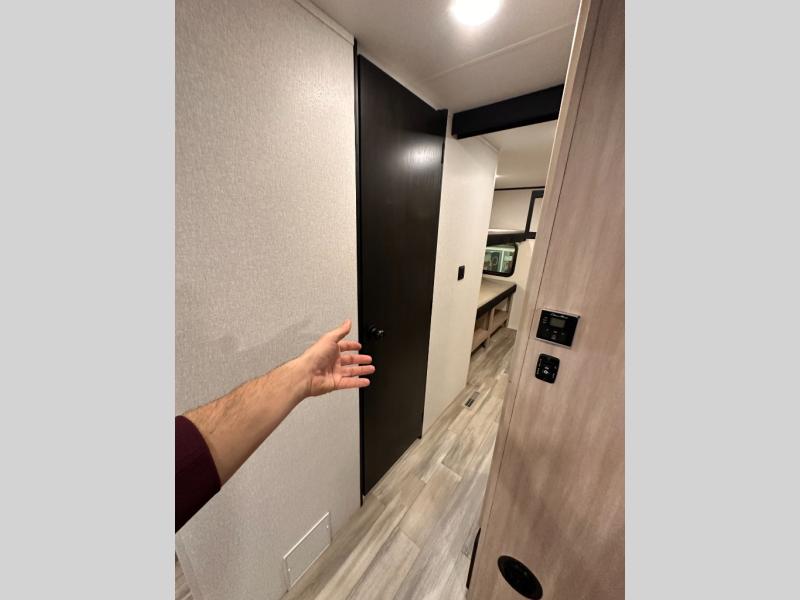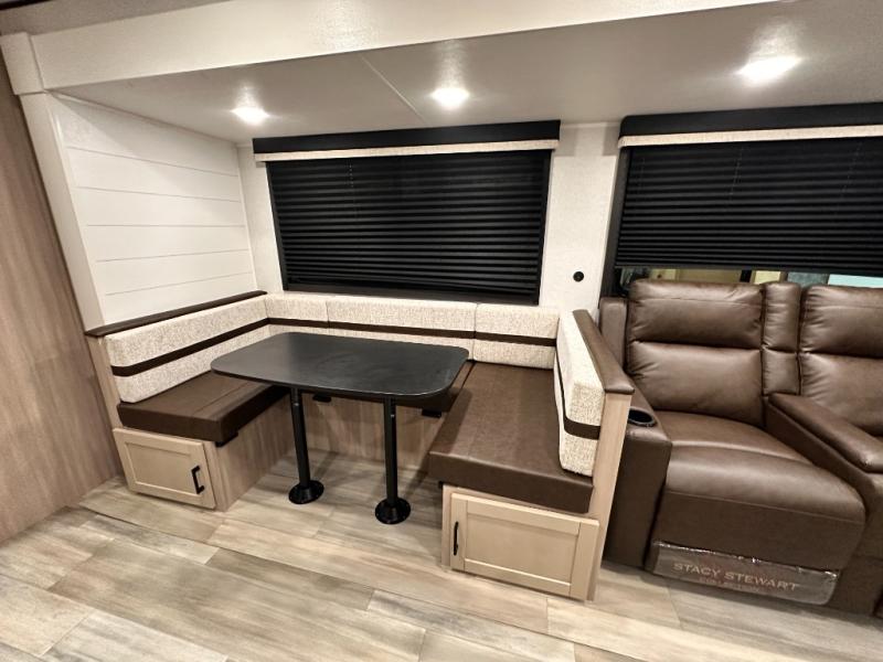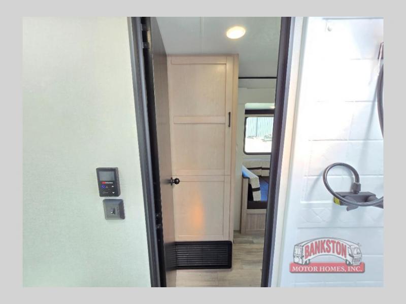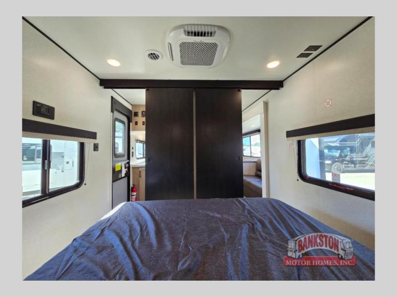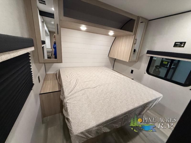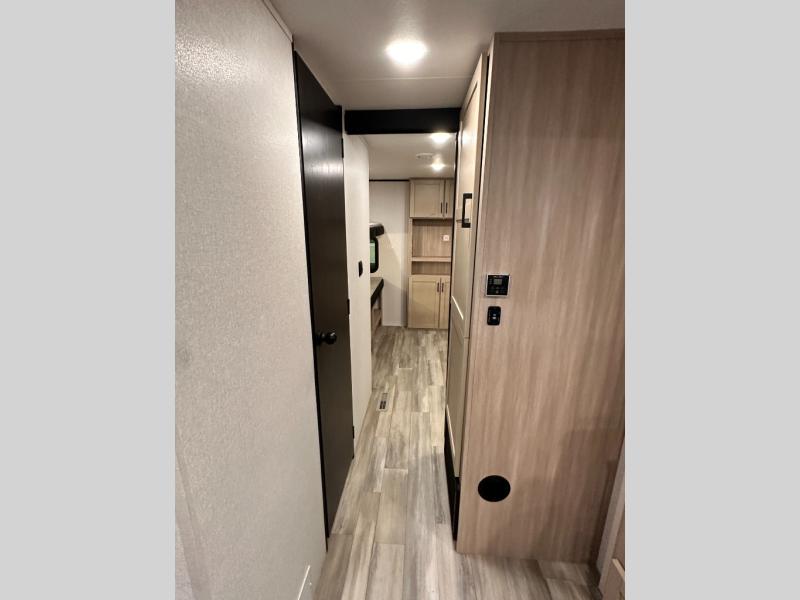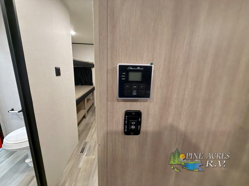 You'll enjoy more space and more fun in this travel trailer with double slides, a private bunkhouse, and an outdoor kitchen with a refrigerator. The bunkhouse includes a set of bunk beds across from a third bunk and a J-cube sofa within a slide. There is also an entertainment center here and a fireplace to make this space cozier. And the full bath with its own exterior entry door is close by the bunkhouse for easy nighttime use! The second slide out is found in the combined kitchen and living room, which houses the U-shaped dinette and jack-knife sofa. Since you'll be camping with a larger group of friends or family, the front private bedroom with an RV queen bed and dual wardrobes will provide you with privacy each night!