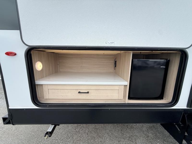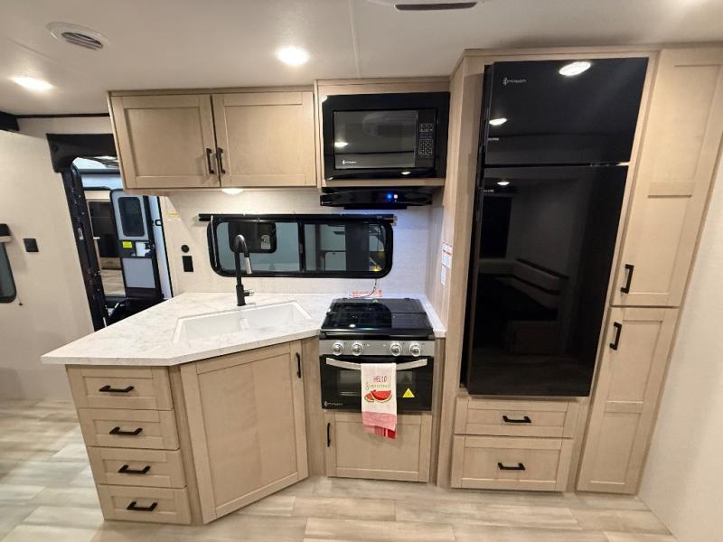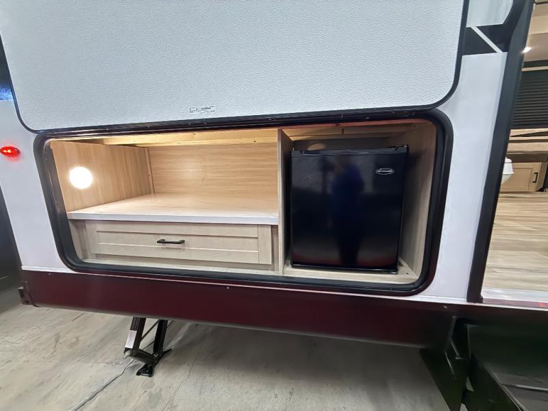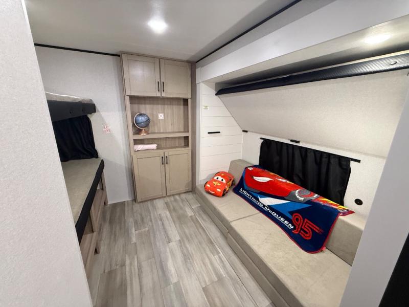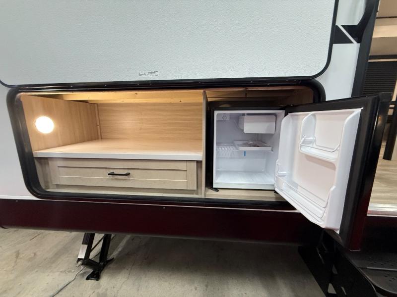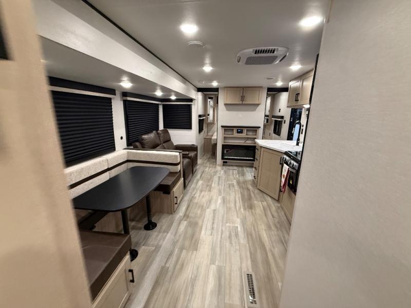You'll enjoy more space and more fun in this travel trailer with double slides, a private bunkhouse, and an outdoor kitchen with a refrigerator. The bunkhouse includes a set of bunk beds across from a third bunk and a J-cube sofa within a slide. There is also an entertainment center here and a fireplace to make this space cozier. And the full bath with its own exterior entry door is close by the bunkhouse for easy nighttime use! The second slide out is found in the combined kitchen and living room, which houses the U-shaped dinette and jack-knife sofa. Since you'll be camping with a larger group of friends or family, the front private bedroom with an RV queen bed and dual wardrobes will provide you with privacy each night!