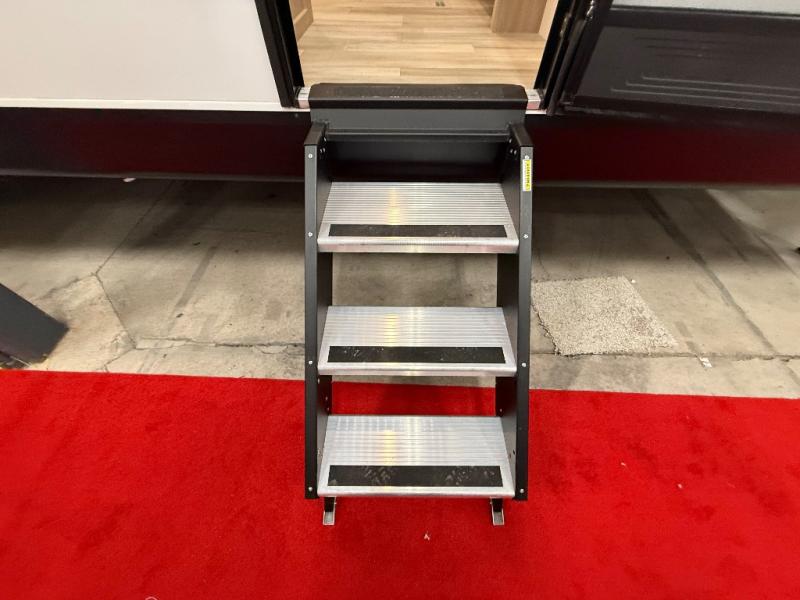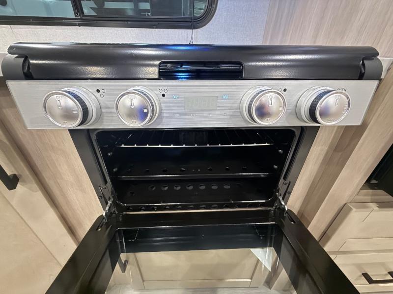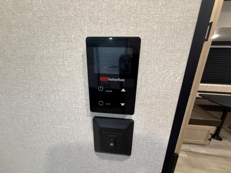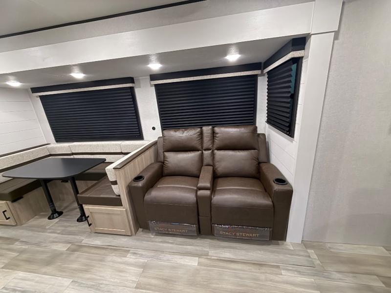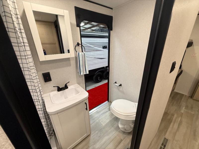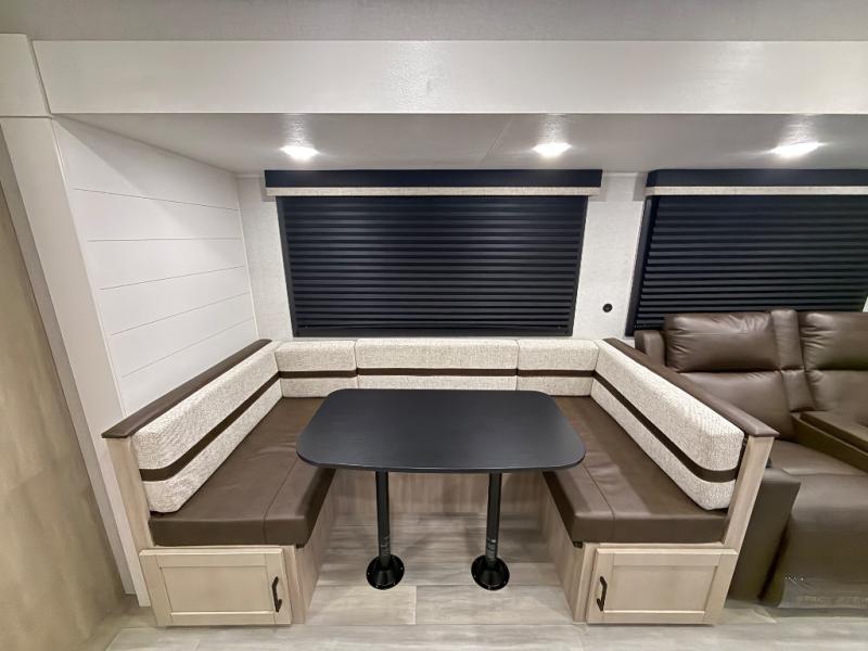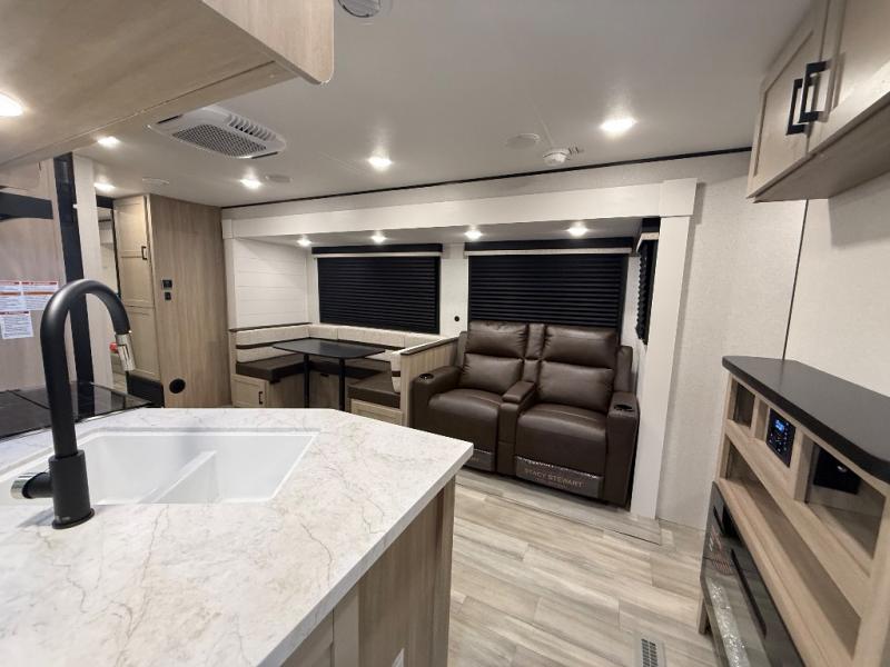 You'll enjoy more space and more fun in this travel trailer with double slides, a private bunkhouse, and an outdoor kitchen with a refrigerator. The bunkhouse includes a set of bunk beds across from a third bunk and a J-cube sofa within a slide. There is also an entertainment center here and a fireplace to make this space cozier. And the full bath with its own exterior entry door is close by the bunkhouse for easy nighttime use! The second slide out is found in the combined kitchen and living room, which houses the U-shaped dinette and jack-knife sofa. Since you'll be camping with a larger group of friends or family, the front private bedroom with an RV queen bed and dual wardrobes will provide you with privacy each night!