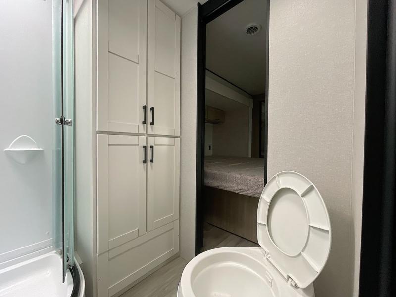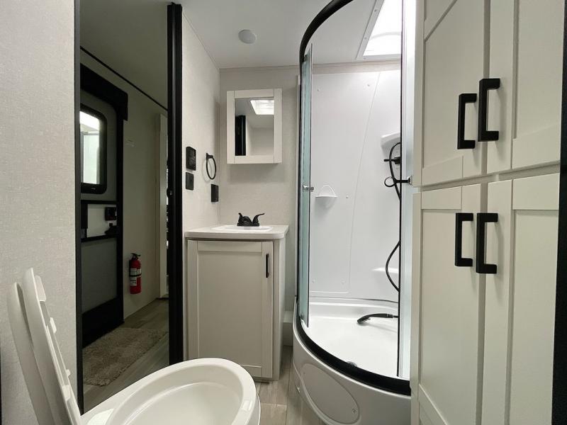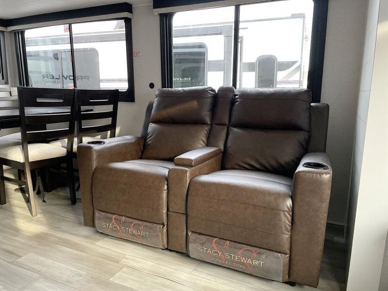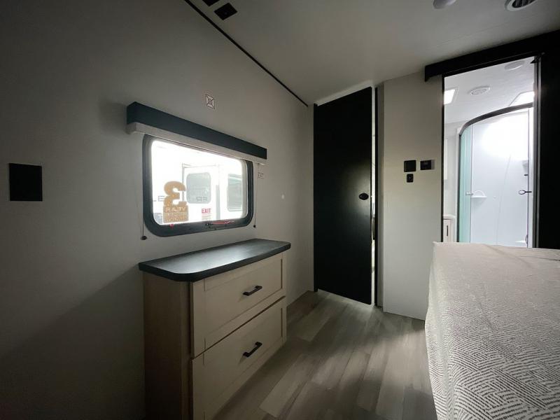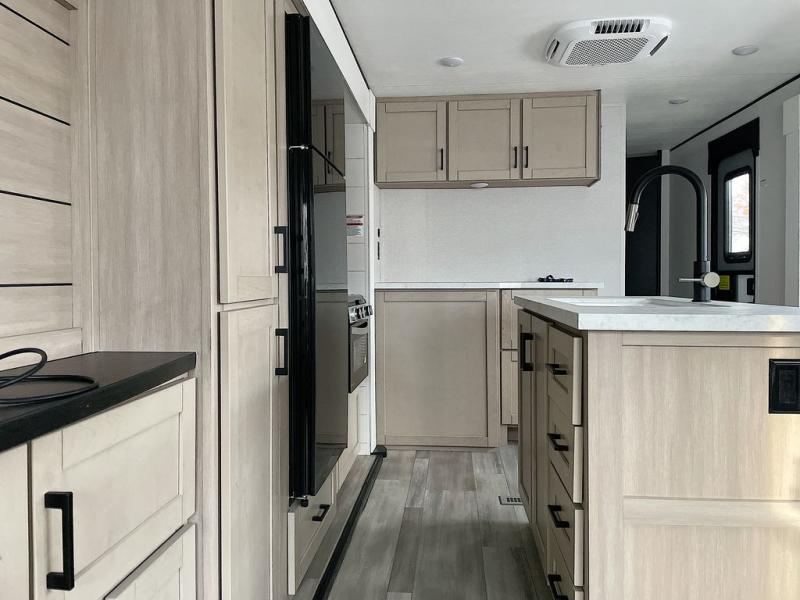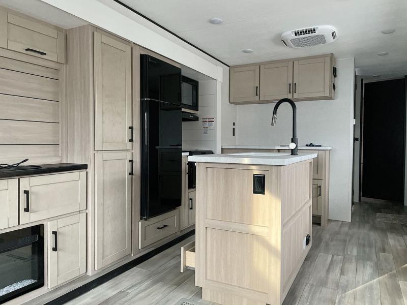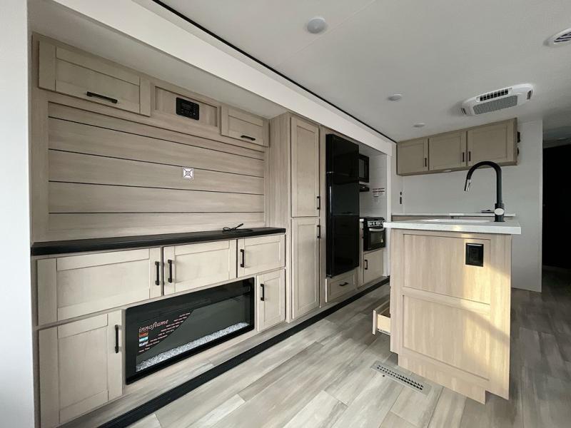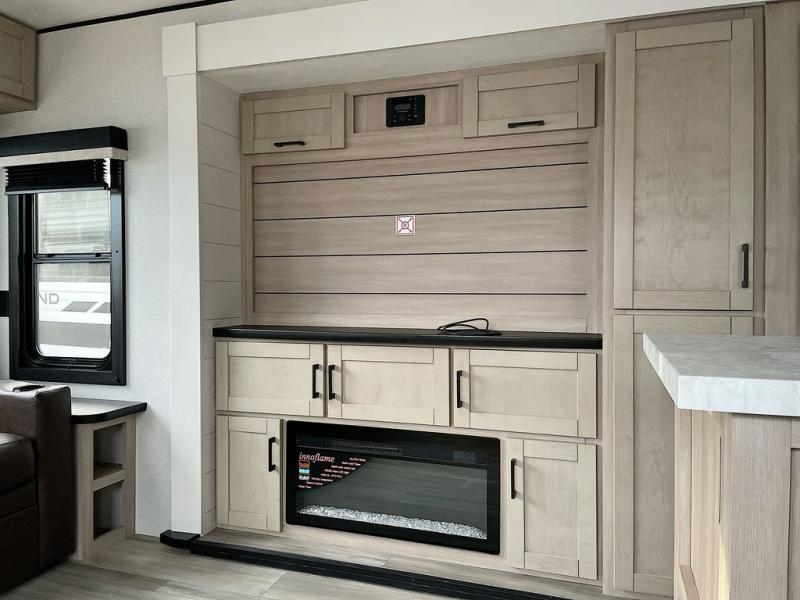 This travel trailer with triple slides will feel more like home with its spacious interior, front master bedroom, and rear living area with a sleeper sofa. The kitchen island will provide more counter space for the chef to prep food and clean up, and there is a booth dinette where you can all dine together. There is also a theater seat with cup holders in direct view of the entertainment center and fireplace. A dual entry bath is found towards the front, and a master bedroom with a queen bed is sure to provide a great night's rest. There is also a spacious bedroom wardrobe, a dresser, plus washer and dryer prep if you choose to add these appliances.