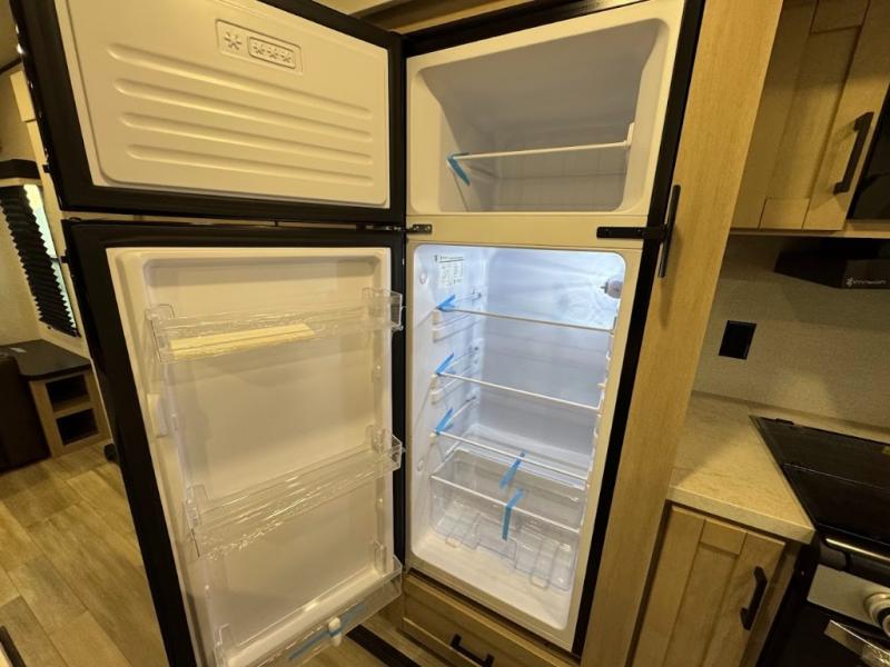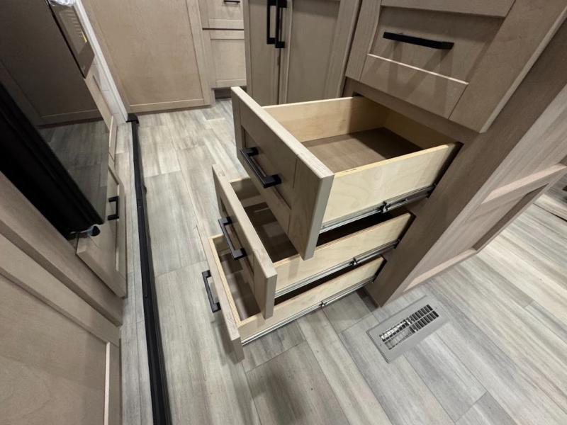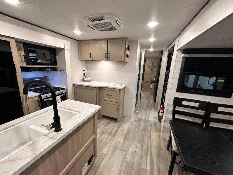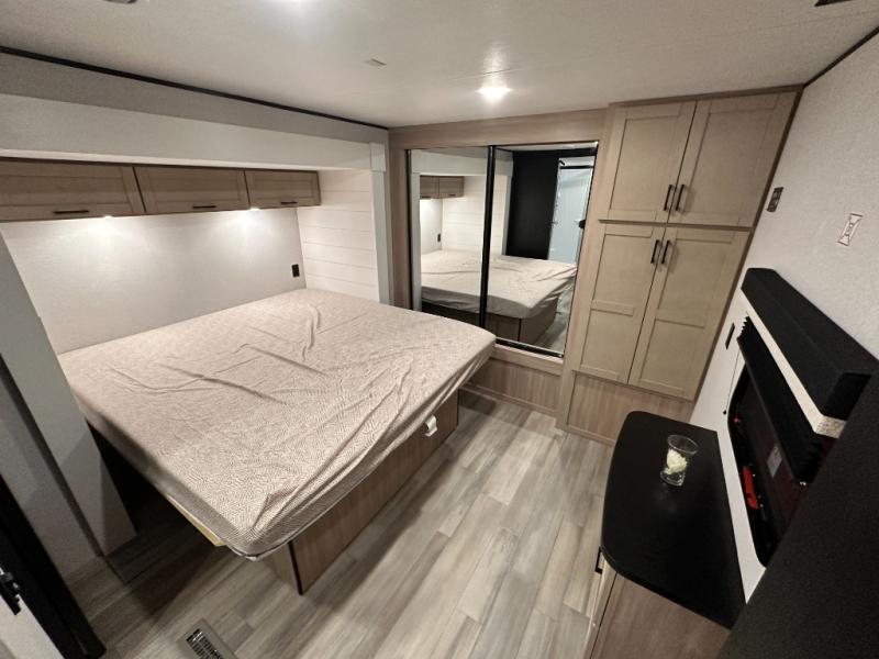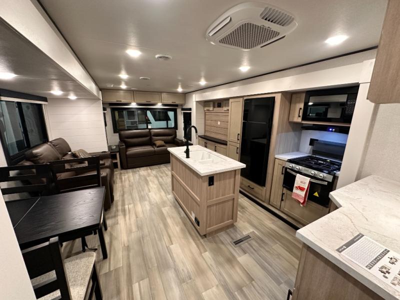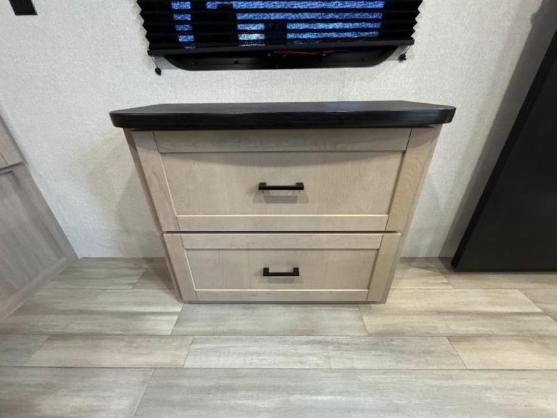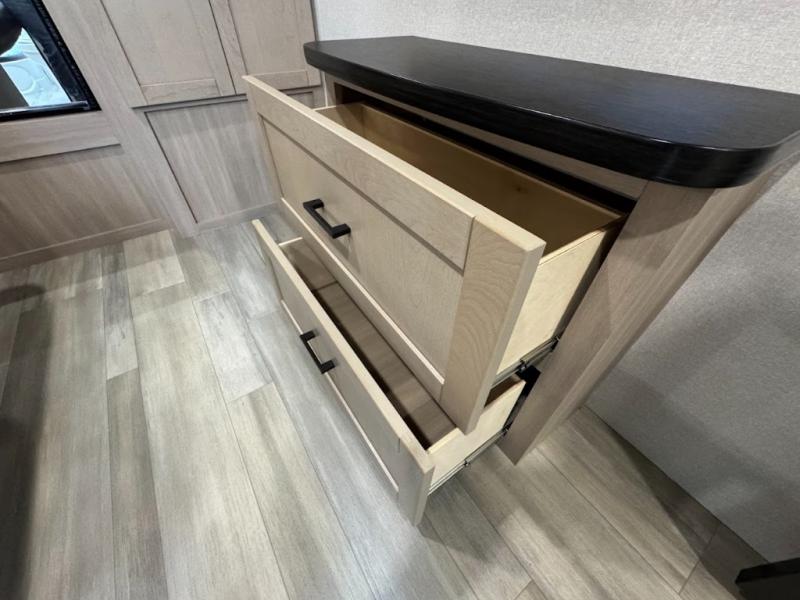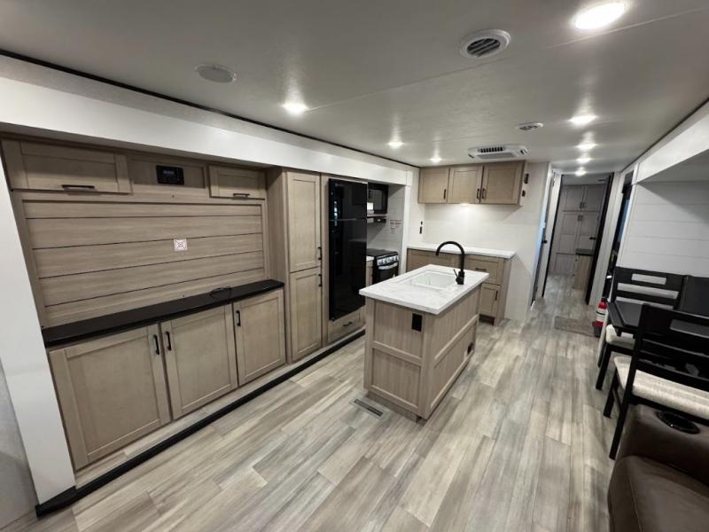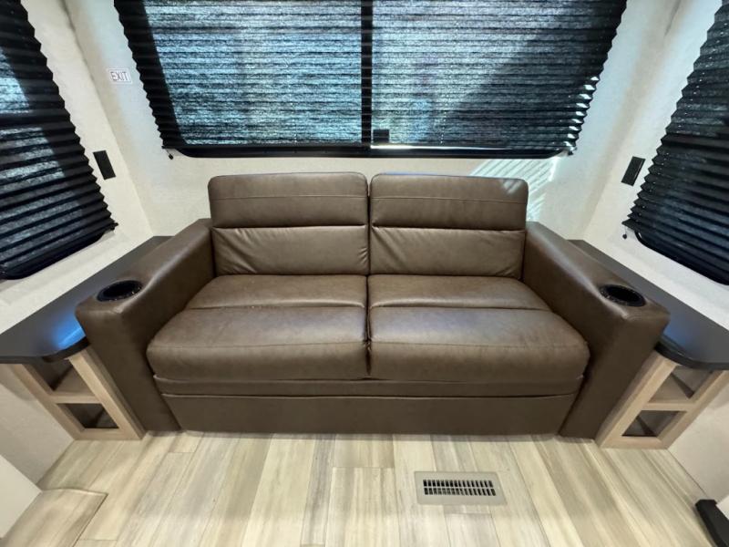 This travel trailer with triple slides will feel more like home with its spacious interior, front master bedroom, and rear living area with a sleeper sofa. The kitchen island will provide more counter space for the chef to prep food and clean up, and there is a booth dinette where you can all dine together. There is also a theater seat with cup holders in direct view of the entertainment center and fireplace. A dual entry bath is found towards the front, and a master bedroom with a queen bed is sure to provide a great night's rest. There is also a spacious bedroom wardrobe, a dresser, plus washer and dryer prep if you choose to add these appliances.