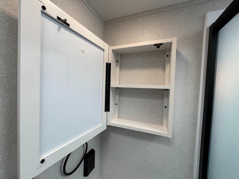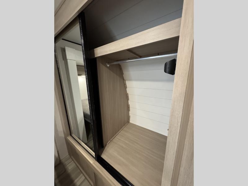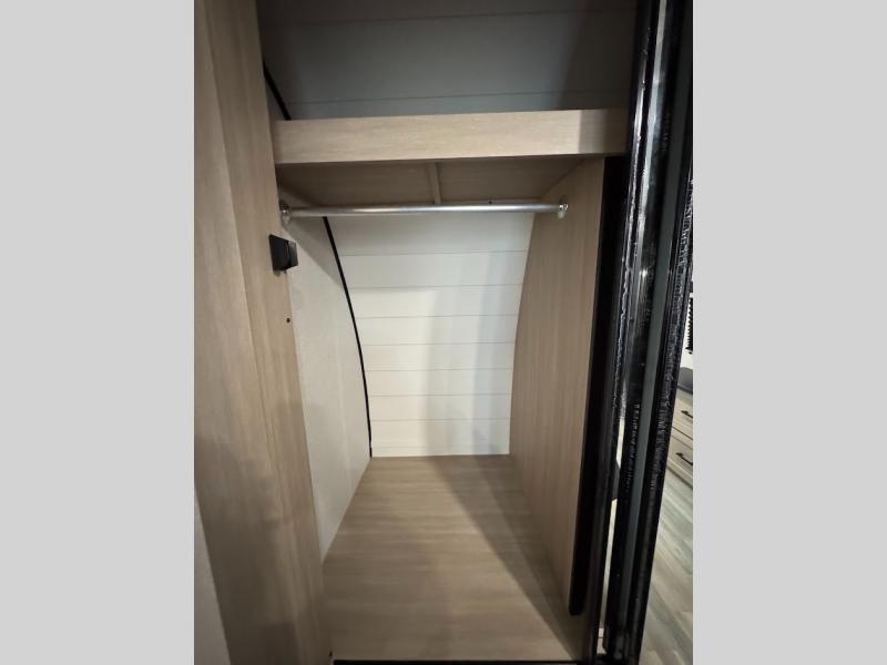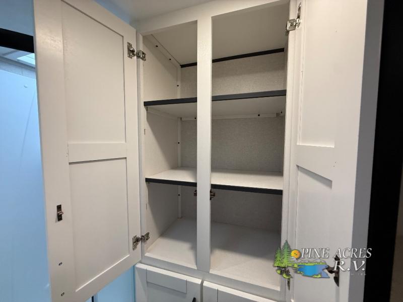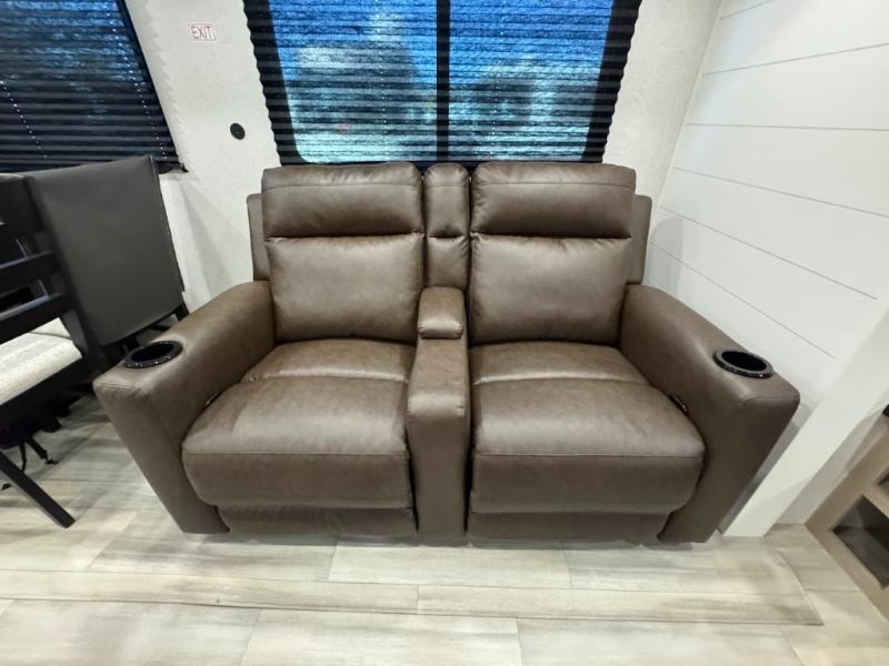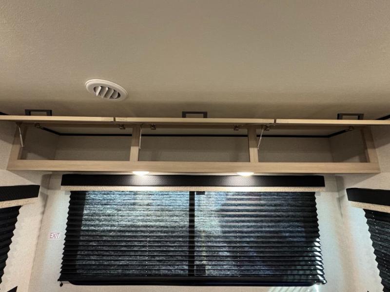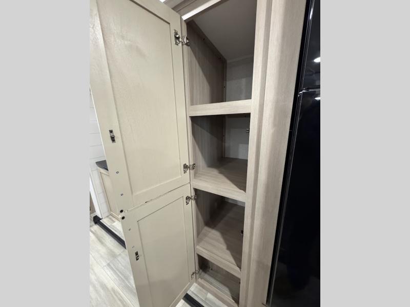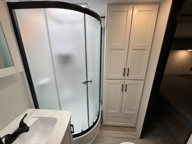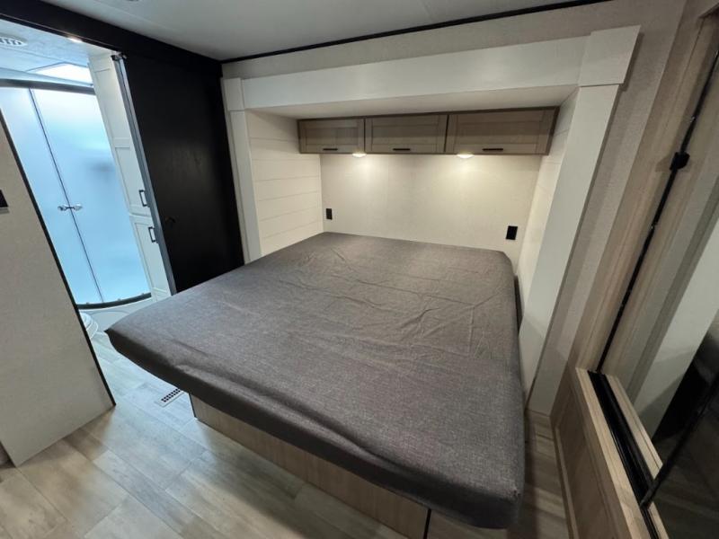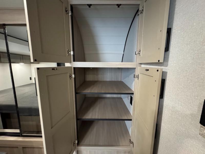 This travel trailer with triple slides will feel more like home with its spacious interior, front master bedroom, and rear living area with a sleeper sofa. The kitchen island will provide more counter space for the chef to prep food and clean up, and there is a booth dinette where you can all dine together. There is also a theater seat with cup holders in direct view of the entertainment center and fireplace. A dual entry bath is found towards the front, and a master bedroom with a queen bed is sure to provide a great night's rest. There is also a spacious bedroom wardrobe, a dresser, plus washer and dryer prep if you choose to add these appliances.
