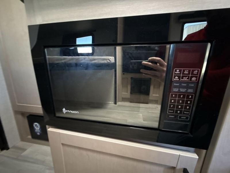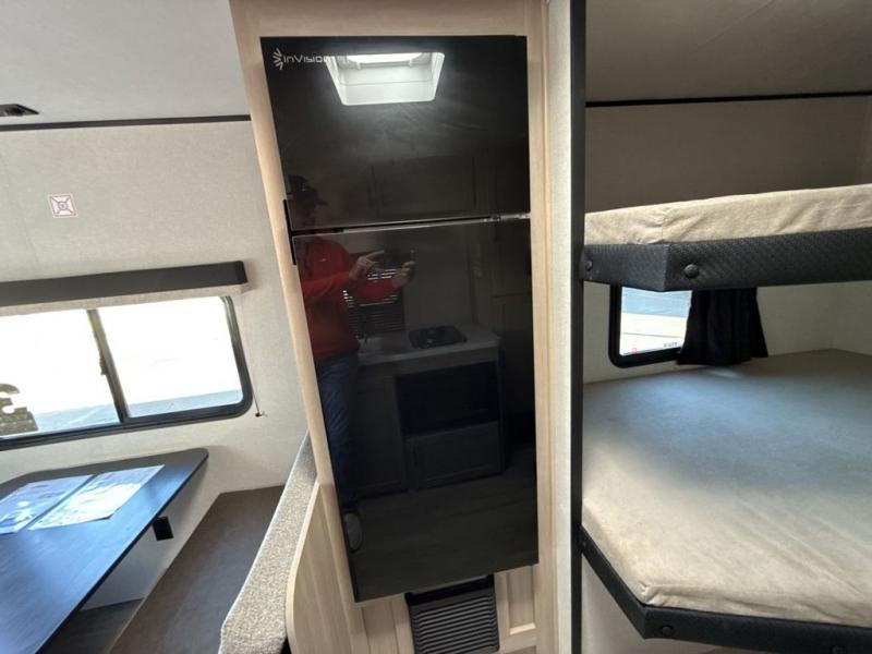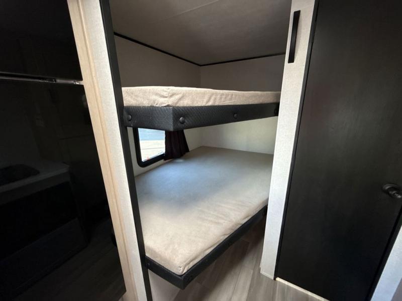 Camping trips are made easy in this Lynx Edition travel trailer with double-size bunk beds for guests or little ones. You'll find a front walk-around queen bed for a great night's rest, along with dual bedside wardrobes to keep your things tidy. The rear corner private bath includes a foot-flush toilet and a 40" shower, so you won't have to leave the camper in the middle of the night. A two-burner cooktop and microwave oven will let you make meals each day, and you'll find seating spaces at the booth dinette or on the sofa!