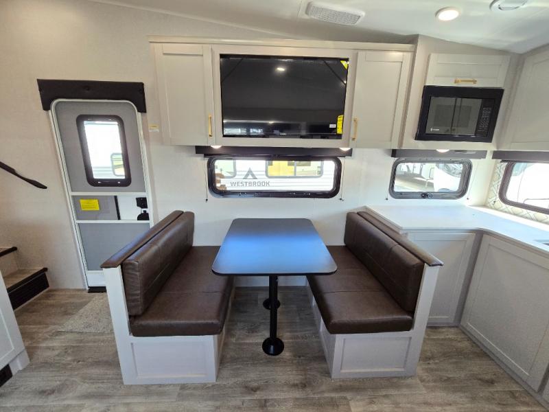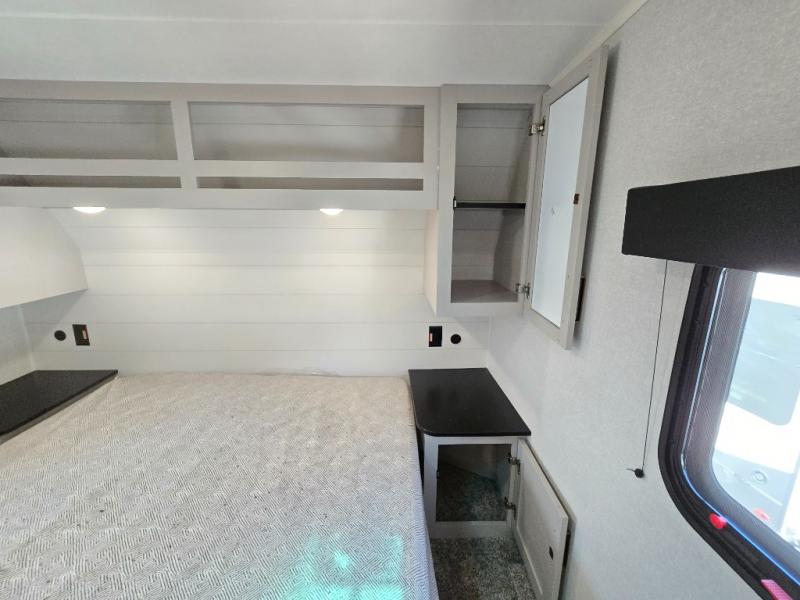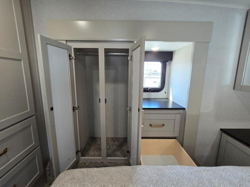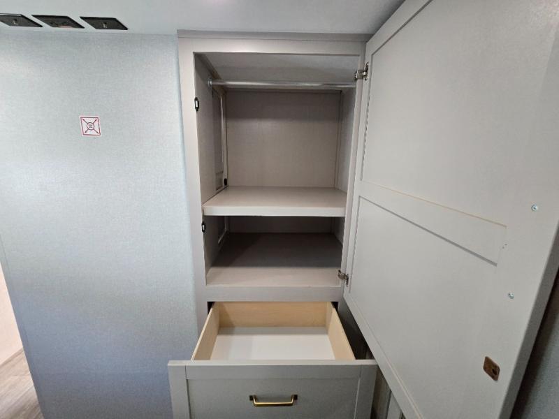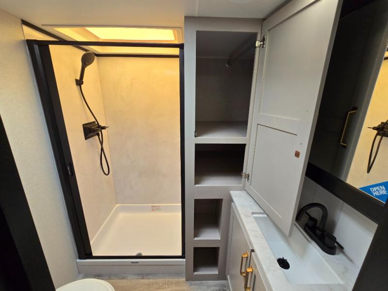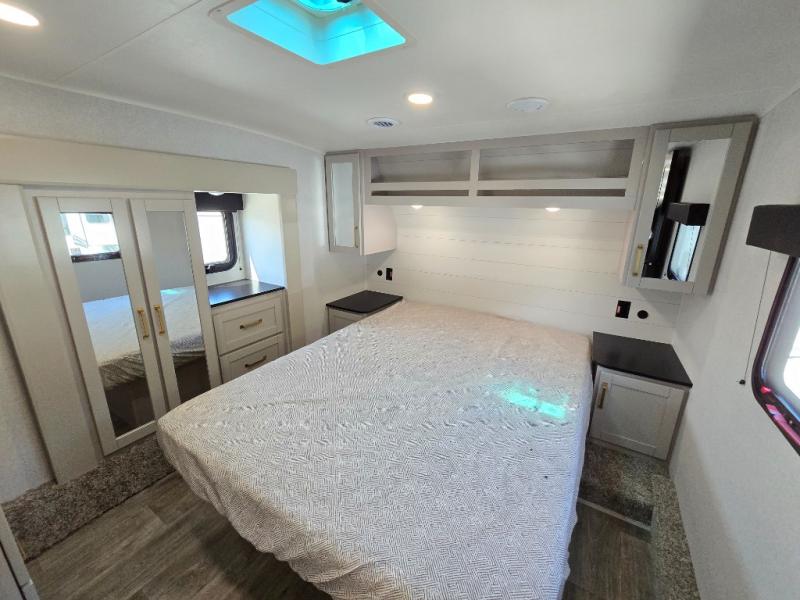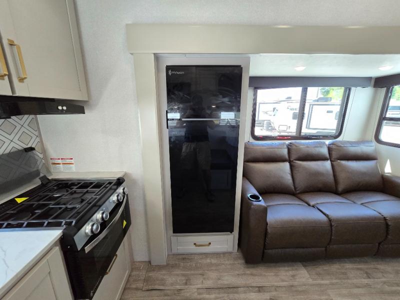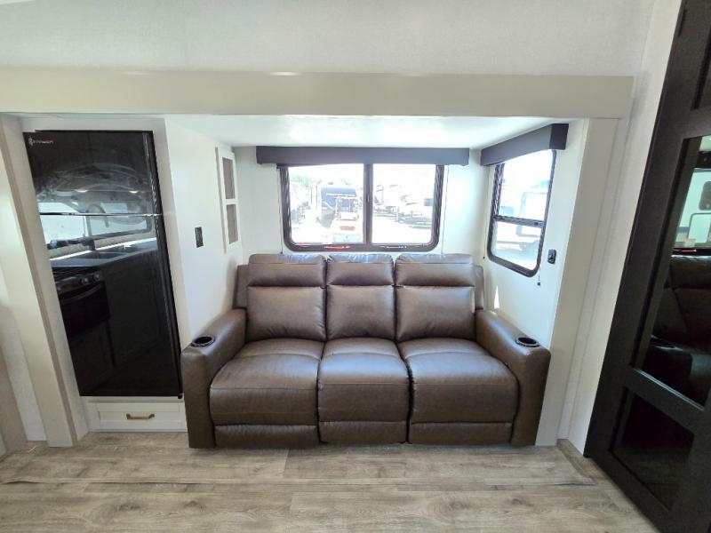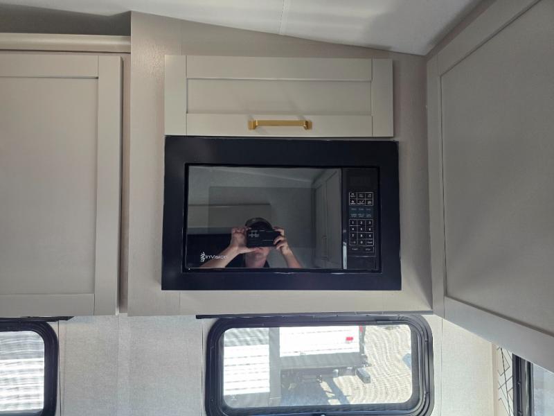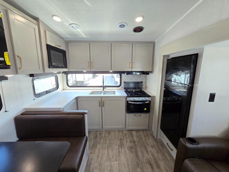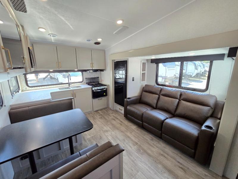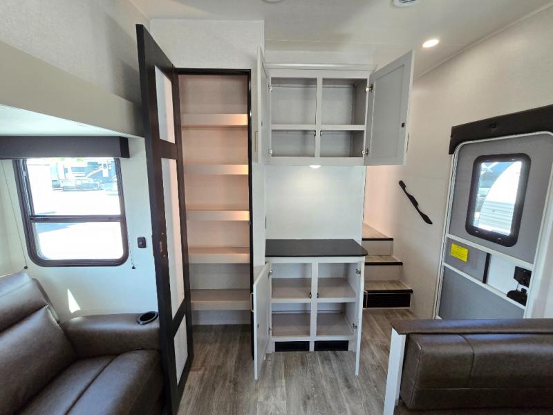 The fifth wheel you were waiting for! The spacious rear kitchen is equipped with a three-burner cooktop, microwave, booth dinette, 12V refrigerator, and sink, providing ample space for meal preparation. Overhead cabinets and a pantry provide ample storage for cookware, dishes, and other essential kitchen items. The living area features a trifold sofa, perfect for relaxation and entertainment. The full bathroom’s thoughtful design ensures that everyone has their own space, and the front bedroom is a retreat from the world, featuring a plush queen bed, a spacious wardrobe, and a closet.