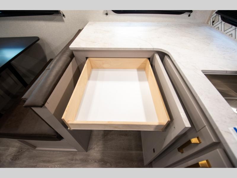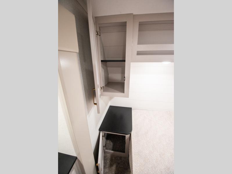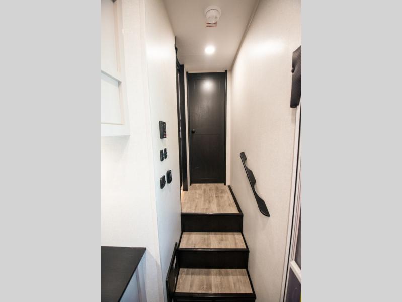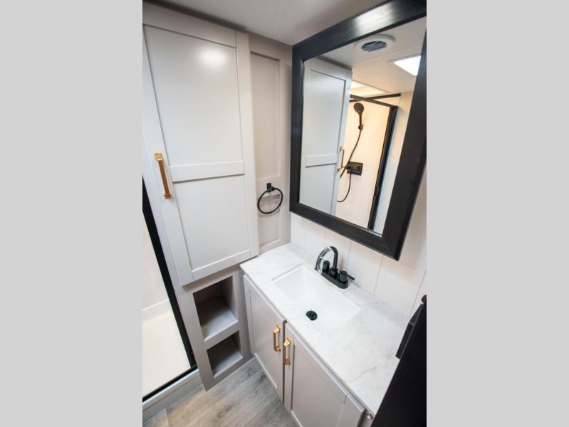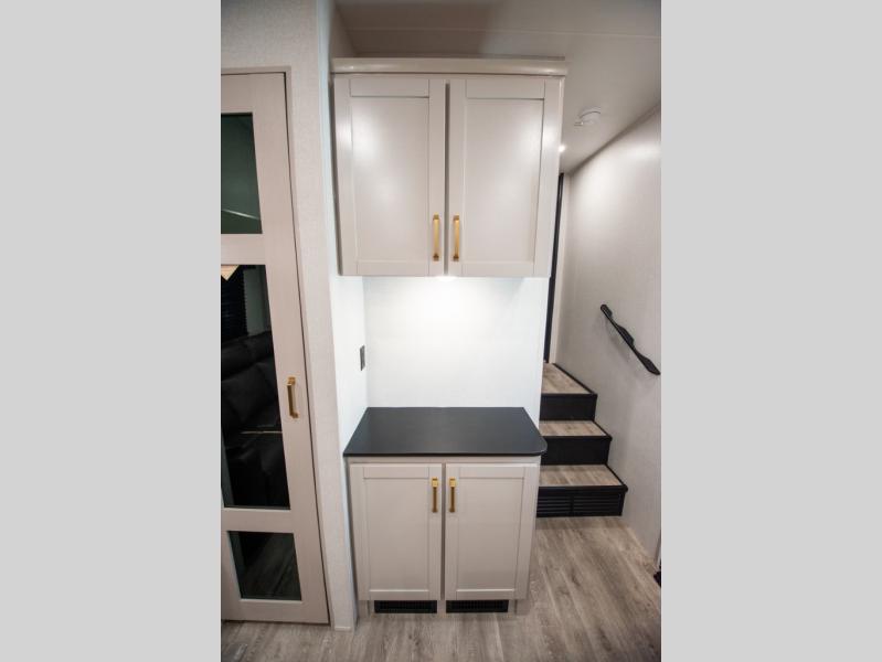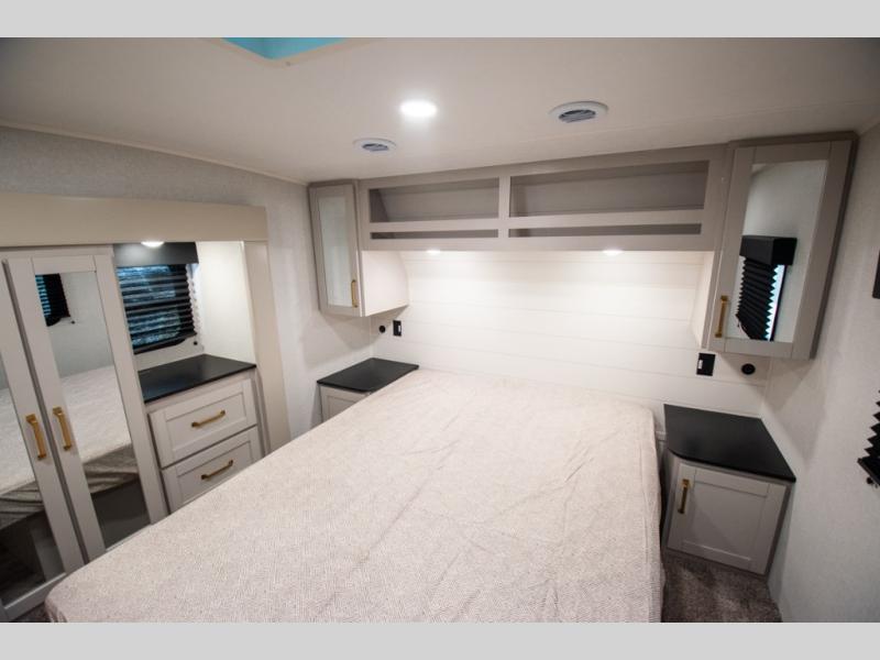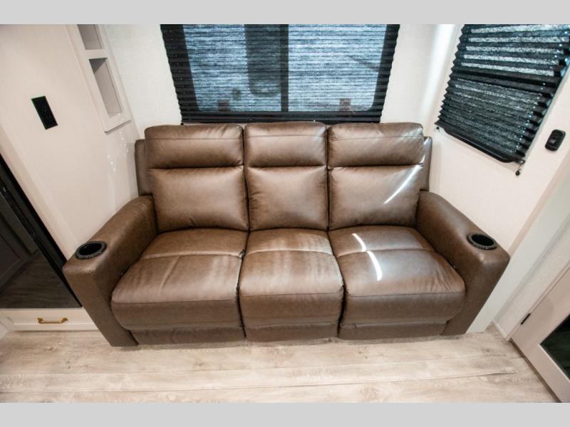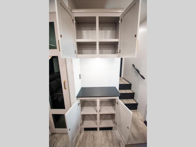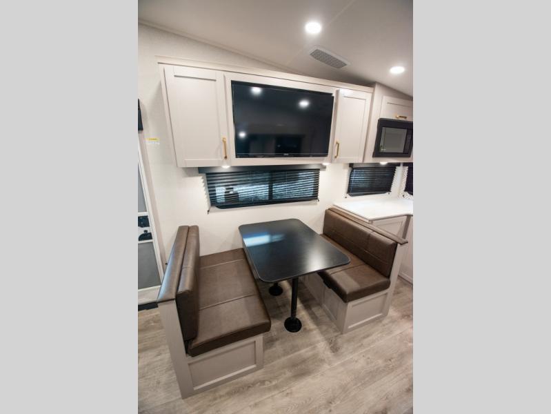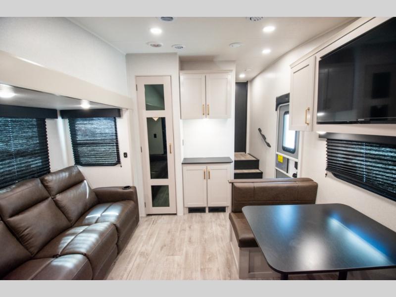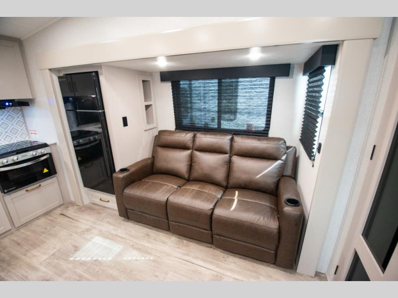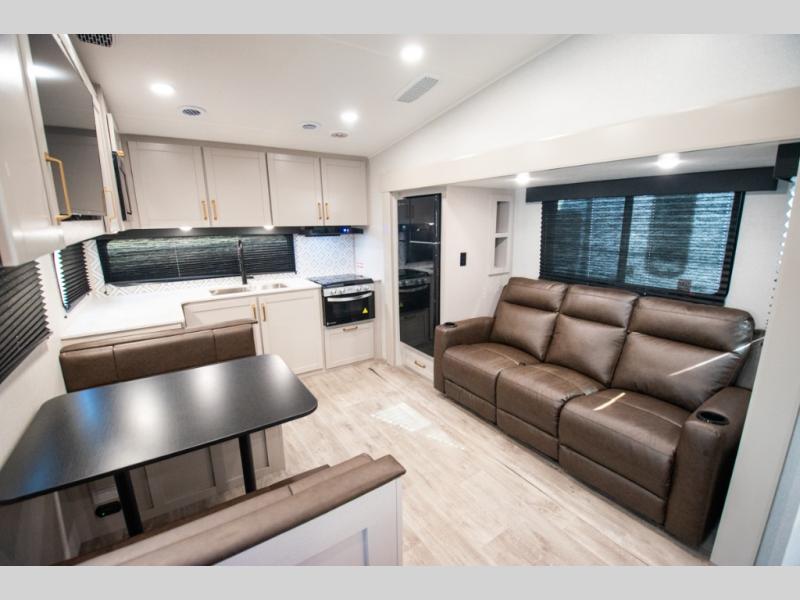 The fifth wheel you were waiting for! The spacious rear kitchen is equipped with a three-burner cooktop, microwave, booth dinette, 12V refrigerator, and sink, providing ample space for meal preparation. Overhead cabinets and a pantry provide ample storage for cookware, dishes, and other essential kitchen items. The living area features a trifold sofa, perfect for relaxation and entertainment. The full bathroom’s thoughtful design ensures that everyone has their own space, and the front bedroom is a retreat from the world, featuring a plush queen bed, a spacious wardrobe, and a closet.