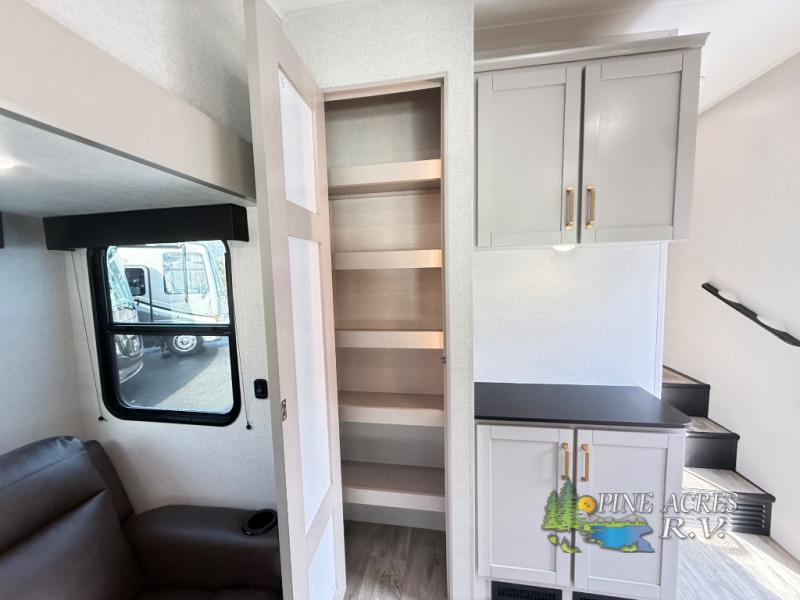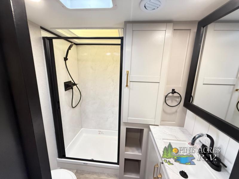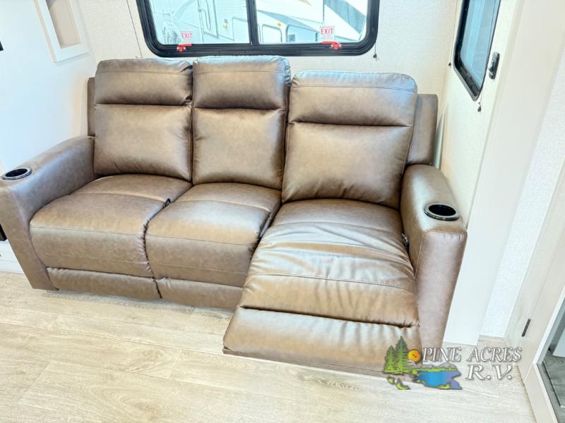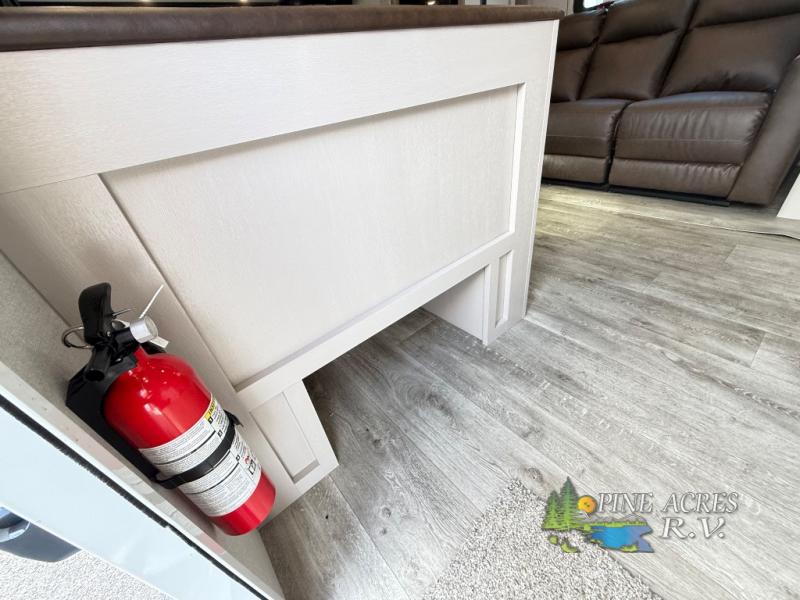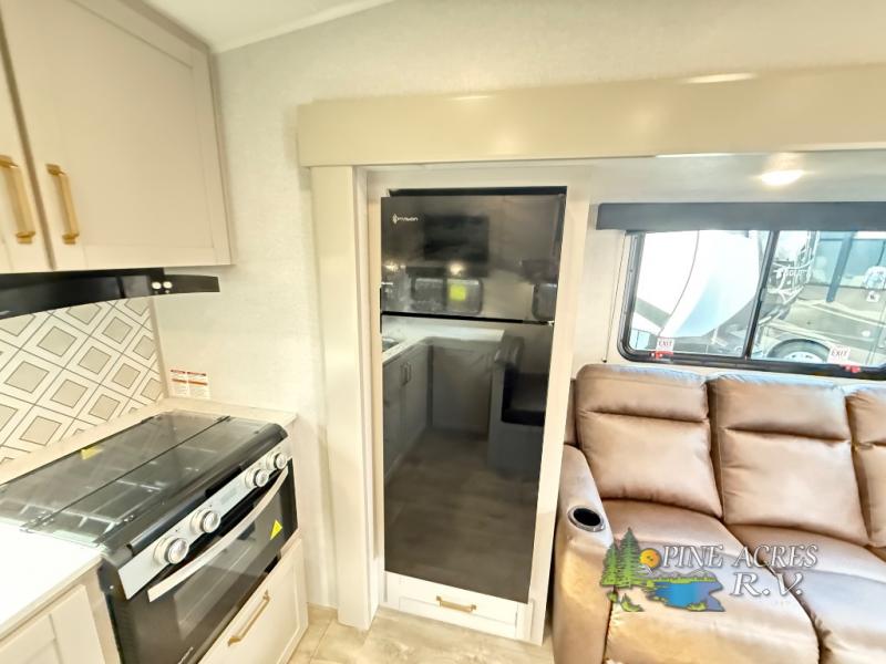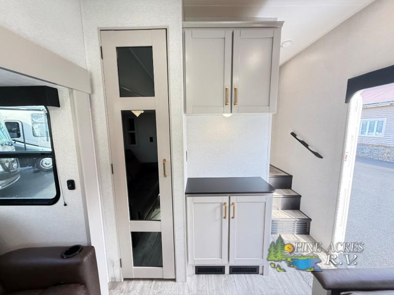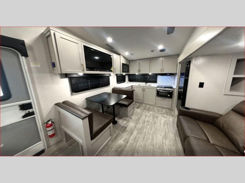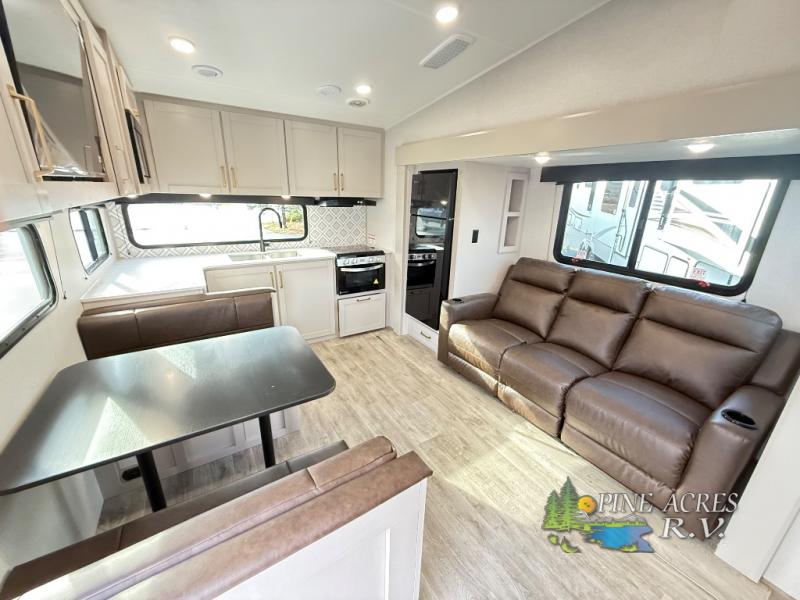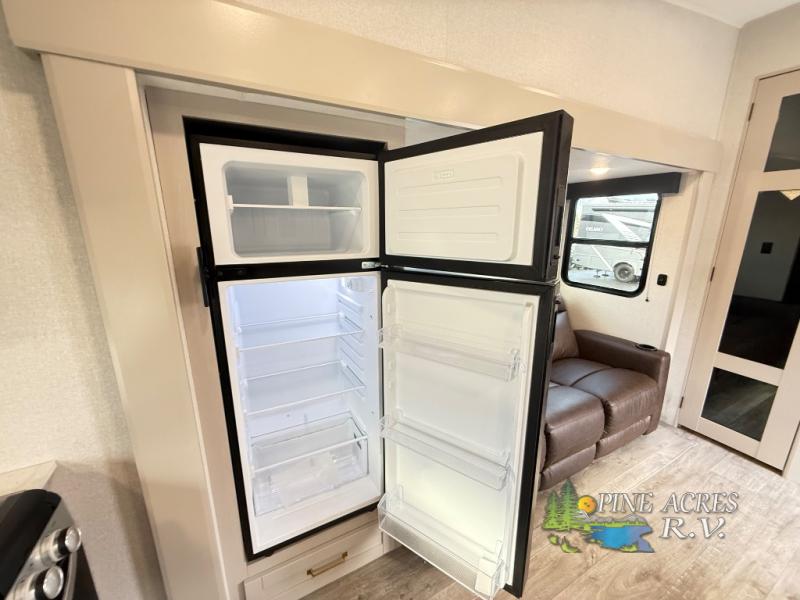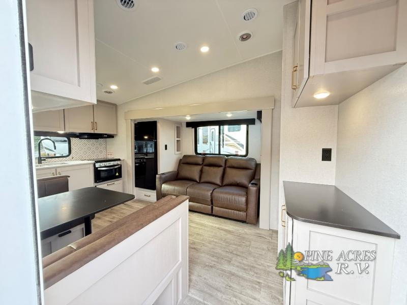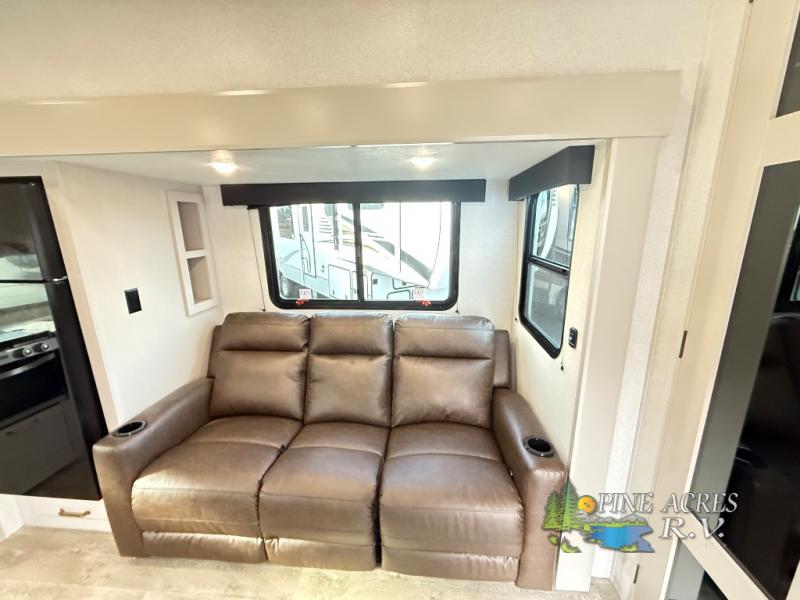 The fifth wheel you were waiting for! The spacious rear kitchen is equipped with a three-burner cooktop, microwave, booth dinette, 12V refrigerator, and sink, providing ample space for meal preparation. Overhead cabinets and a pantry provide ample storage for cookware, dishes, and other essential kitchen items. The living area features a trifold sofa, perfect for relaxation and entertainment. The full bathroom’s thoughtful design ensures that everyone has their own space, and the front bedroom is a retreat from the world, featuring a plush queen bed, a spacious wardrobe, and a closet.