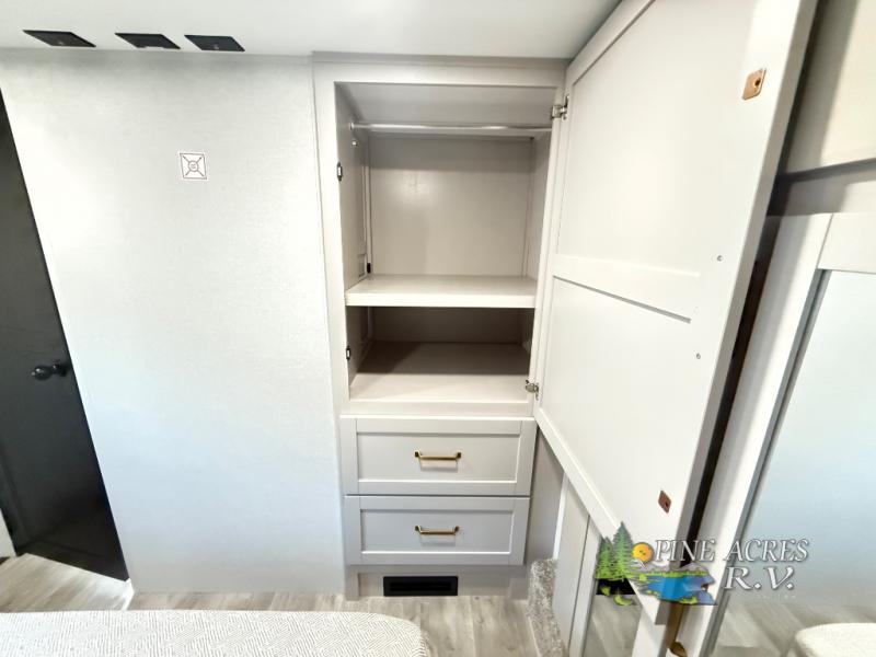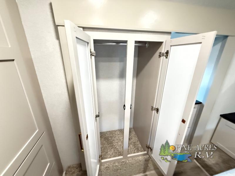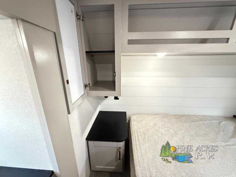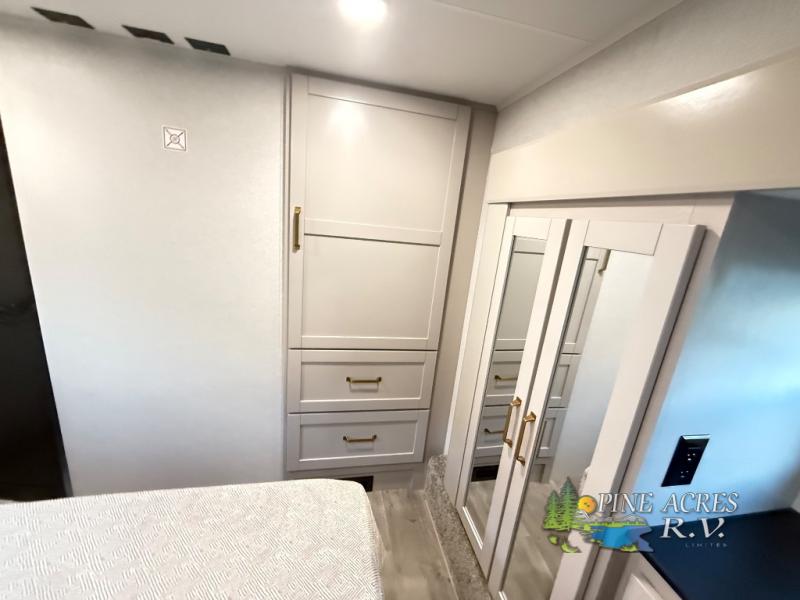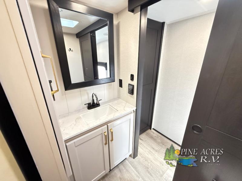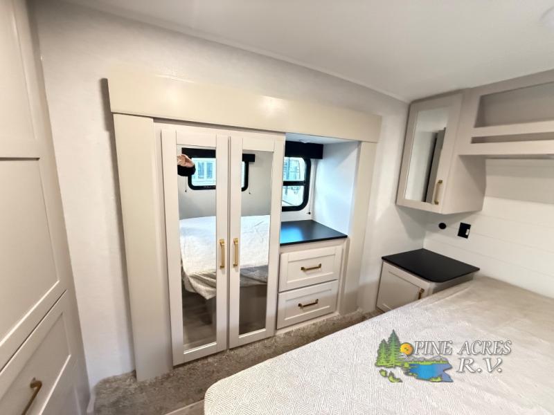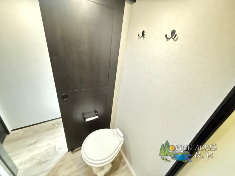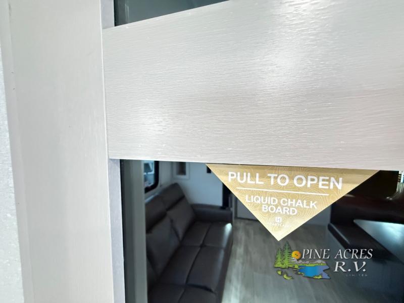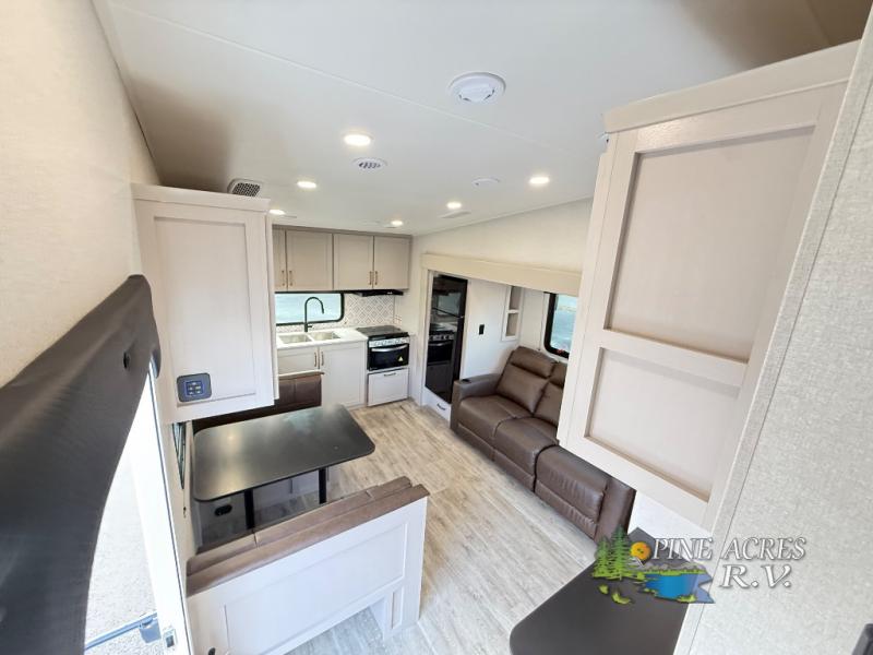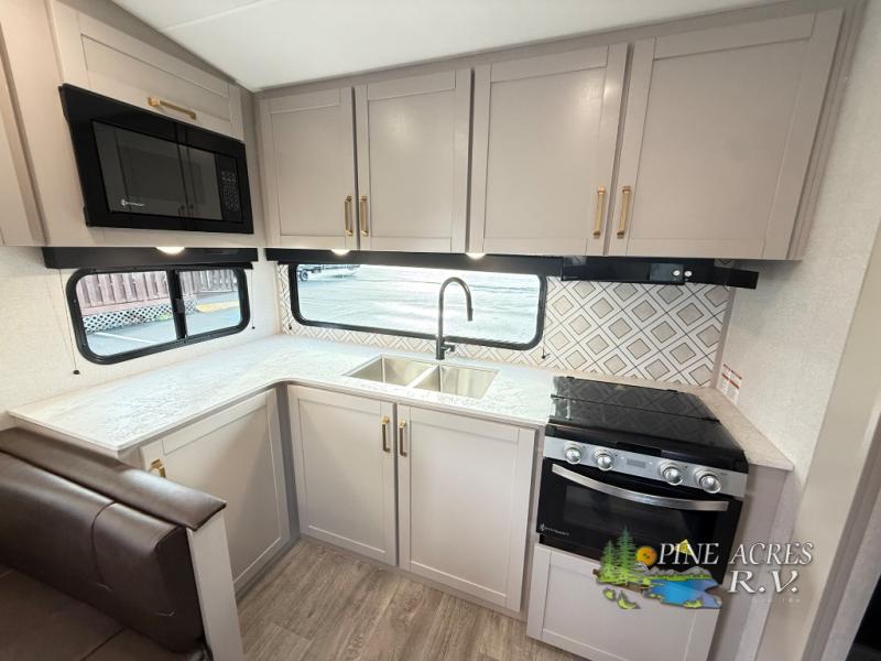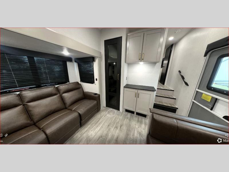 The fifth wheel you were waiting for! The spacious rear kitchen is equipped with a three-burner cooktop, microwave, booth dinette, 12V refrigerator, and sink, providing ample space for meal preparation. Overhead cabinets and a pantry provide ample storage for cookware, dishes, and other essential kitchen items. The living area features a trifold sofa, perfect for relaxation and entertainment. The full bathroom’s thoughtful design ensures that everyone has their own space, and the front bedroom is a retreat from the world, featuring a plush queen bed, a spacious wardrobe, and a closet.