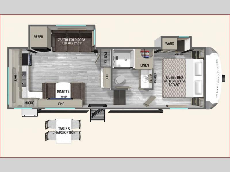 Each Heartland Sundance Fifth Wheel features ThermaShield, a zero-degree tested weather protection system that ensures comfort. This system features a fully enclosed and heated underbelly (ducted) that protects vital systems and provides warmth in cold climates. The AeroChill directional cooling system offers precise temperature control, creating a refreshing and comfortable atmosphere. Inside, you can stay connected on the go with the multiple USB-C 12V charging ports, and the Winegard Air 360 4G + Antenna & router prep that ensures reliable internet connectivity and seamless streaming. The units boast 5/8 in. tongue-and-groove plywood flooring, providing a sturdy and durable foundation, a Keyed-Alike lock system, and the rainproof bathroom power vent ensures a comfortable bathroom experience, removing moisture and odors efficiently.