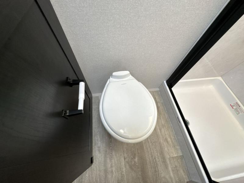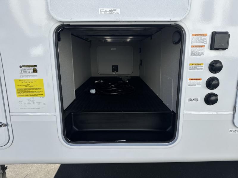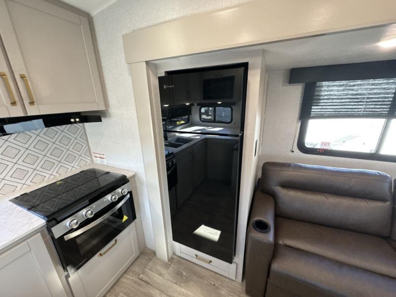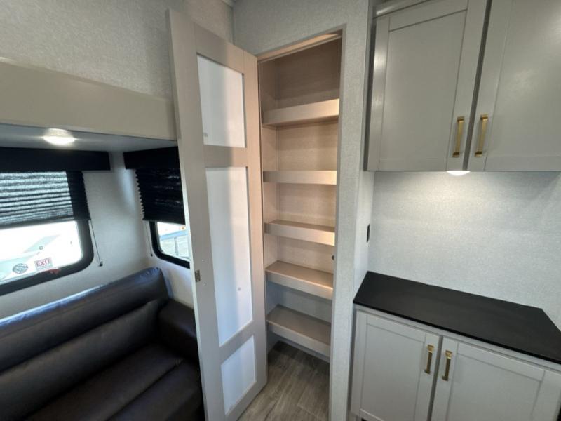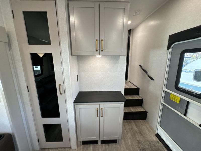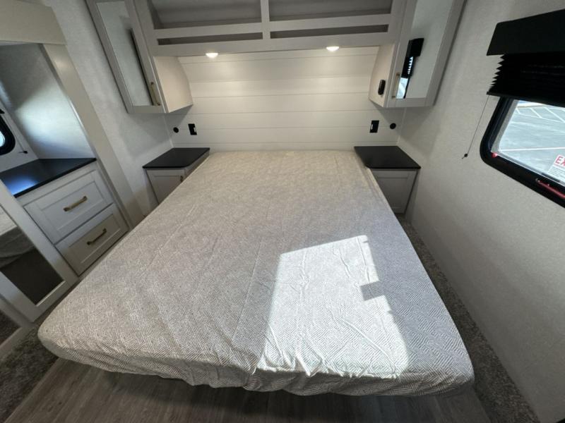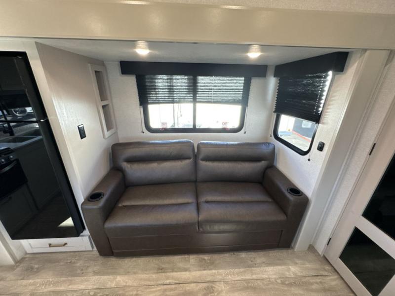 The fifth wheel you were waiting for! The spacious rear kitchen is equipped with a three-burner cooktop, microwave, booth dinette, 12V refrigerator, and sink, providing ample space for meal preparation. Overhead cabinets and a pantry provide ample storage for cookware, dishes, and other essential kitchen items. The living area features a trifold sofa, perfect for relaxation and entertainment. The full bathroom’s thoughtful design ensures that everyone has their own space, and the front bedroom is a retreat from the world, featuring a plush queen bed, a spacious wardrobe, and a closet.