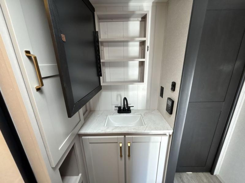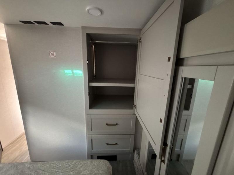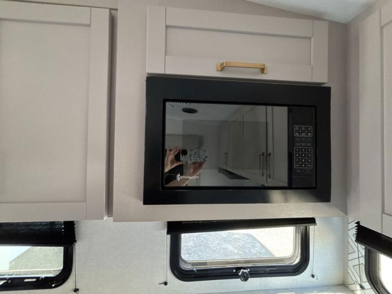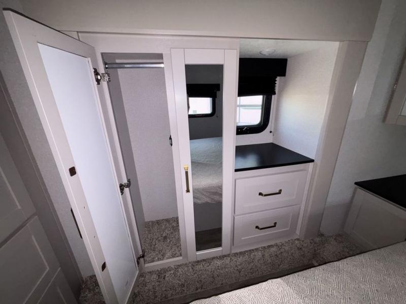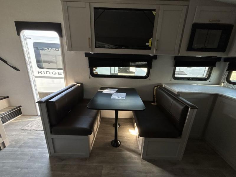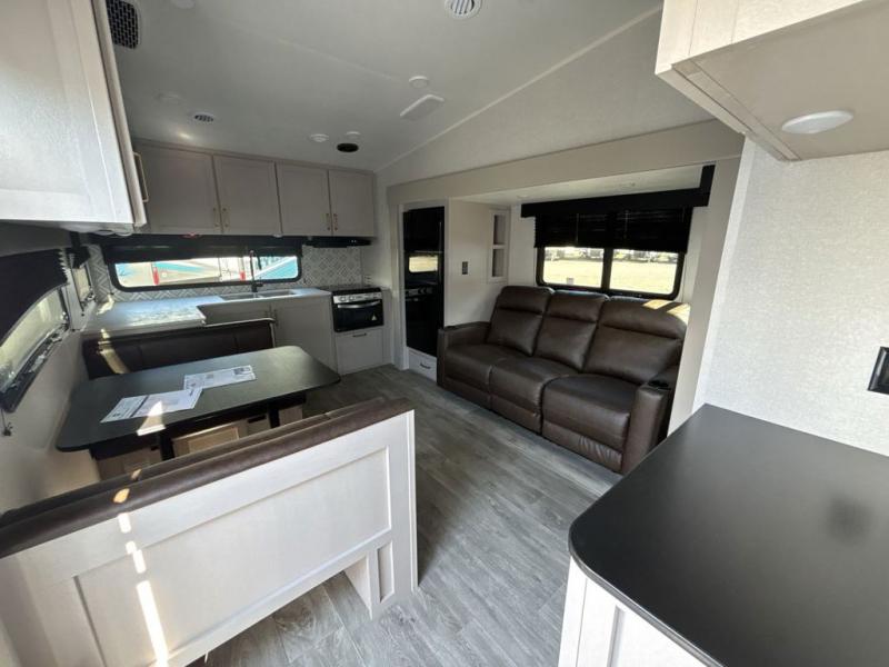 The fifth wheel you were waiting for! The spacious rear kitchen is equipped with a three-burner cooktop, microwave, booth dinette, 12V refrigerator, and sink, providing ample space for meal preparation. Overhead cabinets and a pantry provide ample storage for cookware, dishes, and other essential kitchen items. The living area features a trifold sofa, perfect for relaxation and entertainment. The full bathroom’s thoughtful design ensures that everyone has their own space, and the front bedroom is a retreat from the world, featuring a plush queen bed, a spacious wardrobe, and a closet.