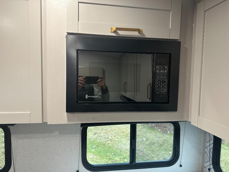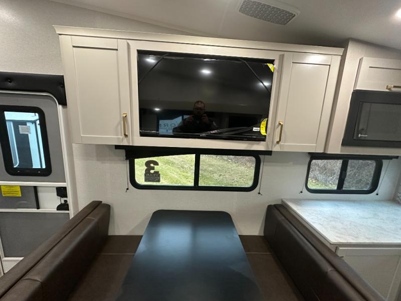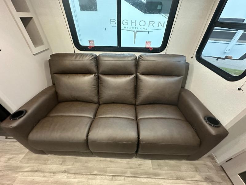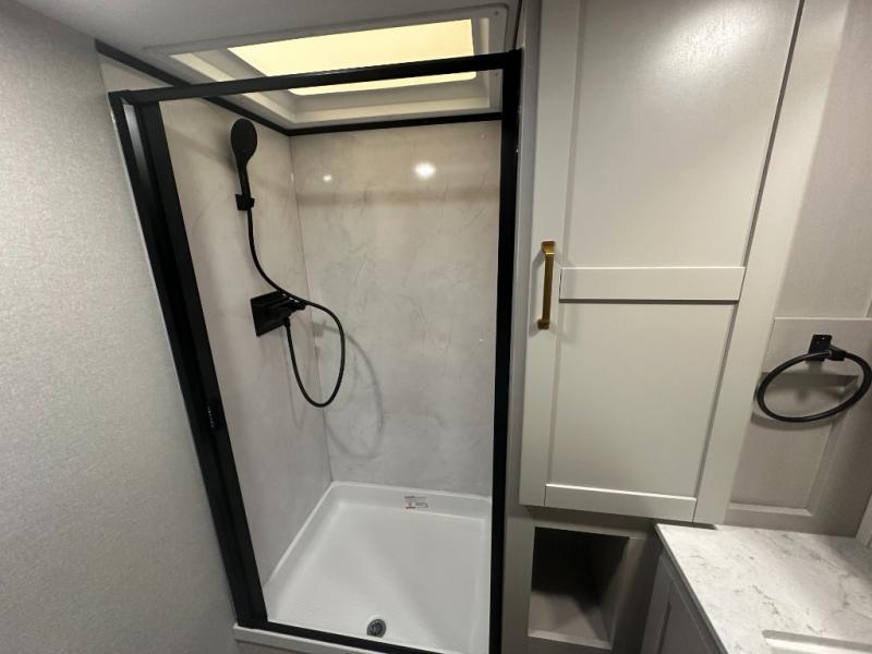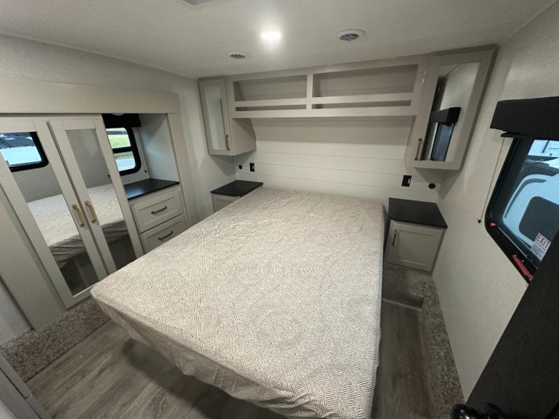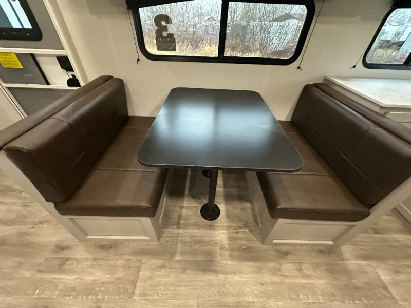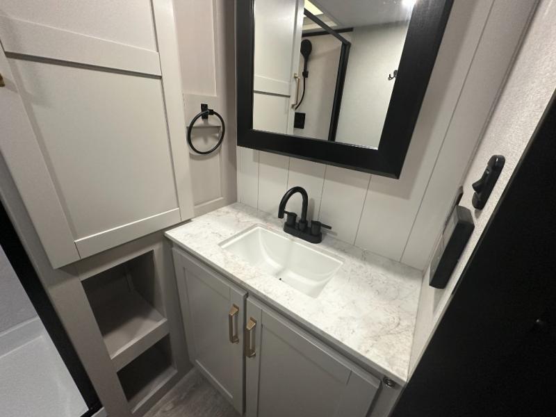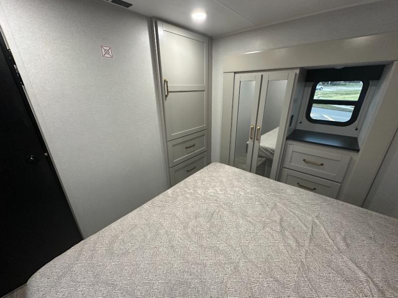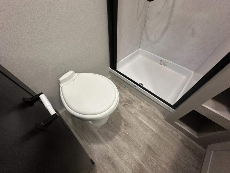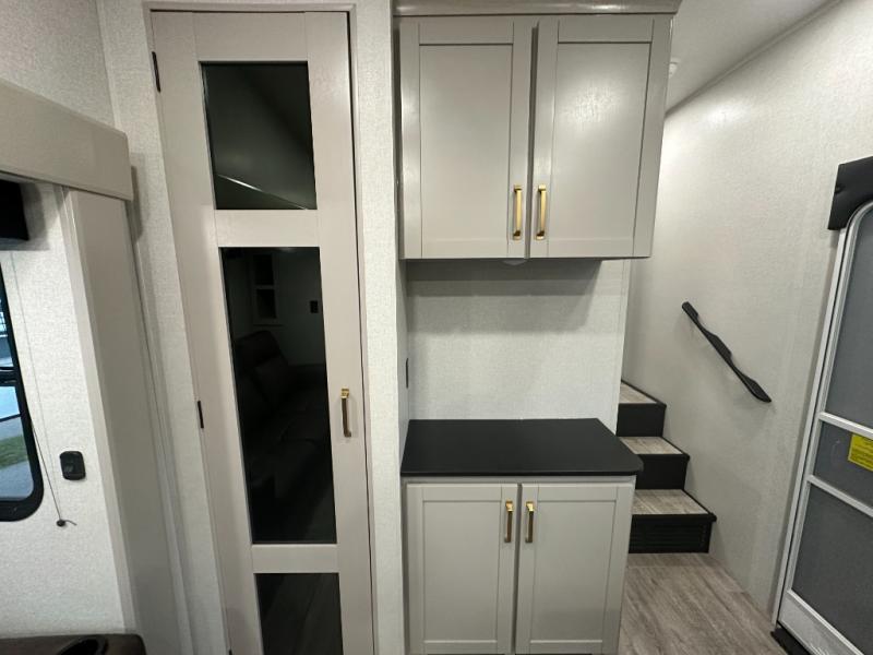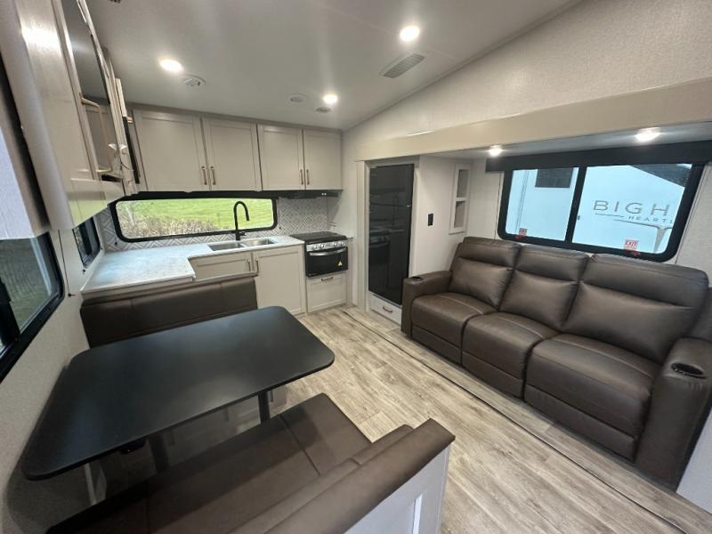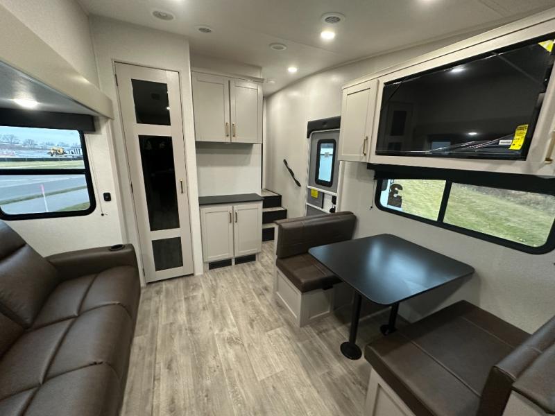 The fifth wheel you were waiting for! The spacious rear kitchen is equipped with a three-burner cooktop, microwave, booth dinette, 12V refrigerator, and sink, providing ample space for meal preparation. Overhead cabinets and a pantry provide ample storage for cookware, dishes, and other essential kitchen items. The living area features a trifold sofa, perfect for relaxation and entertainment. The full bathroom’s thoughtful design ensures that everyone has their own space, and the front bedroom is a retreat from the world, featuring a plush queen bed, a spacious wardrobe, and a closet.