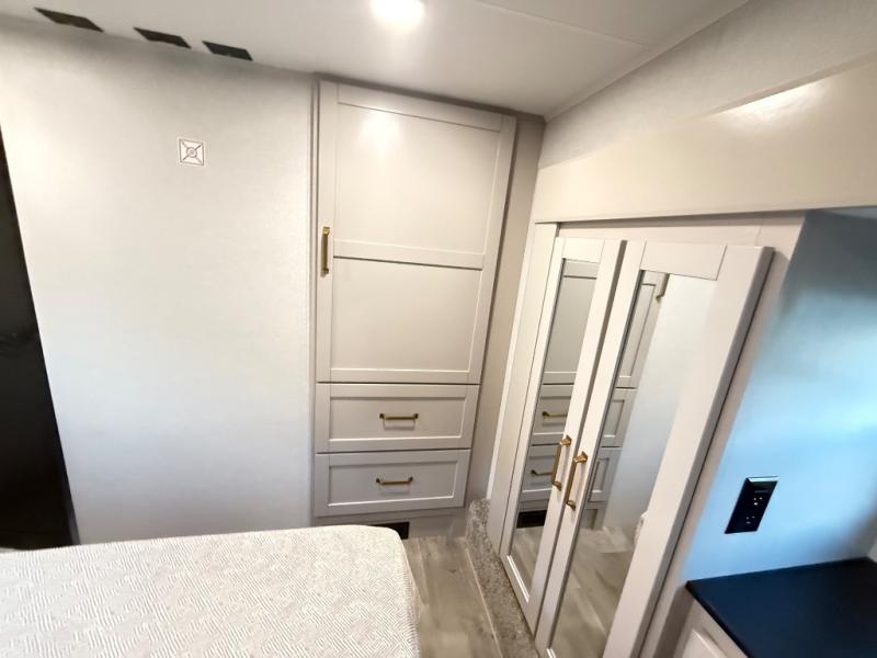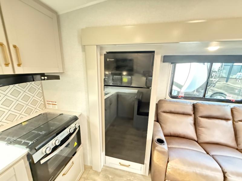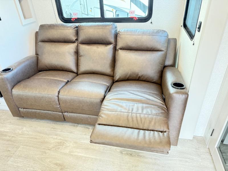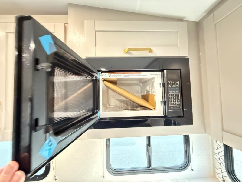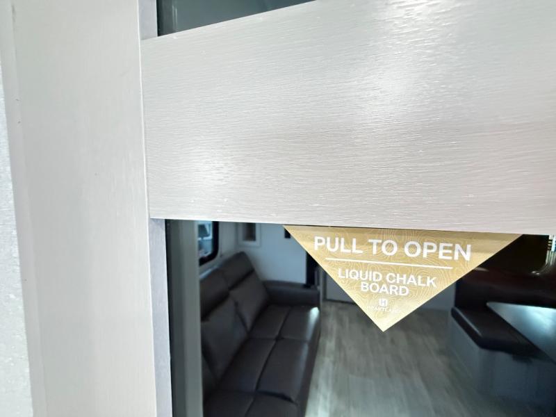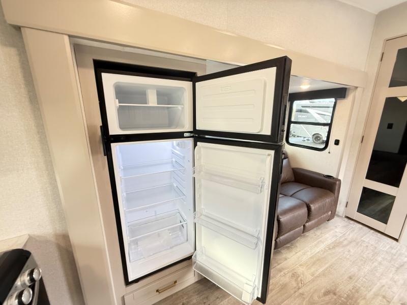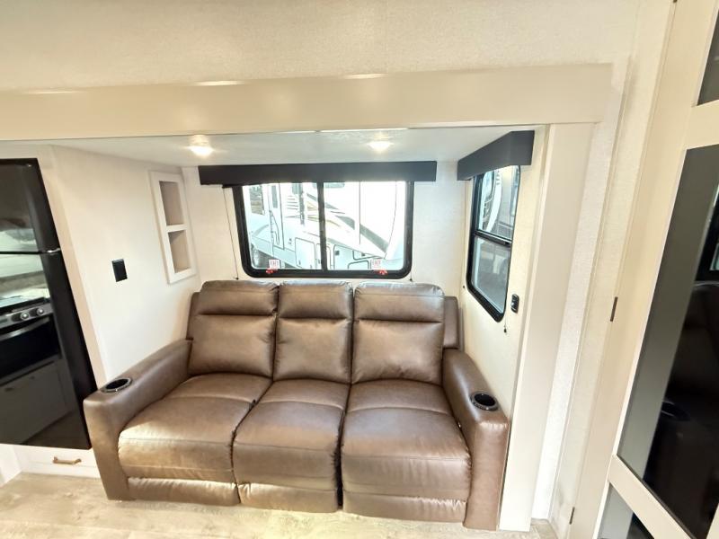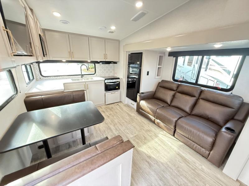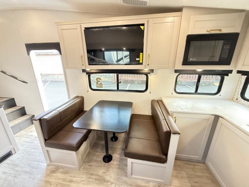 The fifth wheel you were waiting for! The spacious rear kitchen is equipped with a three-burner cooktop, microwave, booth dinette, 12V refrigerator, and sink, providing ample space for meal preparation. Overhead cabinets and a pantry provide ample storage for cookware, dishes, and other essential kitchen items. The living area features a trifold sofa, perfect for relaxation and entertainment. The full bathroom’s thoughtful design ensures that everyone has their own space, and the front bedroom is a retreat from the world, featuring a plush queen bed, a spacious wardrobe, and a closet.