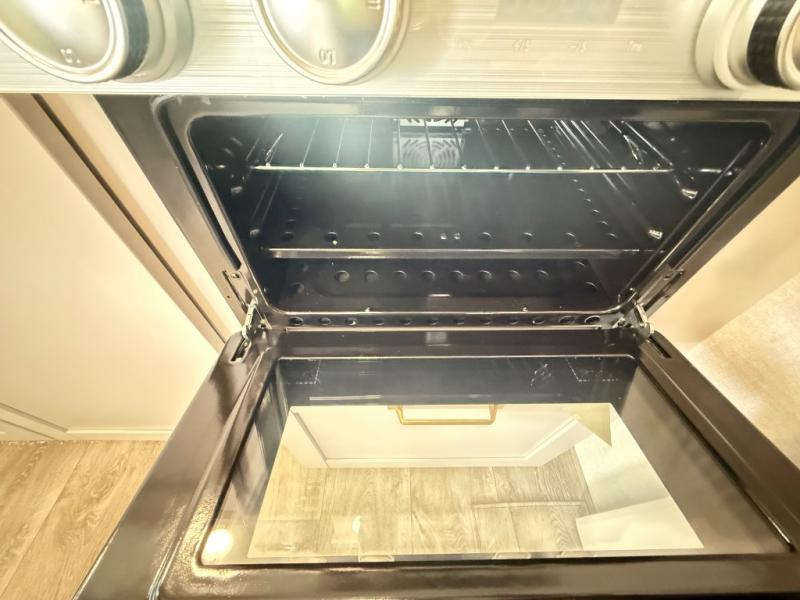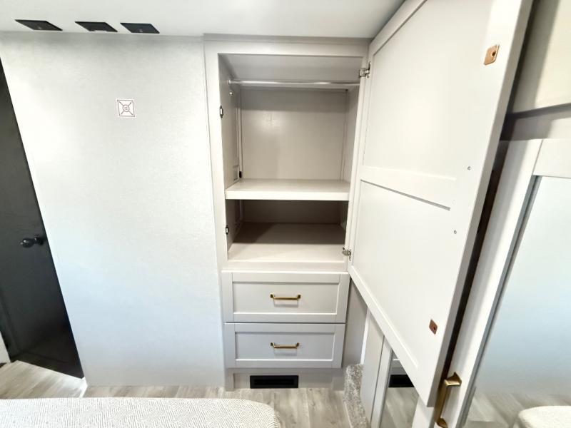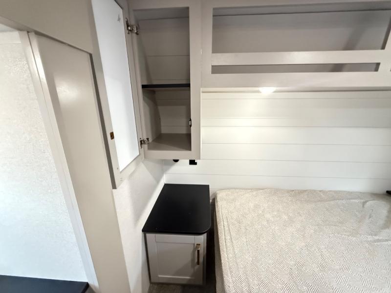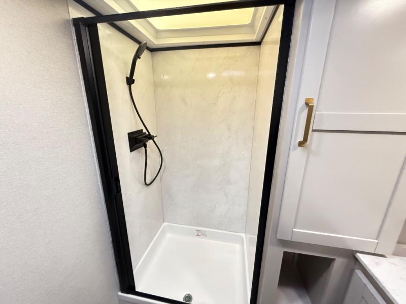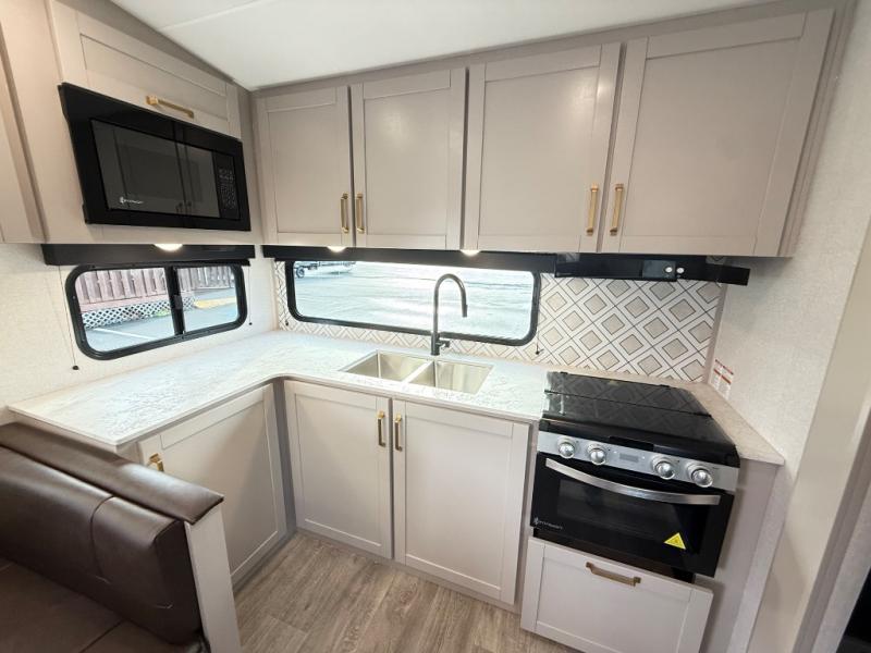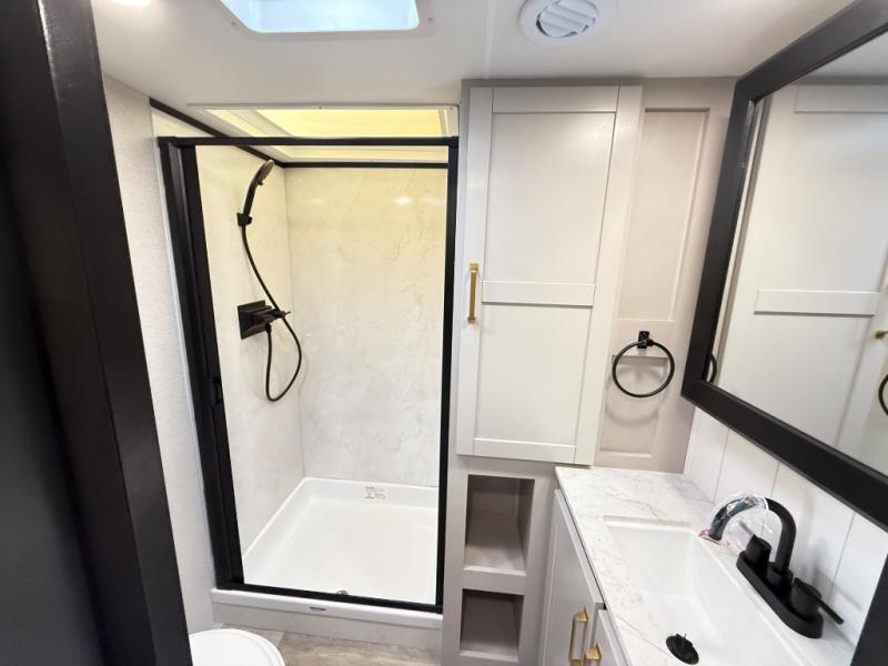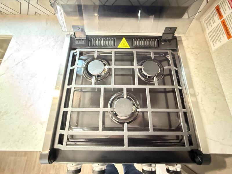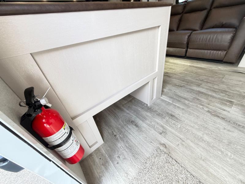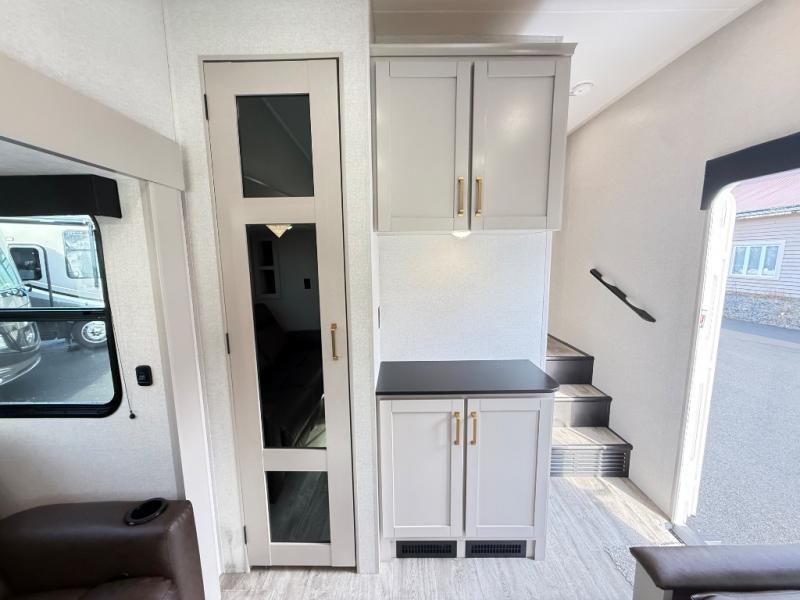 The fifth wheel you were waiting for! The spacious rear kitchen is equipped with a three-burner cooktop, microwave, booth dinette, 12V refrigerator, and sink, providing ample space for meal preparation. Overhead cabinets and a pantry provide ample storage for cookware, dishes, and other essential kitchen items. The living area features a trifold sofa, perfect for relaxation and entertainment. The full bathroom’s thoughtful design ensures that everyone has their own space, and the front bedroom is a retreat from the world, featuring a plush queen bed, a spacious wardrobe, and a closet.