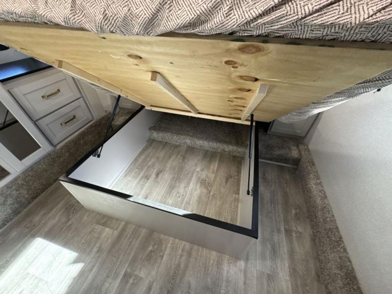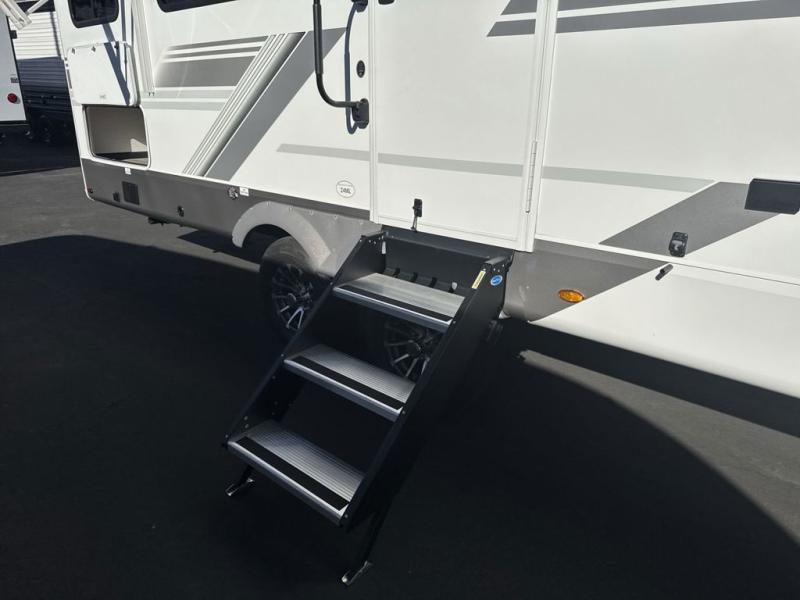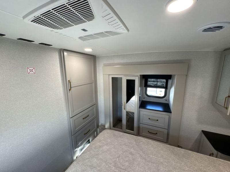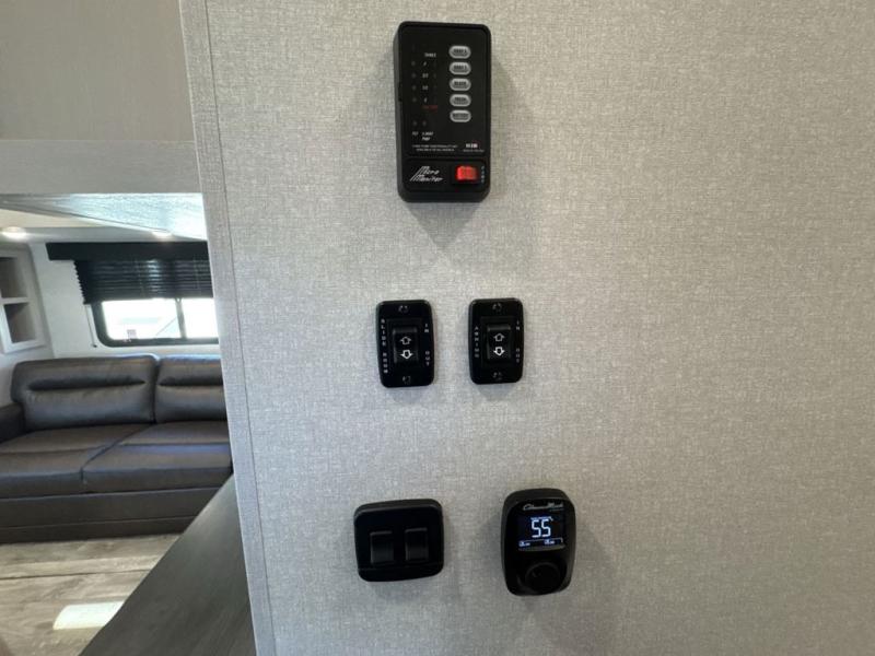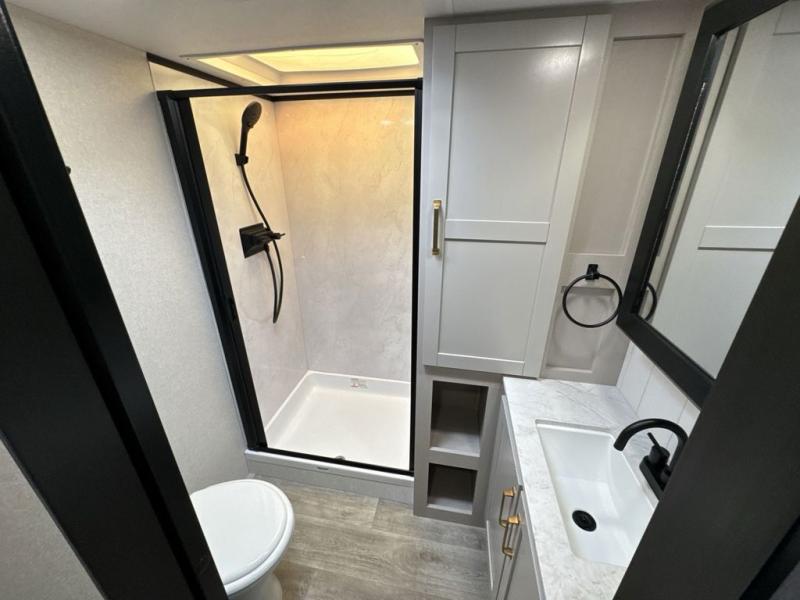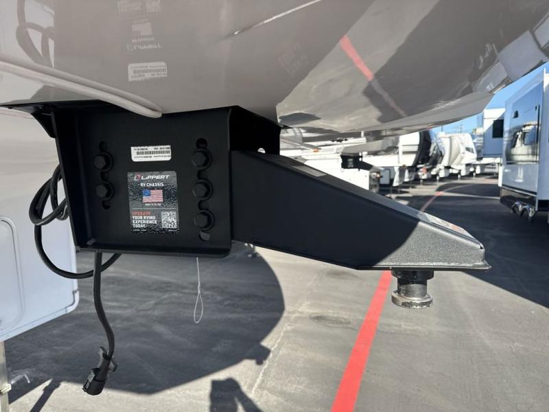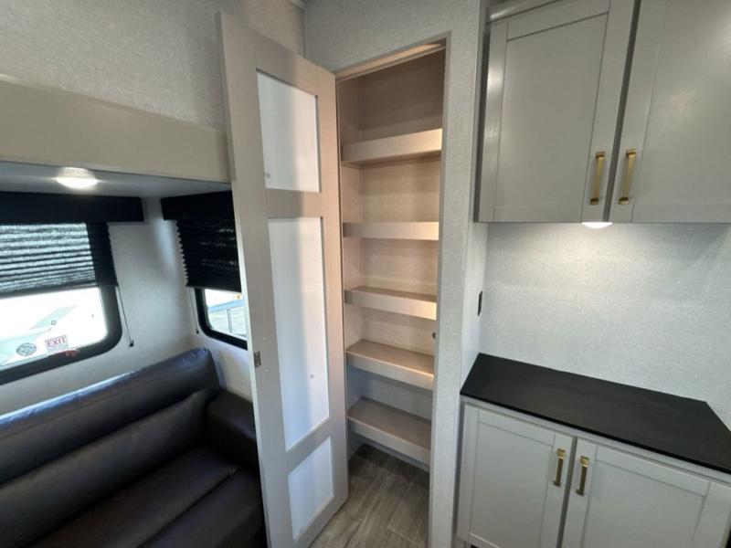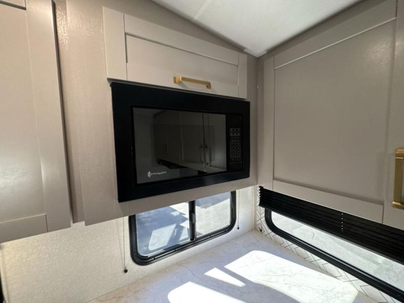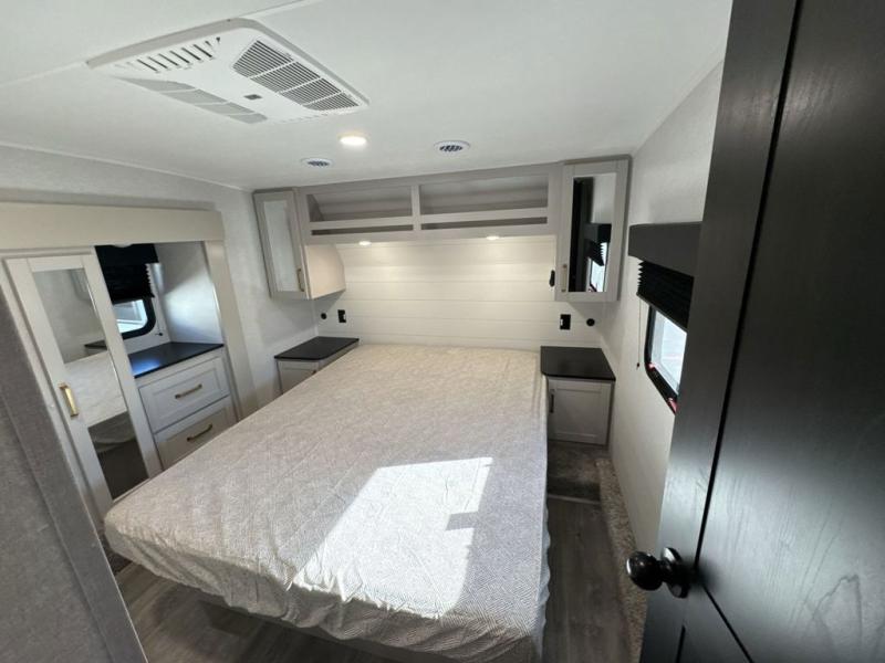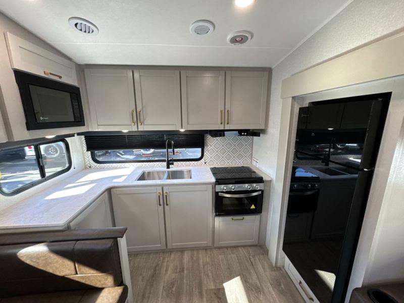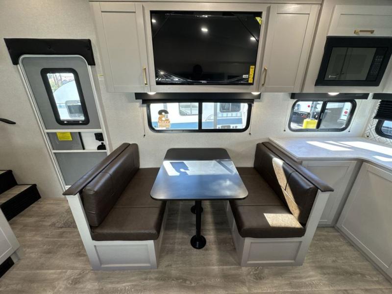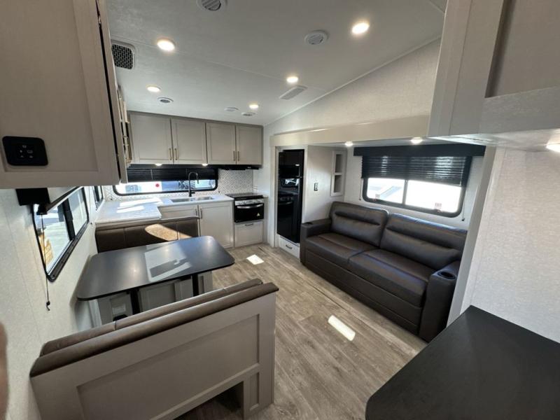 The fifth wheel you were waiting for! The spacious rear kitchen is equipped with a three-burner cooktop, microwave, booth dinette, 12V refrigerator, and sink, providing ample space for meal preparation. Overhead cabinets and a pantry provide ample storage for cookware, dishes, and other essential kitchen items. The living area features a trifold sofa, perfect for relaxation and entertainment. The full bathroom’s thoughtful design ensures that everyone has their own space, and the front bedroom is a retreat from the world, featuring a plush queen bed, a spacious wardrobe, and a closet.