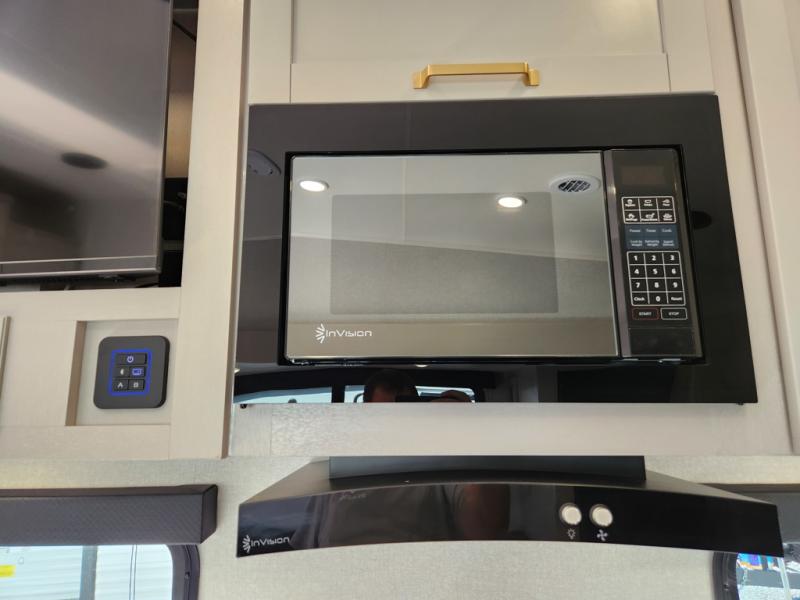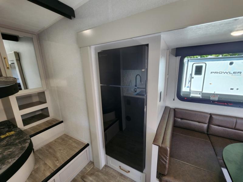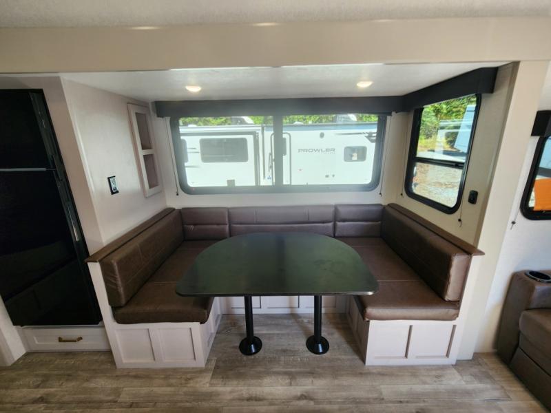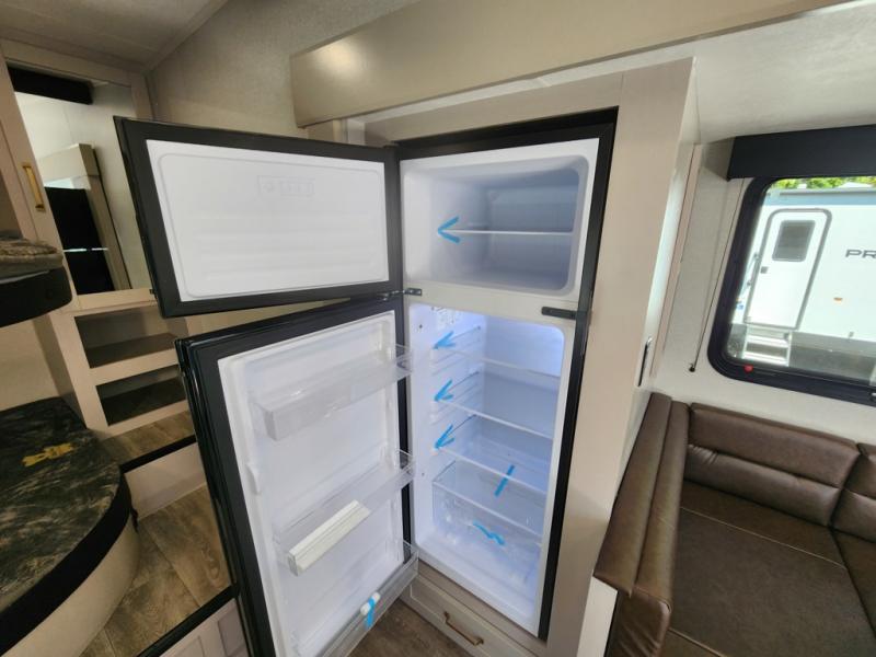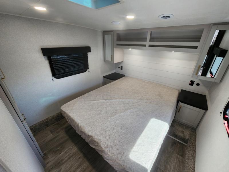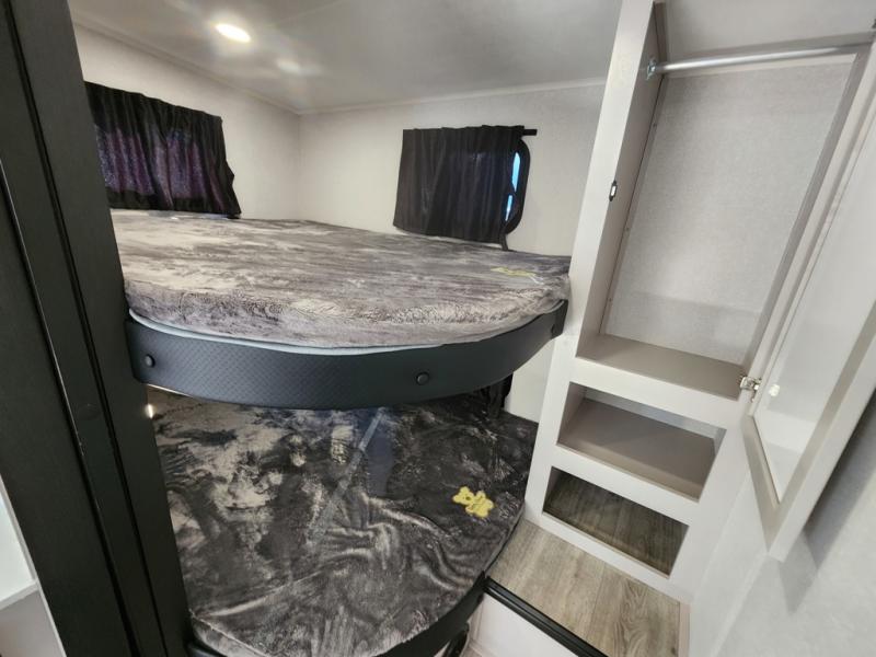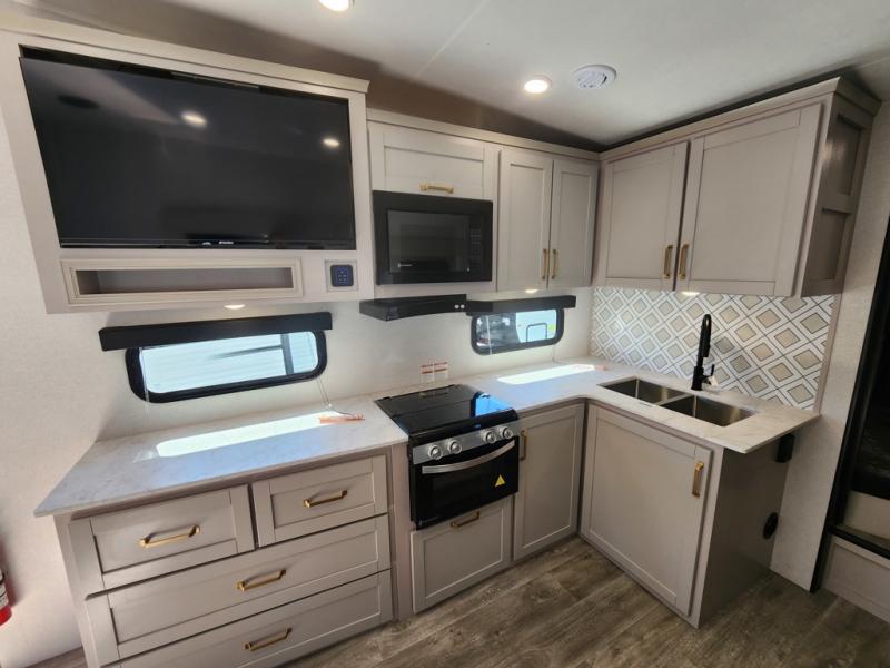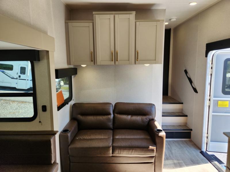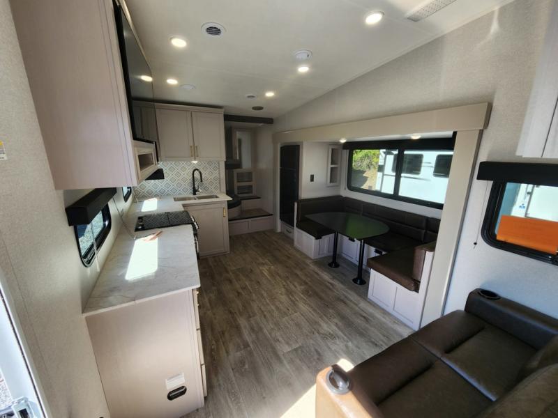 This fifth wheel's spacious interior boasts double-sized bunk beds designed for kids or guests, providing a comfortable sleeping space. A U-shaped dinette that offers ample seating and dining space for meals or even more sleeping space, as well as the 60” tri-fold sofa, which provides additional seating and can be converted into a comfortable sleeping area. In the kitchen area, you will find many amenities to cook delicious meals, such as a microwave, refrigerator, and overhead cabinets that will allow you to keep everything organized. The front bed is spacious, featuring a queen bed ideal for sleeping tight, and the full bath will complete the at-home experience since you will be able to take a refreshing shower on hot days!