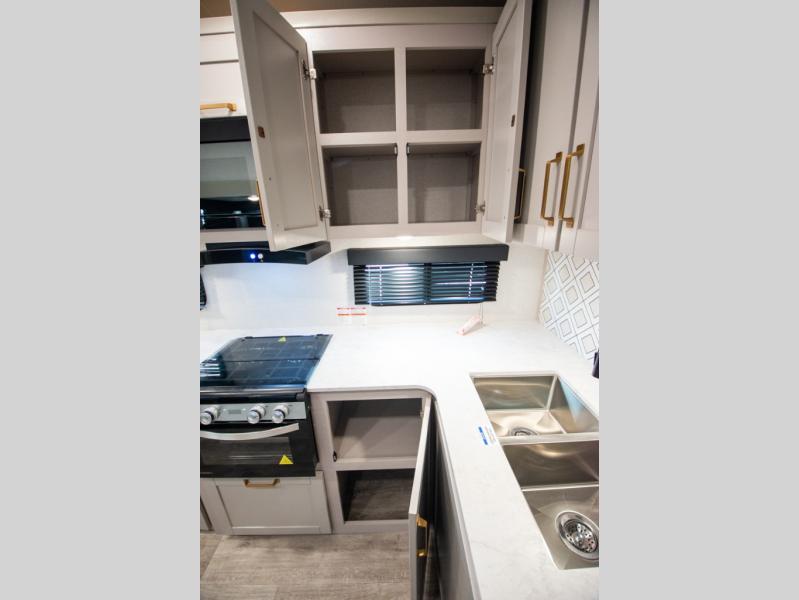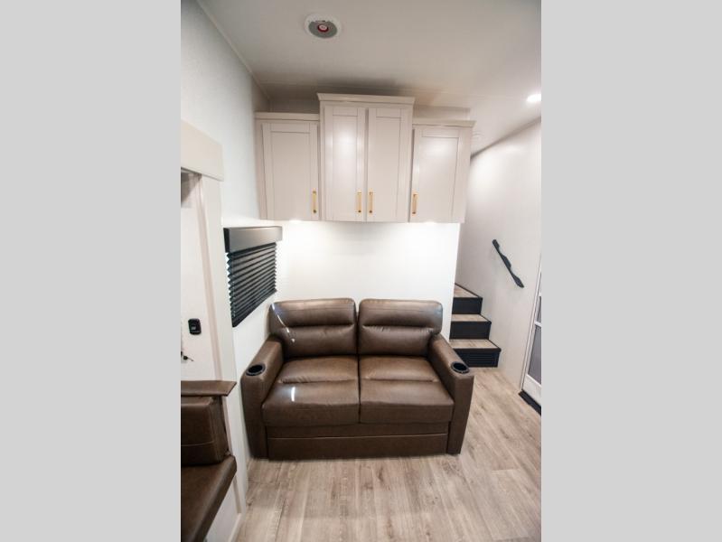 This fifth wheel's spacious interior boasts double-sized bunk beds designed for kids or guests, providing a comfortable sleeping space. A U-shaped dinette that offers ample seating and dining space for meals or even more sleeping space, as well as the 60” tri-fold sofa, which provides additional seating and can be converted into a comfortable sleeping area. In the kitchen area, you will find many amenities to cook delicious meals, such as a microwave, refrigerator, and overhead cabinets that will allow you to keep everything organized. The front bed is spacious, featuring a queen bed ideal for sleeping tight, and the full bath will complete the at-home experience since you will be able to take a refreshing shower on hot days!